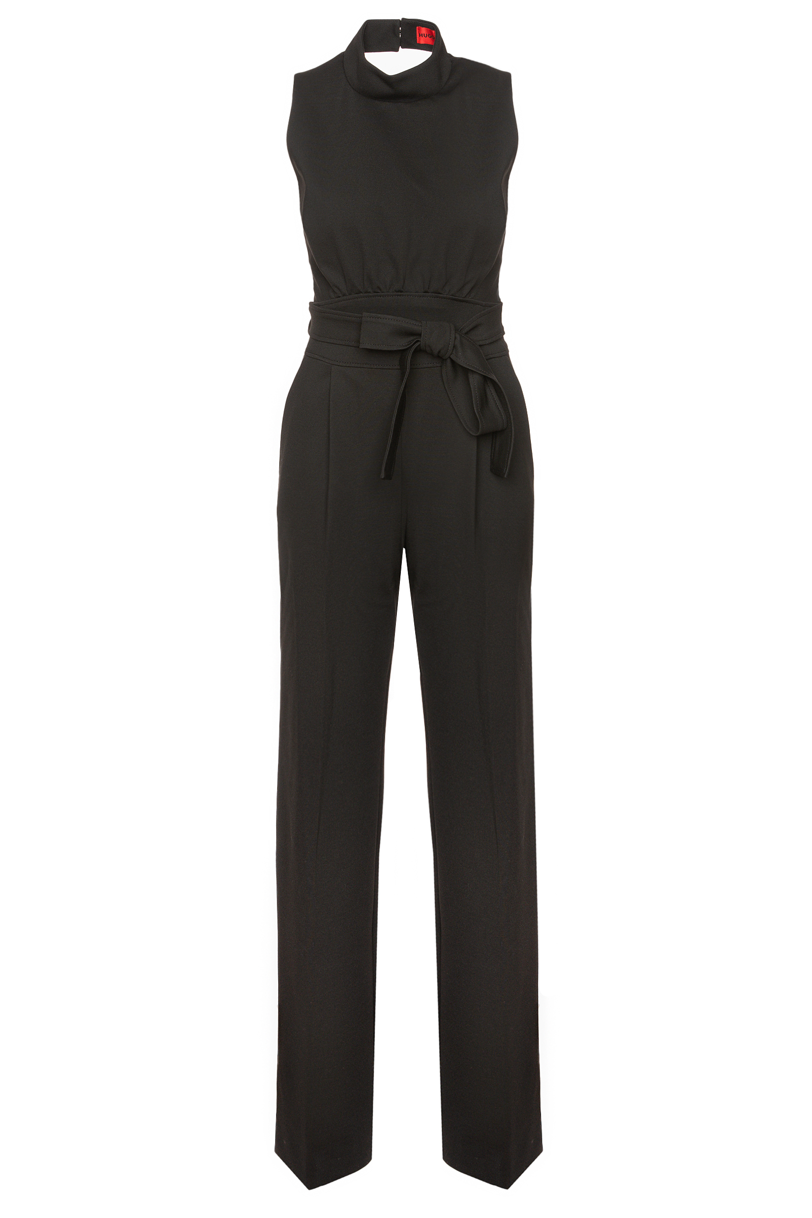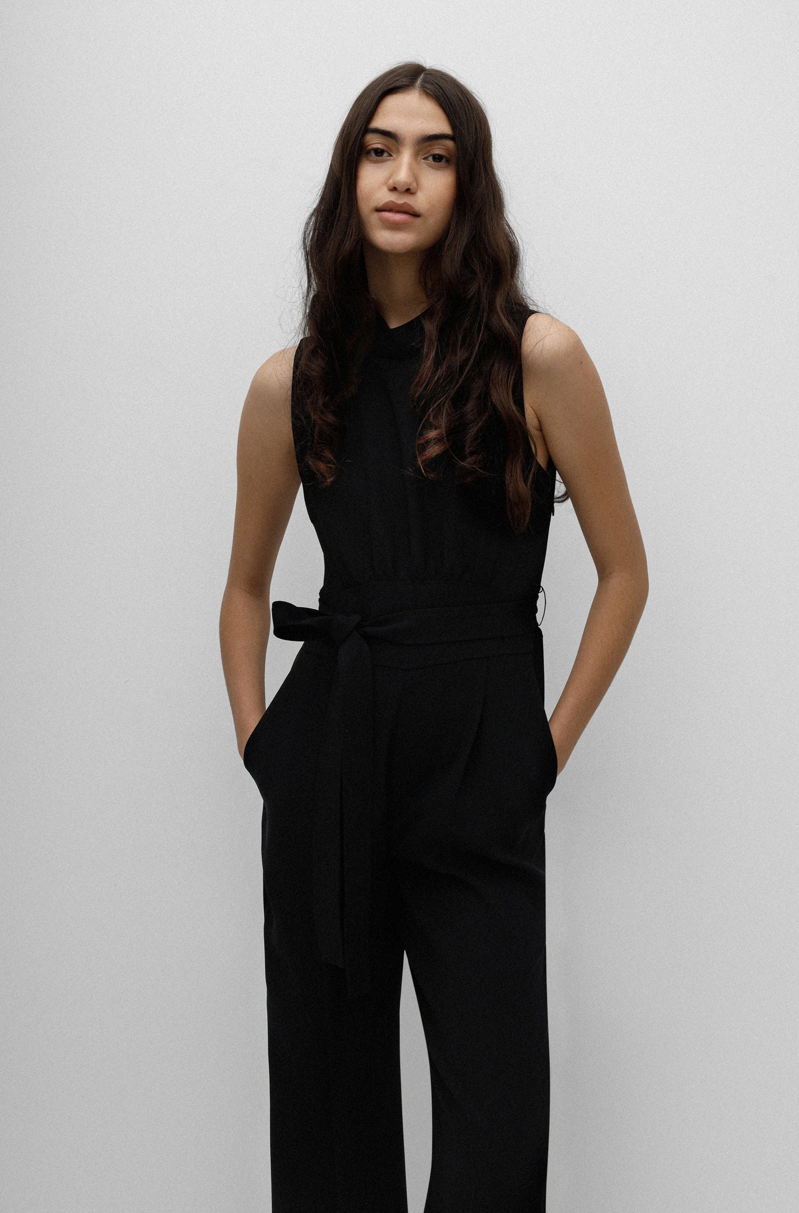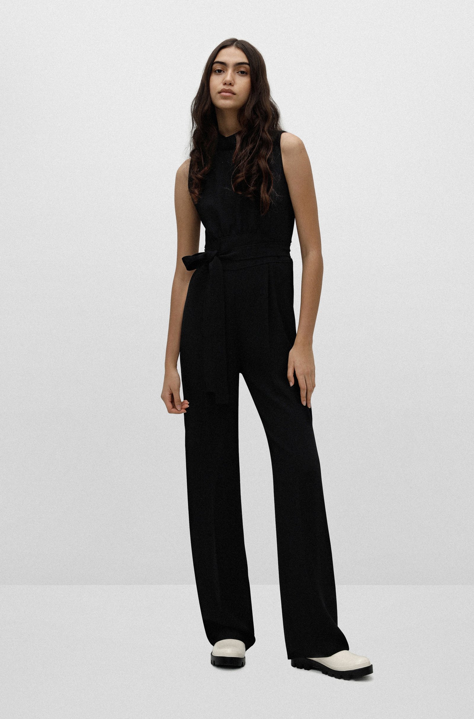 Eleganter HUGO Damen-Jumpsuit im ärmellosen Design. Der gerade geschnittene Damen-Jumpsuit ist aus einem fließenden Material gefertigt und mit einem Stehkragen versehen. Ein Bindegürtel an der gerafften Taille unterstreicht die Silhouette. Das geschmeidige Innenfutter rundet den Style für jede Tageszeit ab.