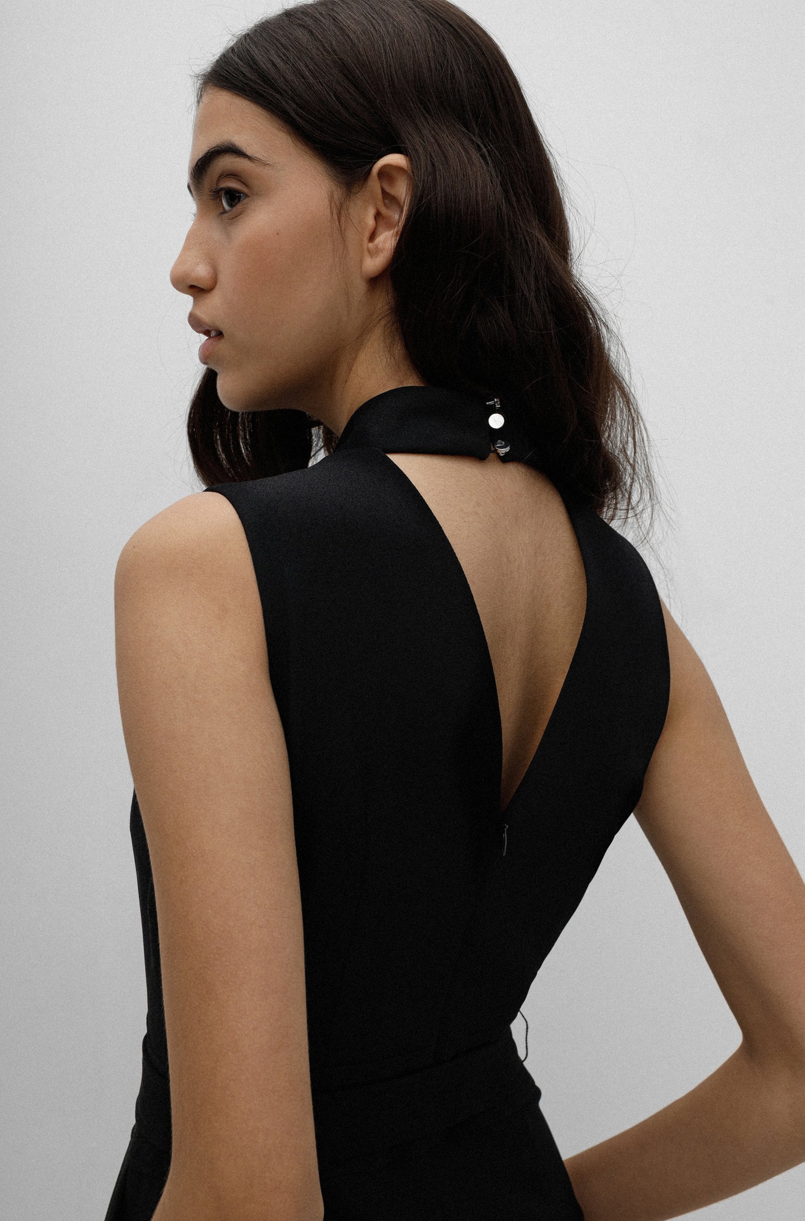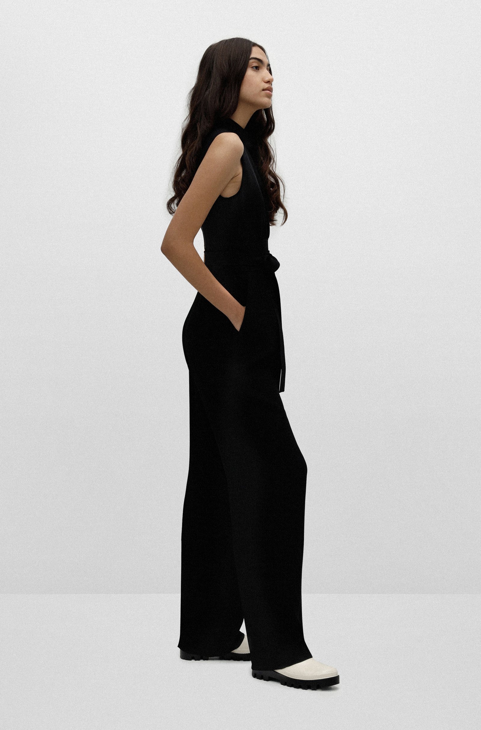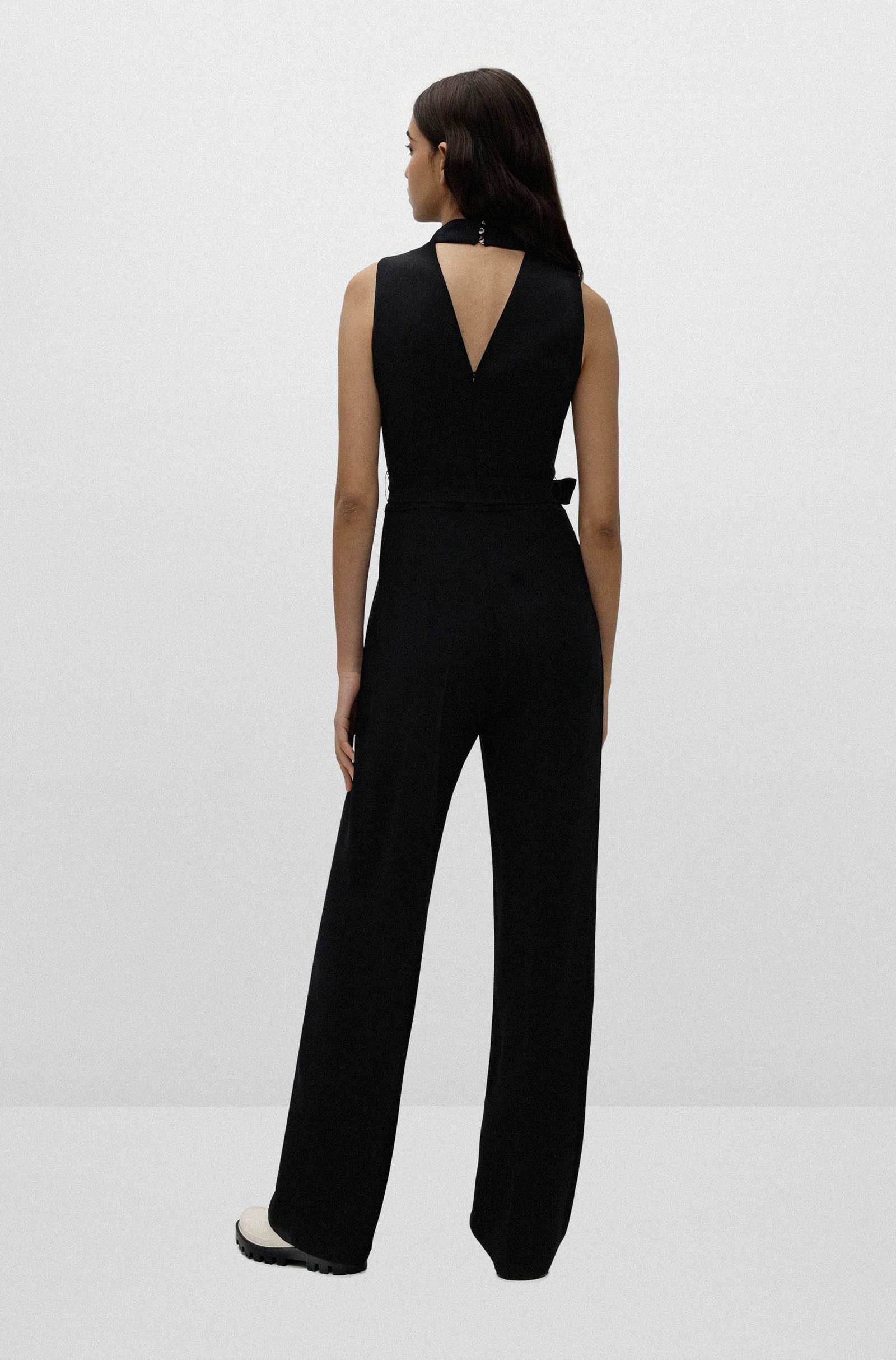 Eleganter HUGO Damen-Jumpsuit im ärmellosen Design. Der gerade geschnittene Damen-Jumpsuit ist aus einem fließenden Material gefertigt und mit einem Stehkragen versehen. Ein Bindegürtel an der gerafften Taille unterstreicht die Silhouette. Das geschmeidige Innenfutter rundet den Style für jede Tageszeit ab.