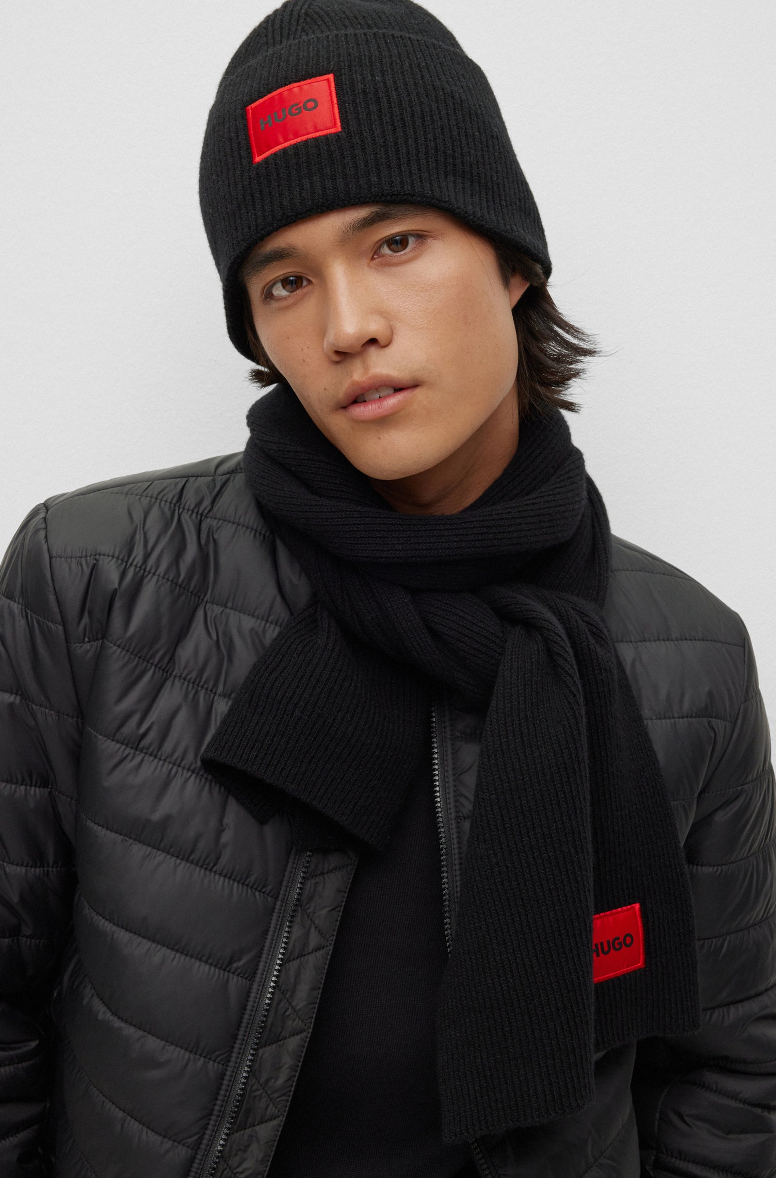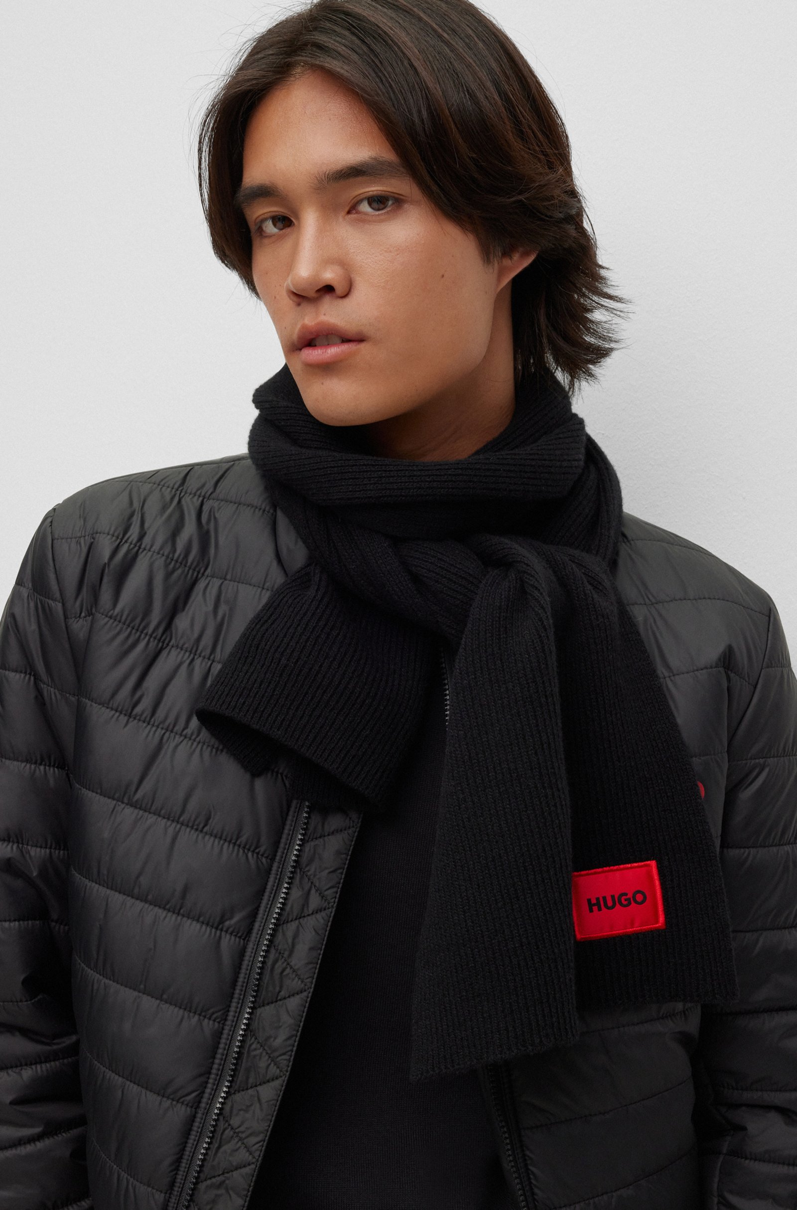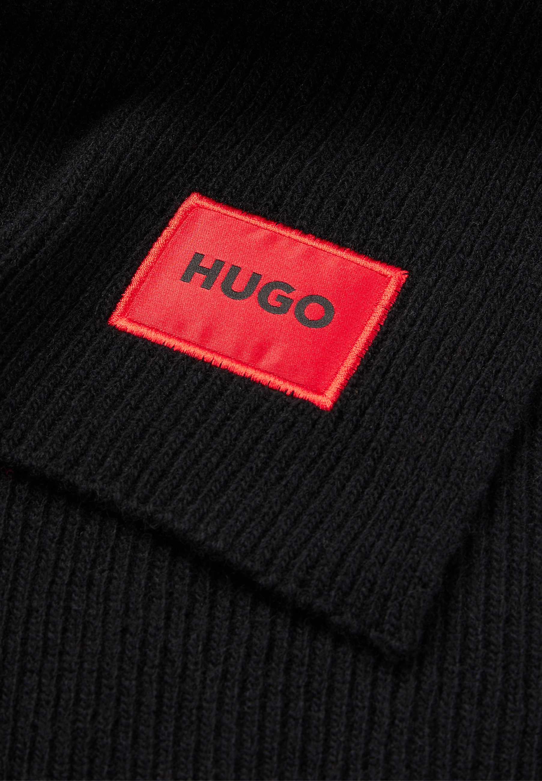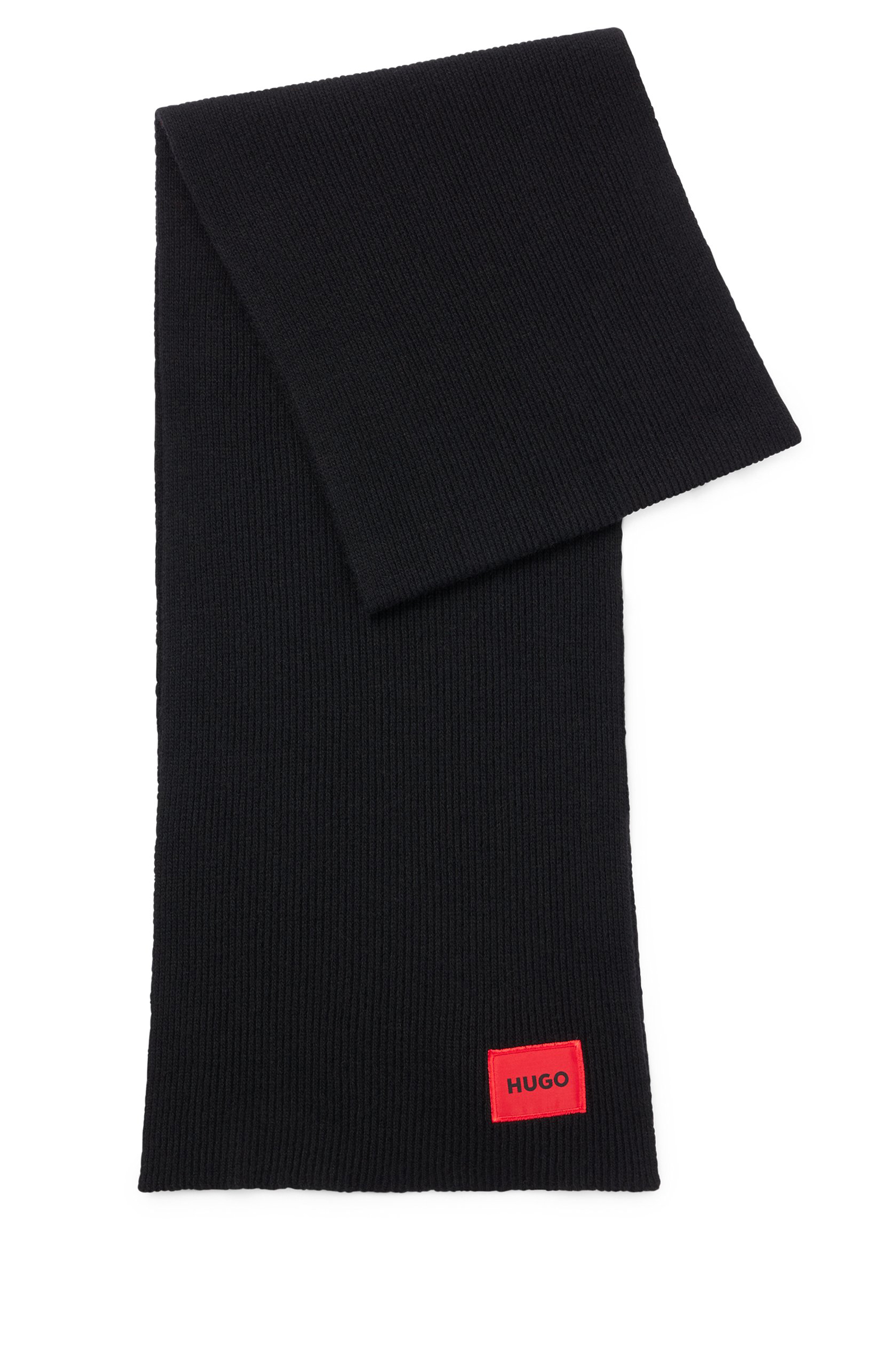 Minimalistischer HUGO Herren-Schal aus Rippstrick mit rotem Logo-Label.