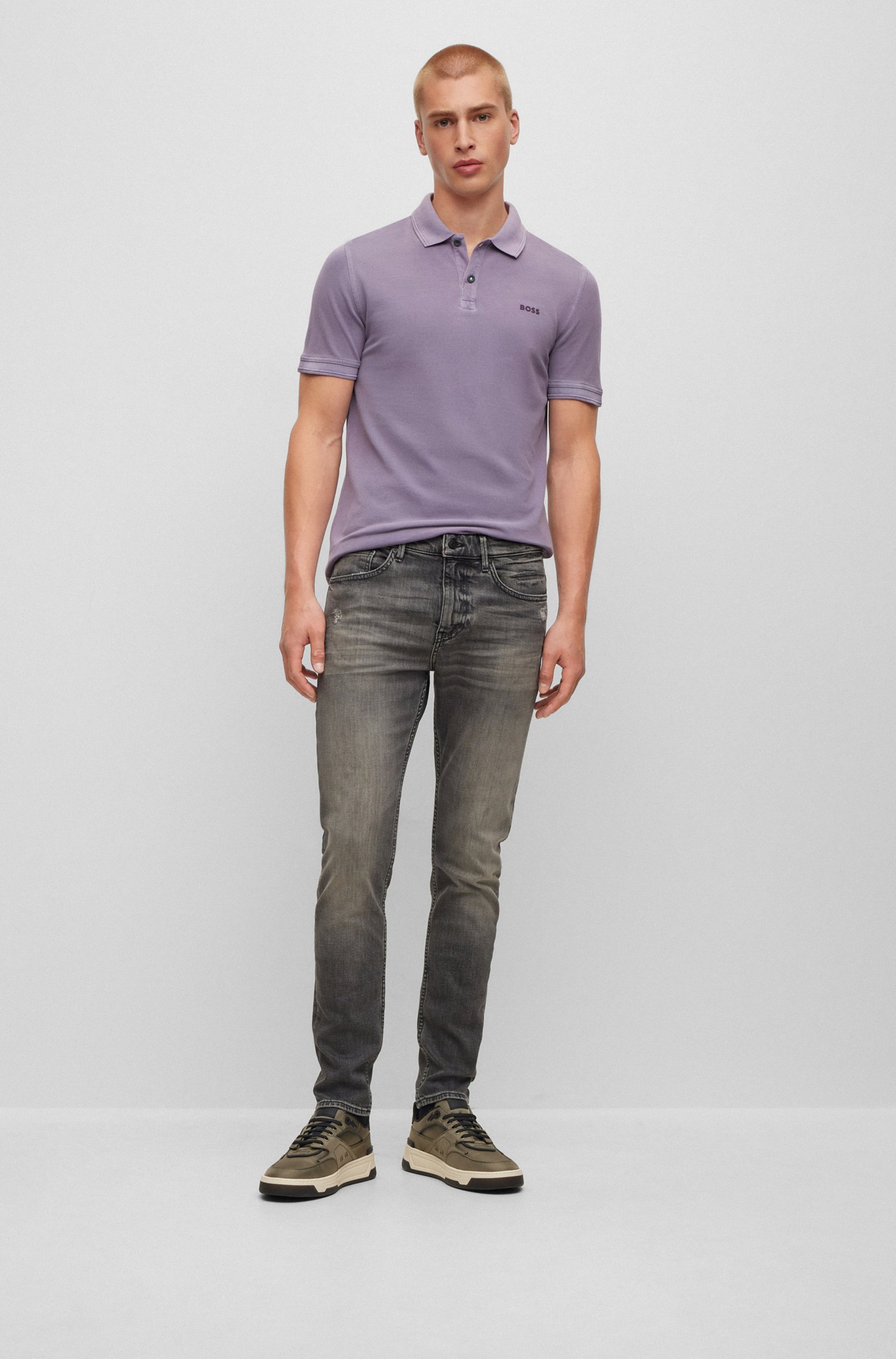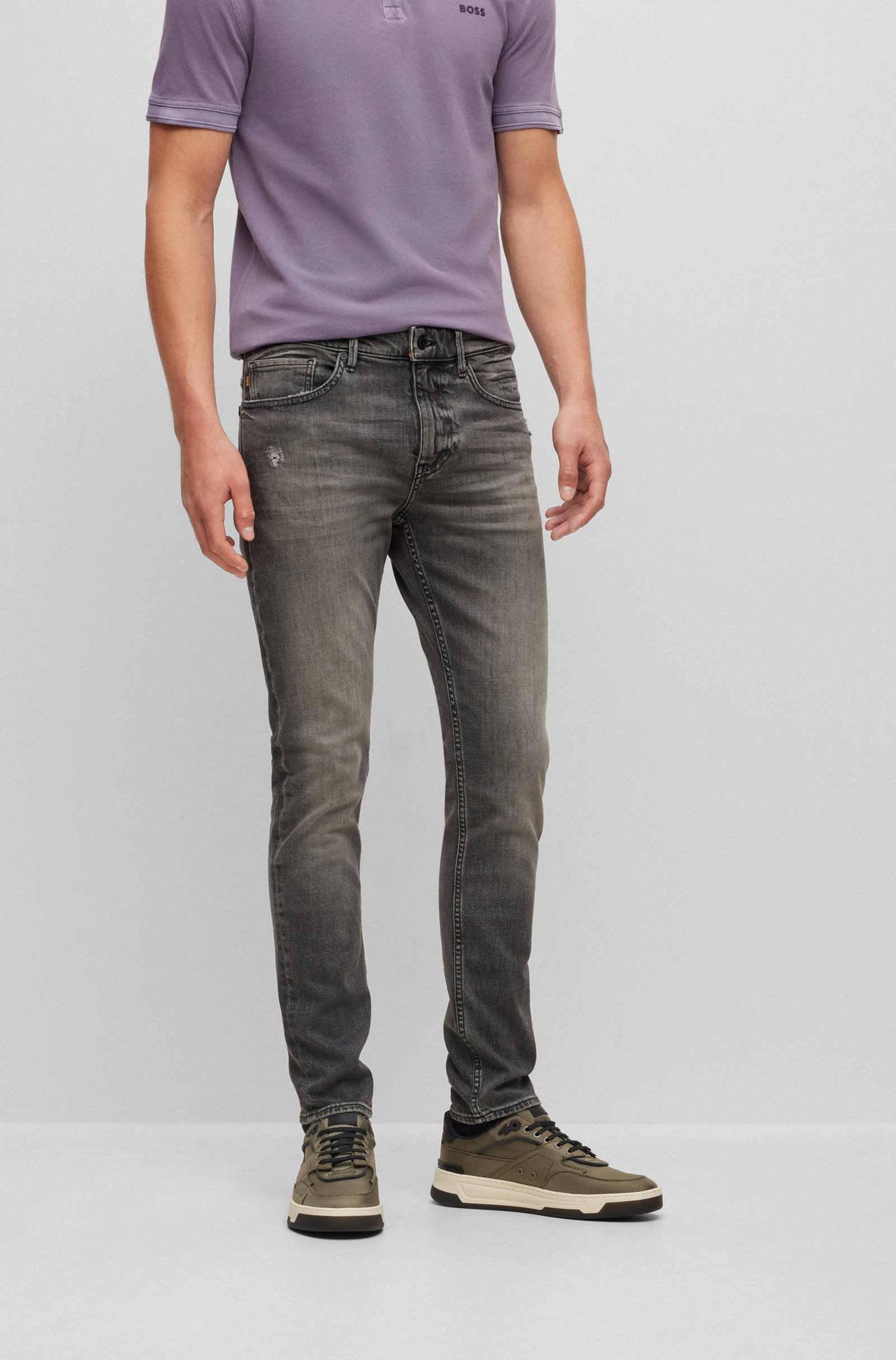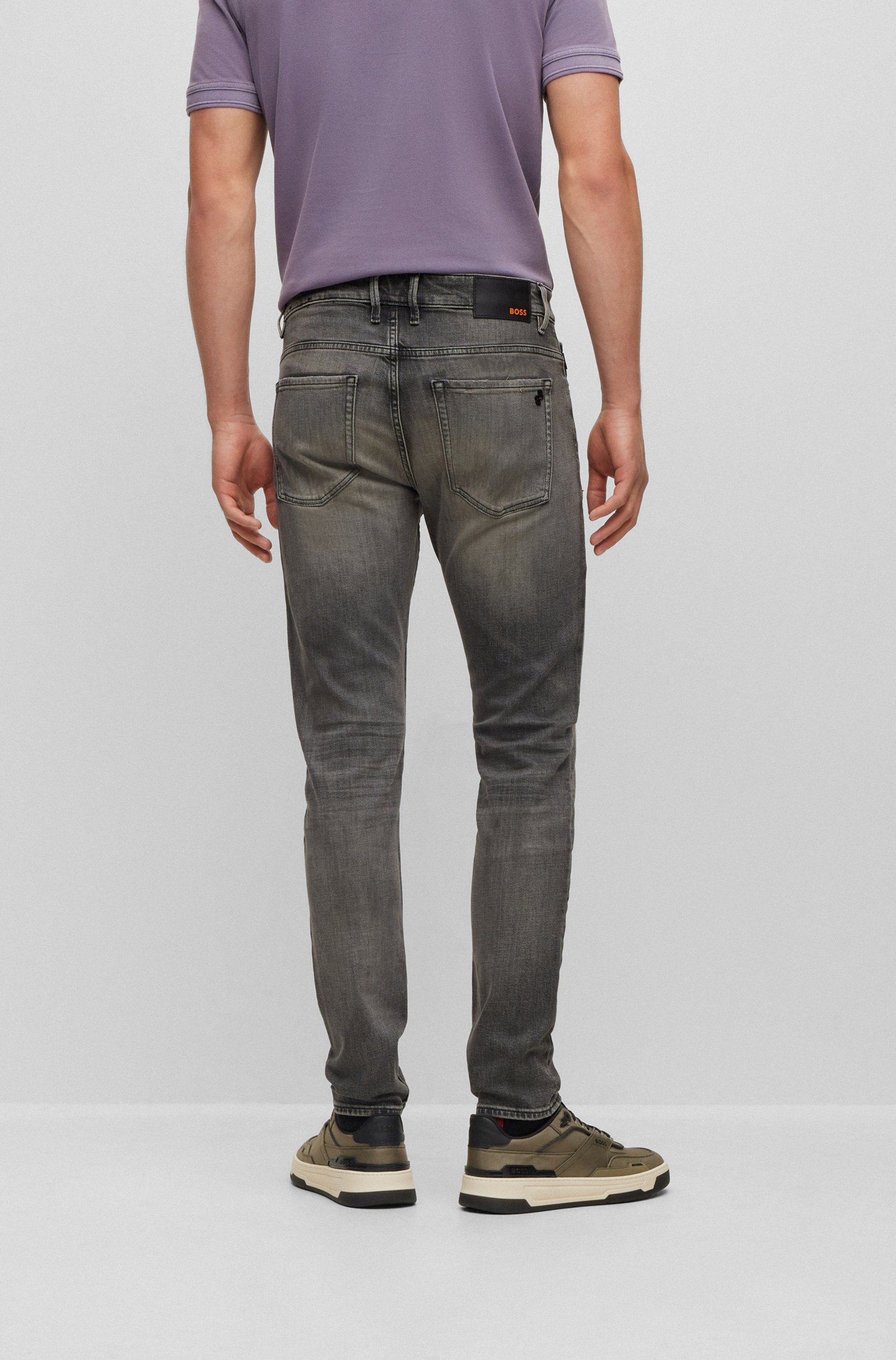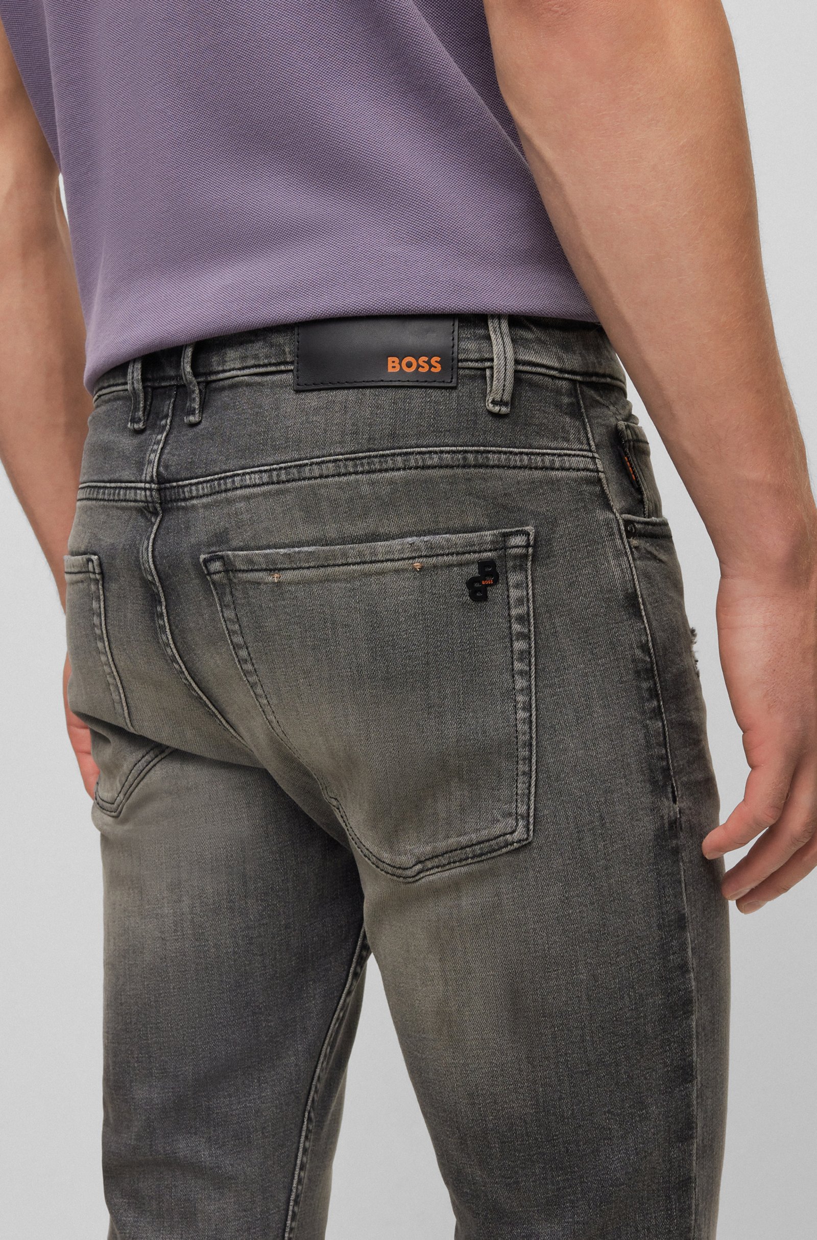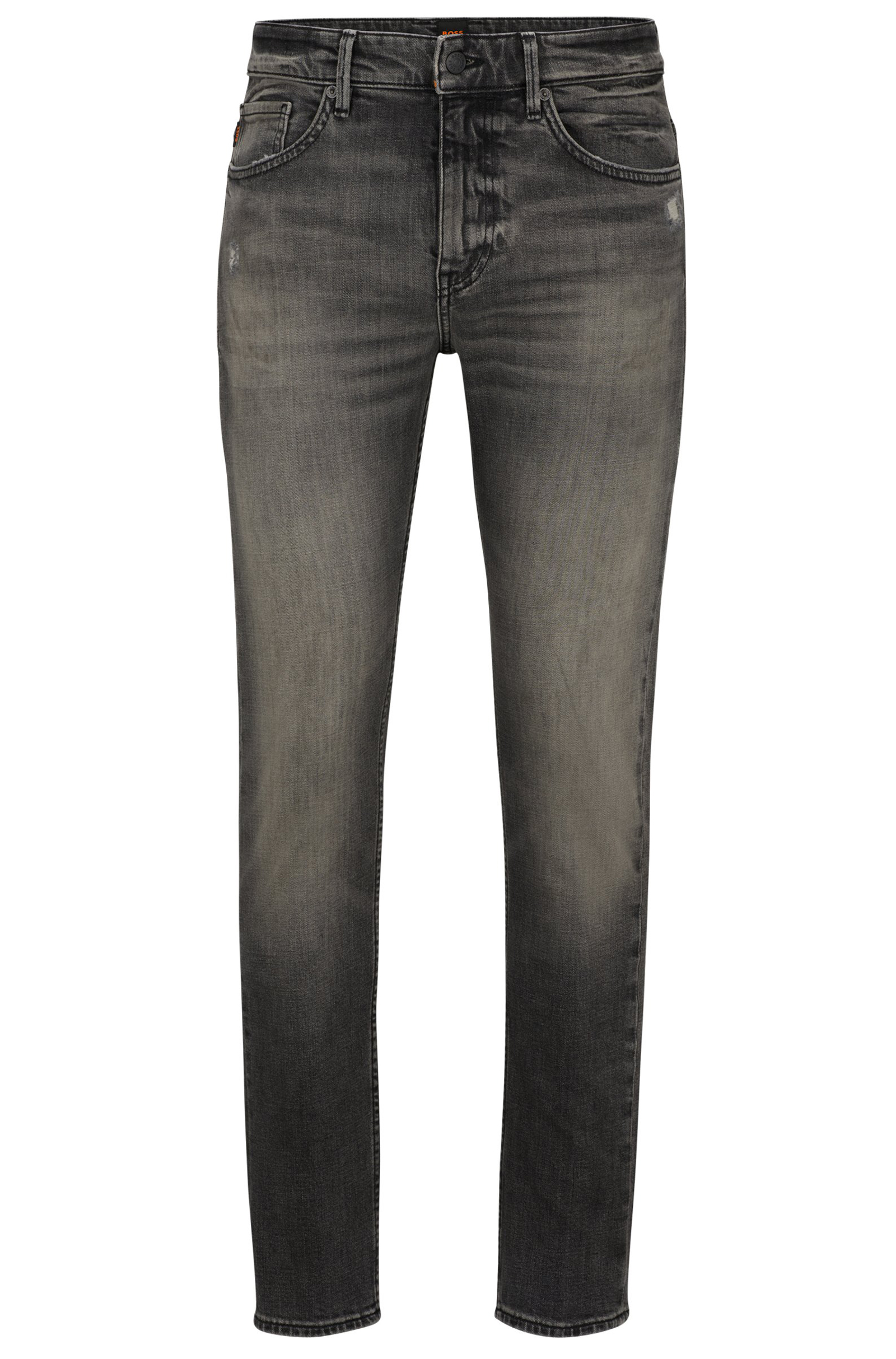 Schmal geschnittene BOSS Herren-Jeans mit mittlerer Bundhöhe und konischem Beinverlauf, die aus schwarzem Denim mit Beige-Stich in Vintage-Optik gefertigt ist.