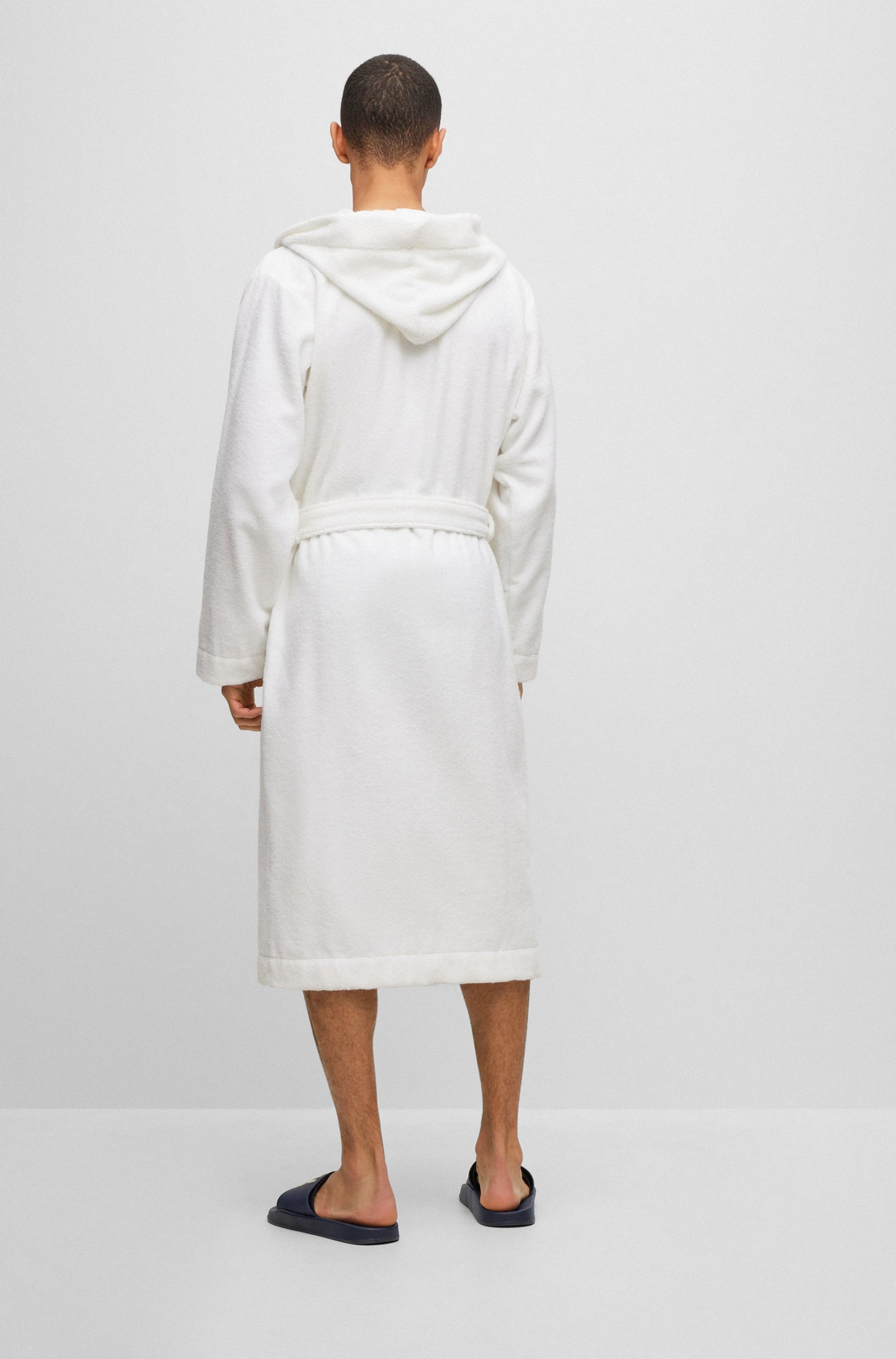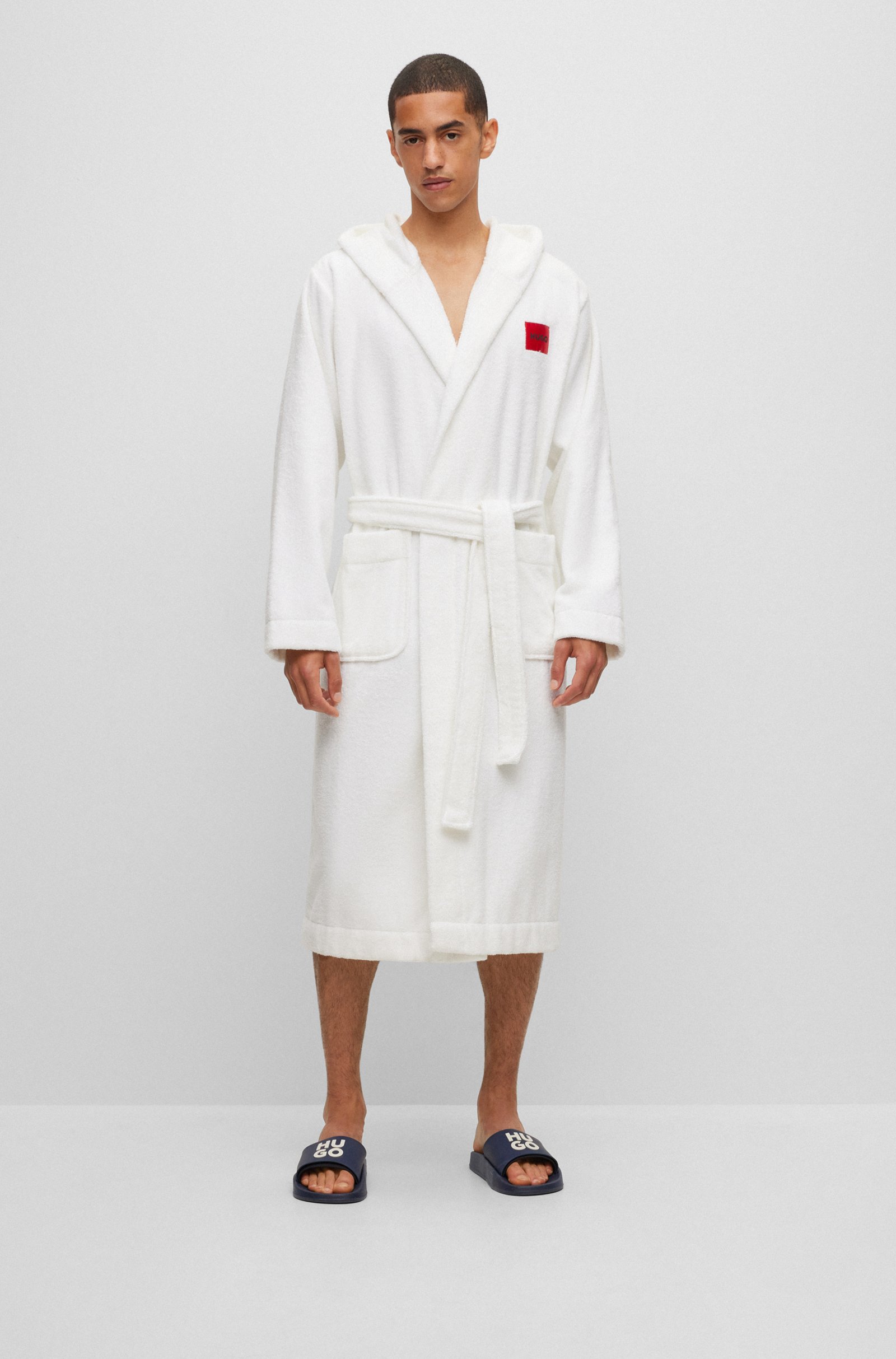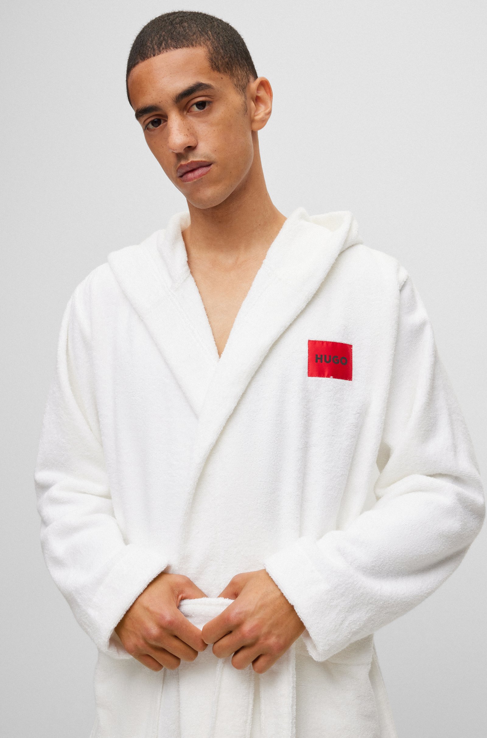 Besonders softer HUGO Morgenmantel aus Terry mit Kapuze, Gürtel, aufgesetzten Taschen und rotem Logo-Label.