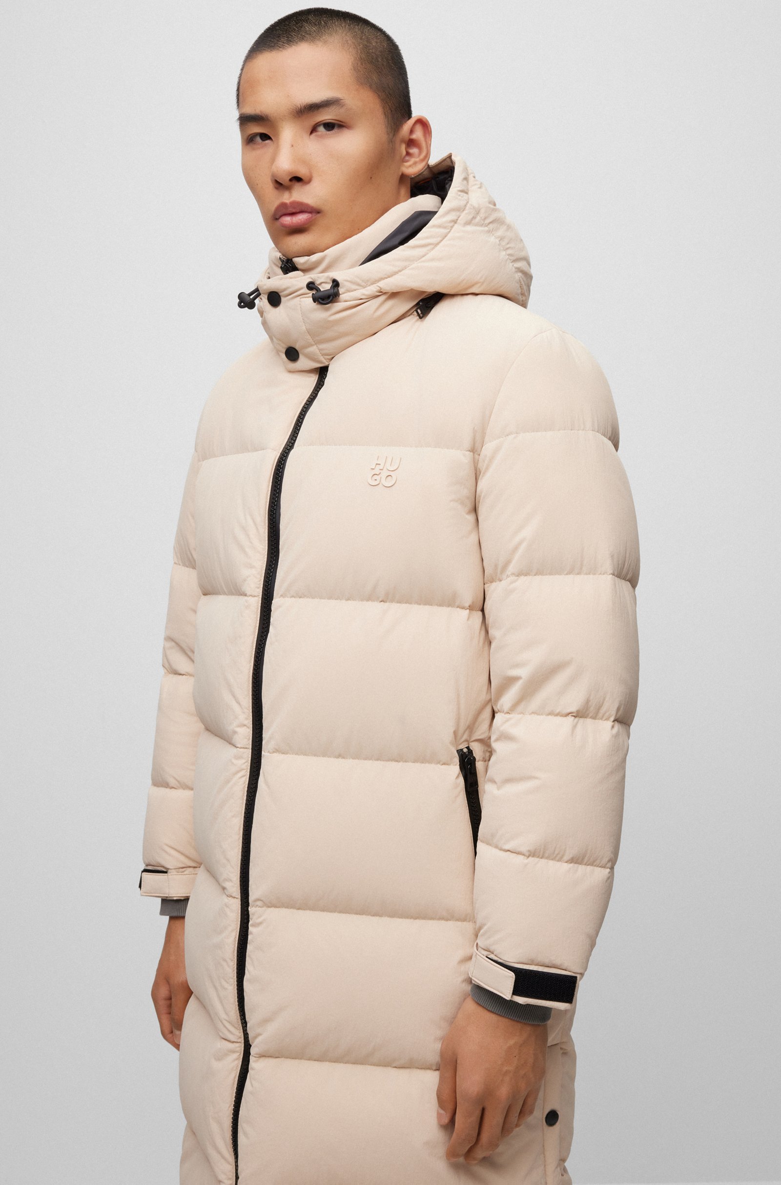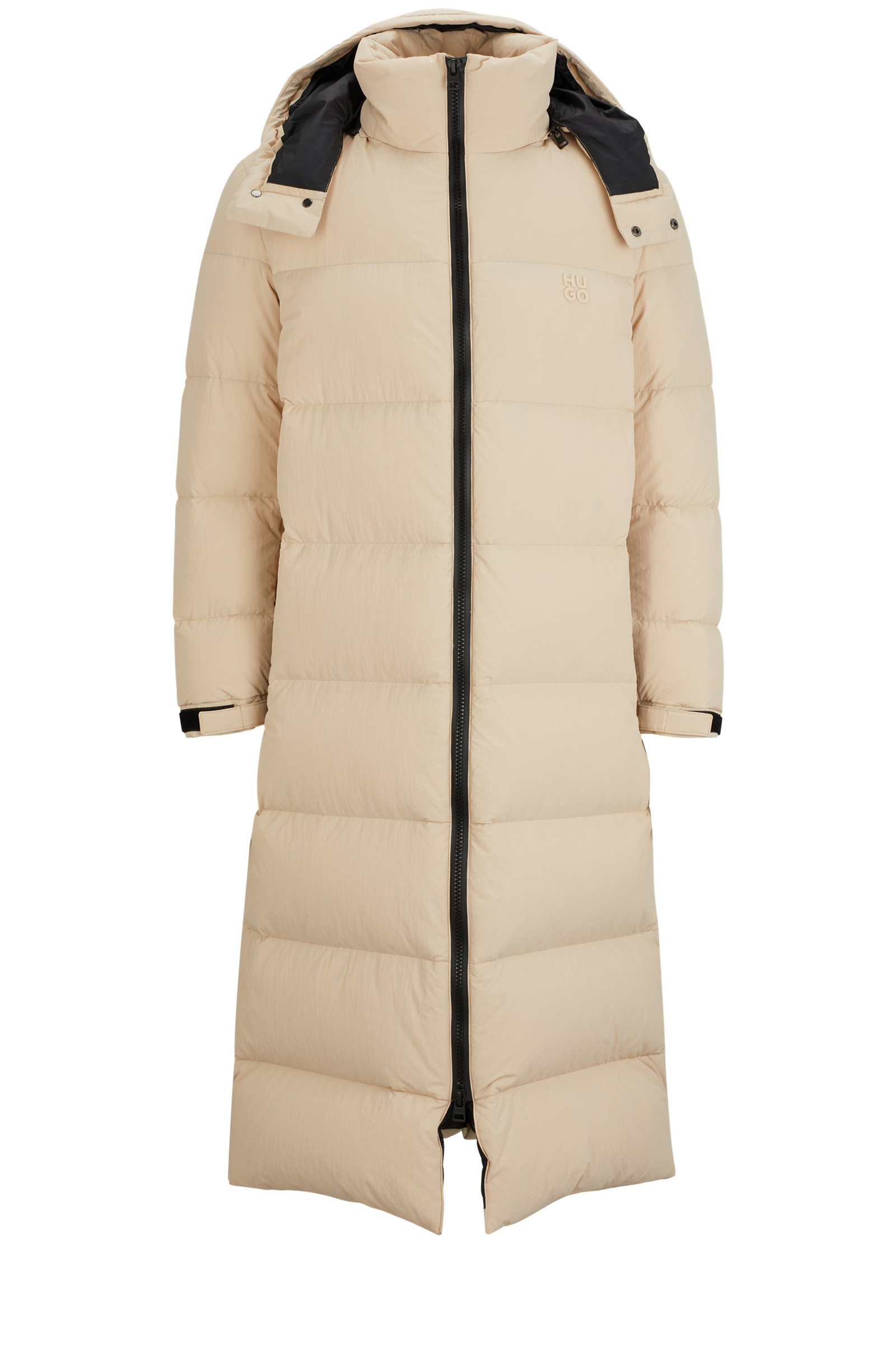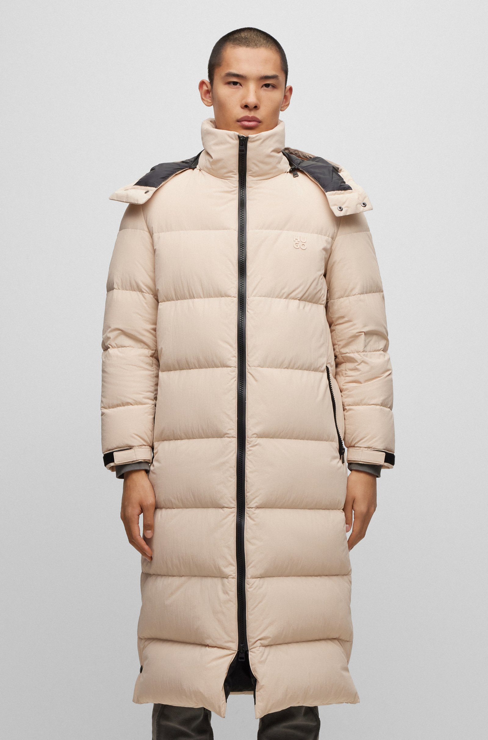Lang geschnittener HUGO Steppmantel mit gerader Passform, abnehmbarer Kapuze und wasserabweisendem Finish. Die Outerwear hat eine Füllung aus zertifizierten Entendaunen und -federn.
