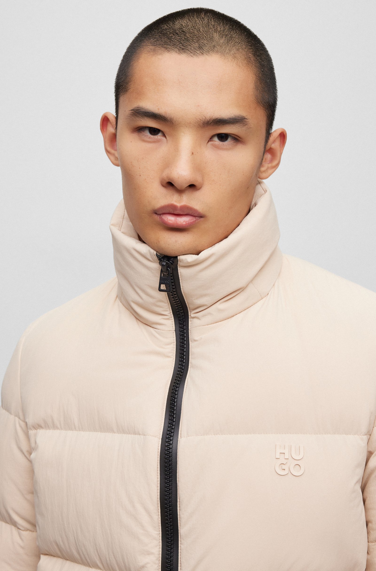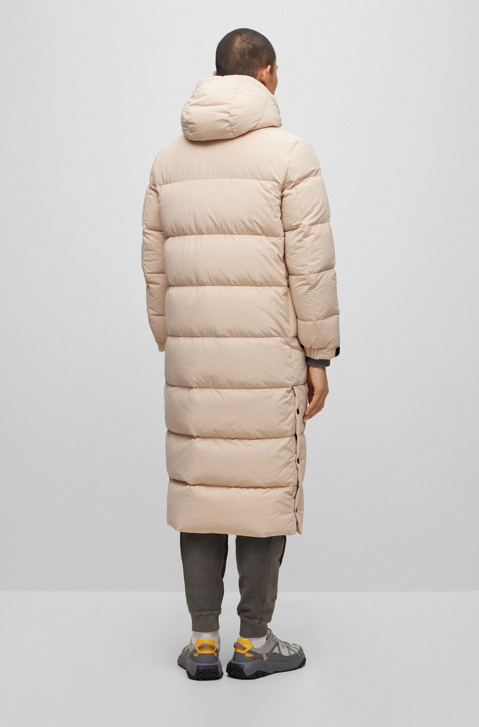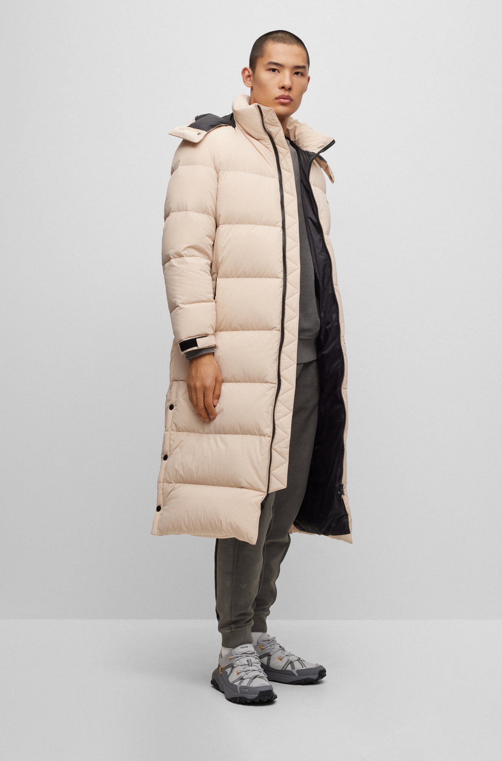 Lang geschnittener HUGO Steppmantel mit gerader Passform, abnehmbarer Kapuze und wasserabweisendem Finish. Die Outerwear hat eine Füllung aus zertifizierten Entendaunen und -federn.