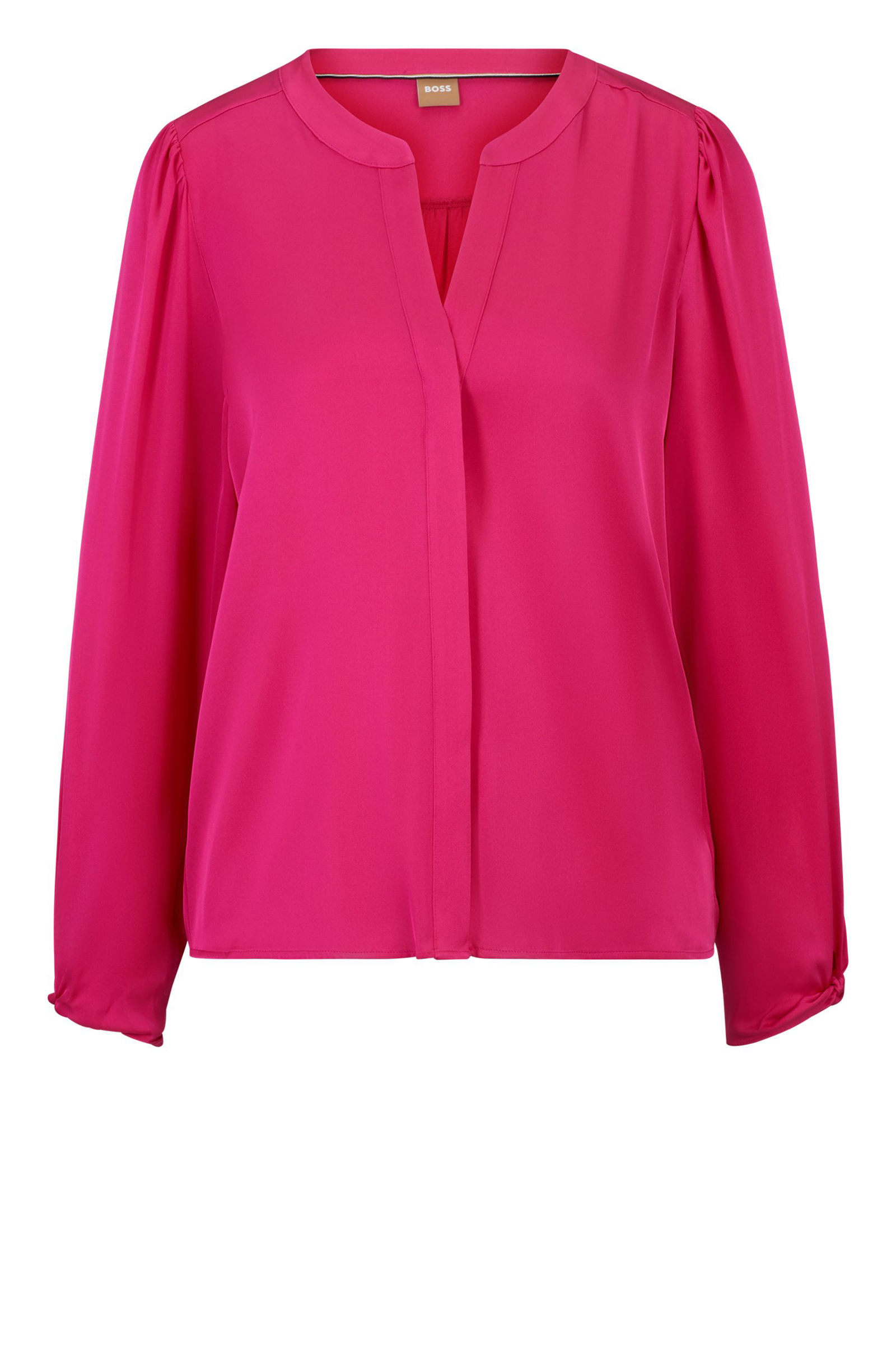 Kragenlose BOSS Damen-Bluse aus elastischer Seide mit lockerer Passform und verdeckter Knopfleiste.