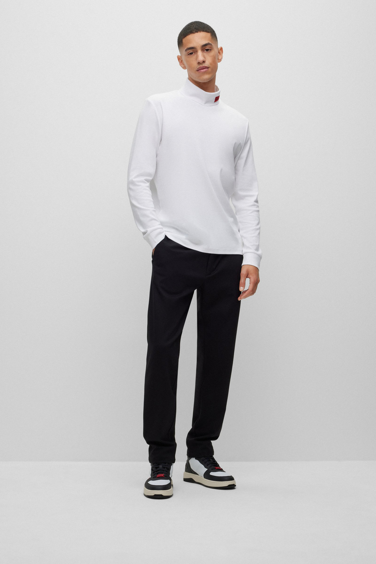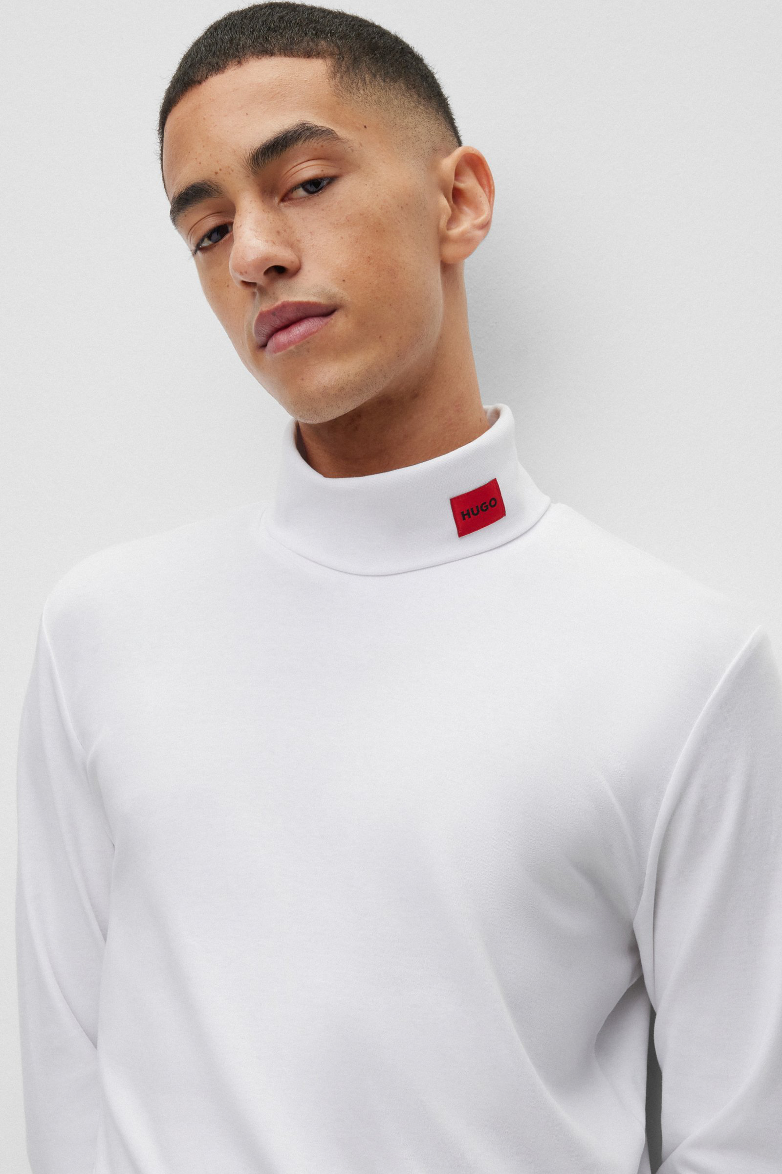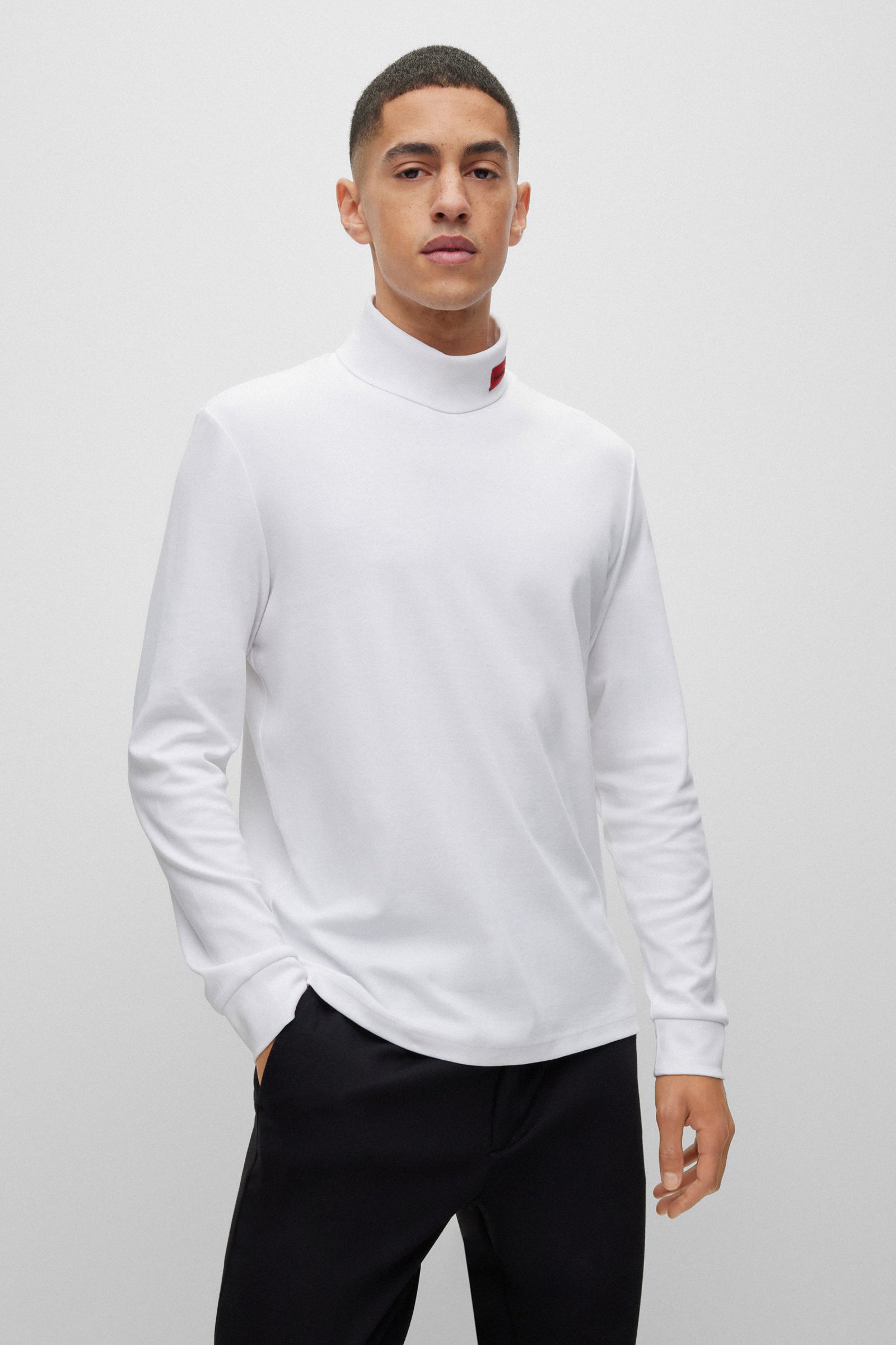 Charakteristisches HUGO Herren-Longsleeve. Das schmal geschnittene Shirt aus elastischer Baumwolle verspricht optimale Bewegungsfreiheit. Ein hochgeschlossener Ausschnitt mit HUGO Logo-Label im charakteristischen Rot rundet das Design ab. Ein vielseitig kombinierbarer Style für deine Layering-Looks.