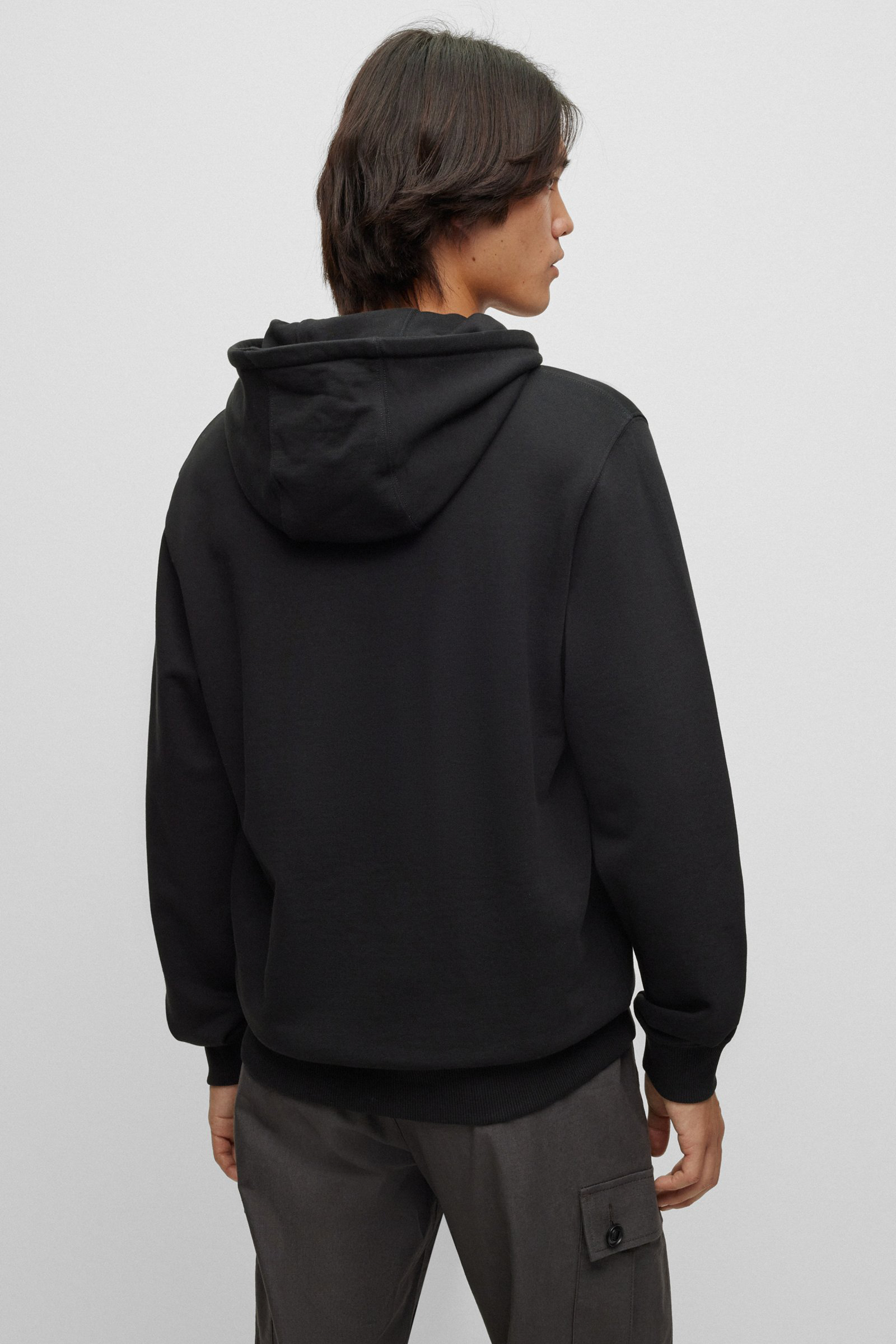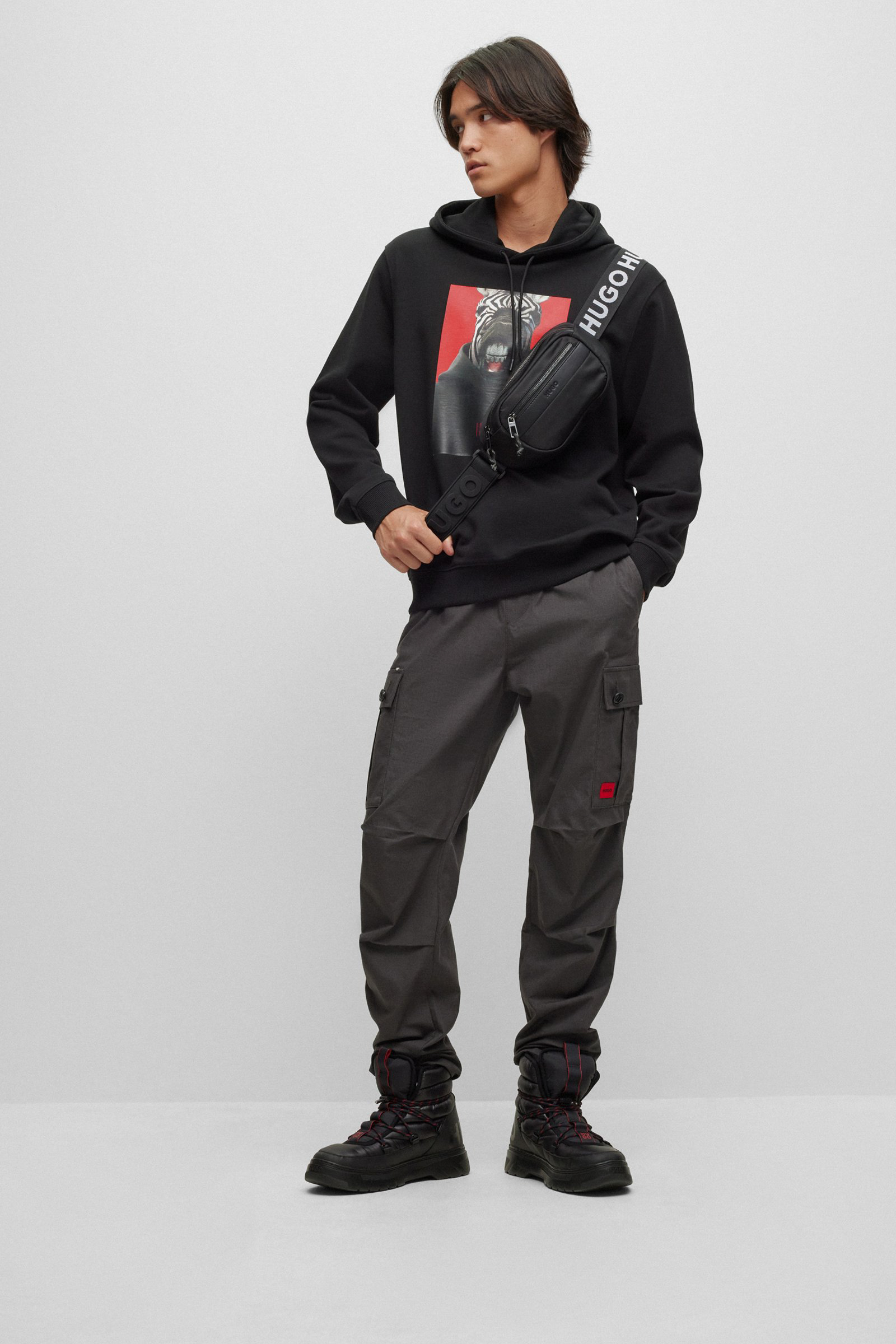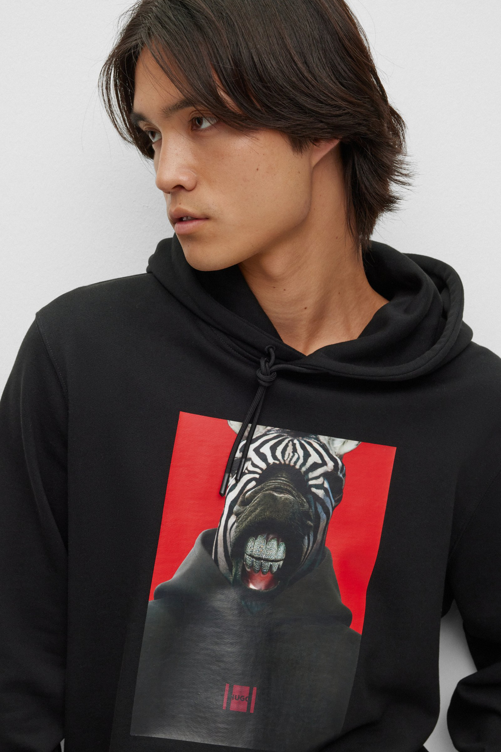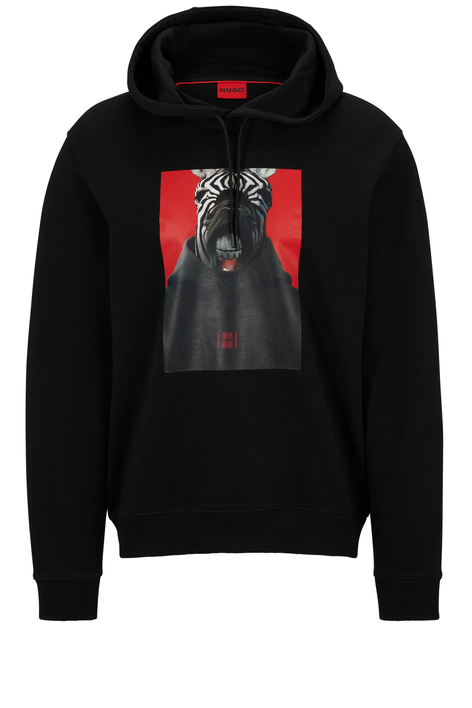 Locker geschnittenes HUGO Kapuzen-Sweatshirt aus French Terry mit kreativem Artwork und Logo vorn. Herren-Hoodie von HUGO Menswear