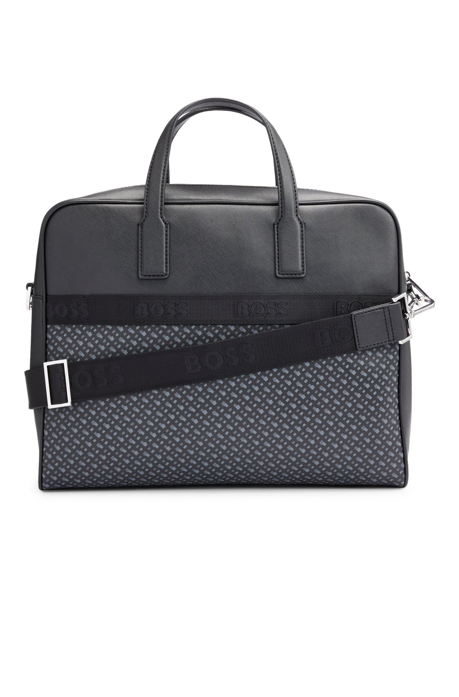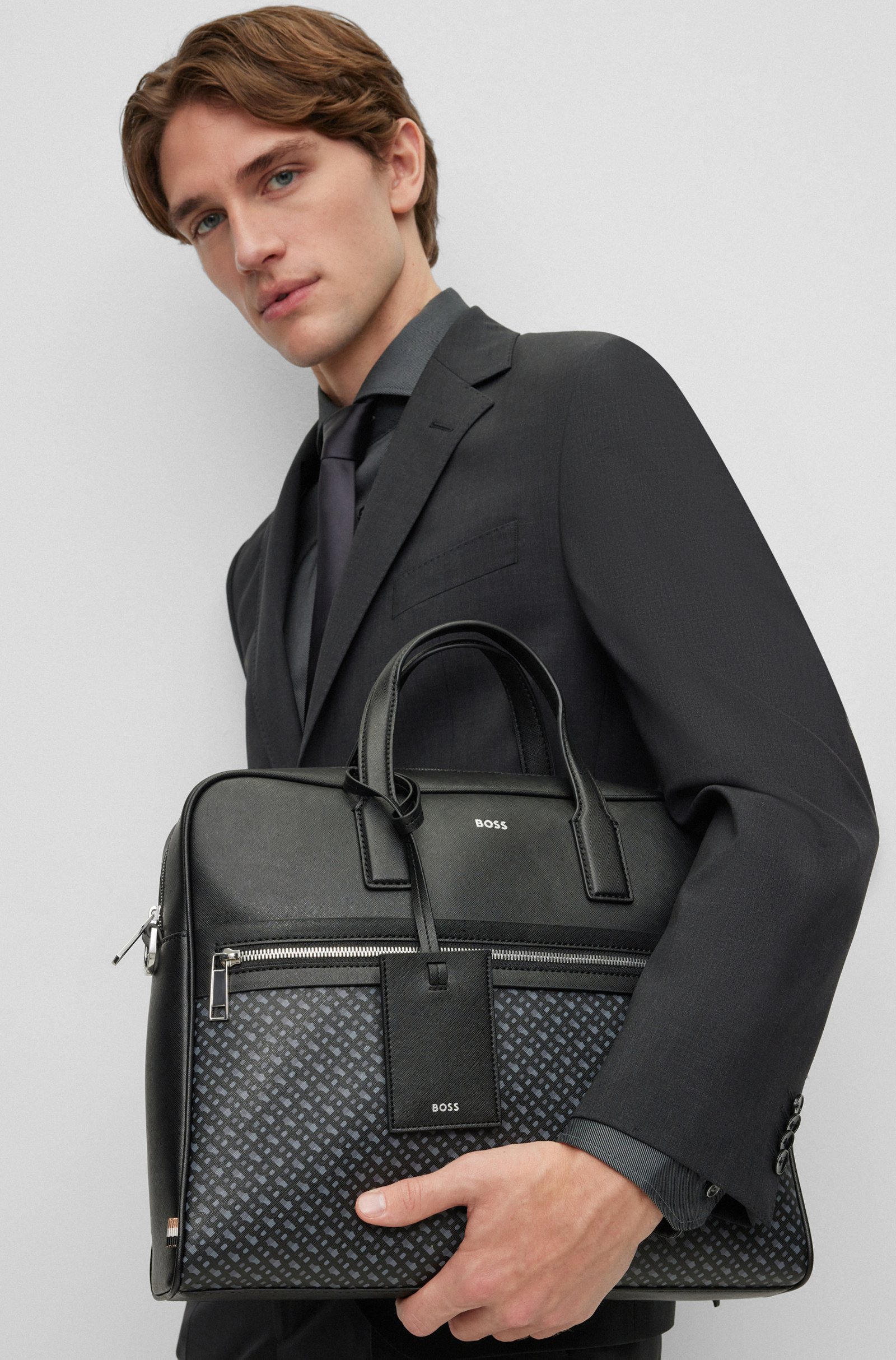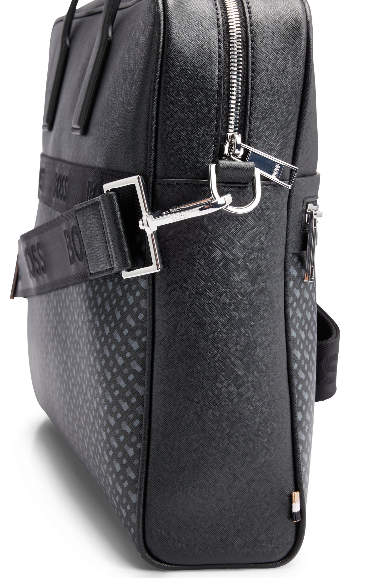 Strukturierte BOSS Herren-Aktentasche mit Logo-Schriftzug, abnehmbarem Schulterriemen, Smart Sleeve auf der Rückseite und Monogramm-Details.