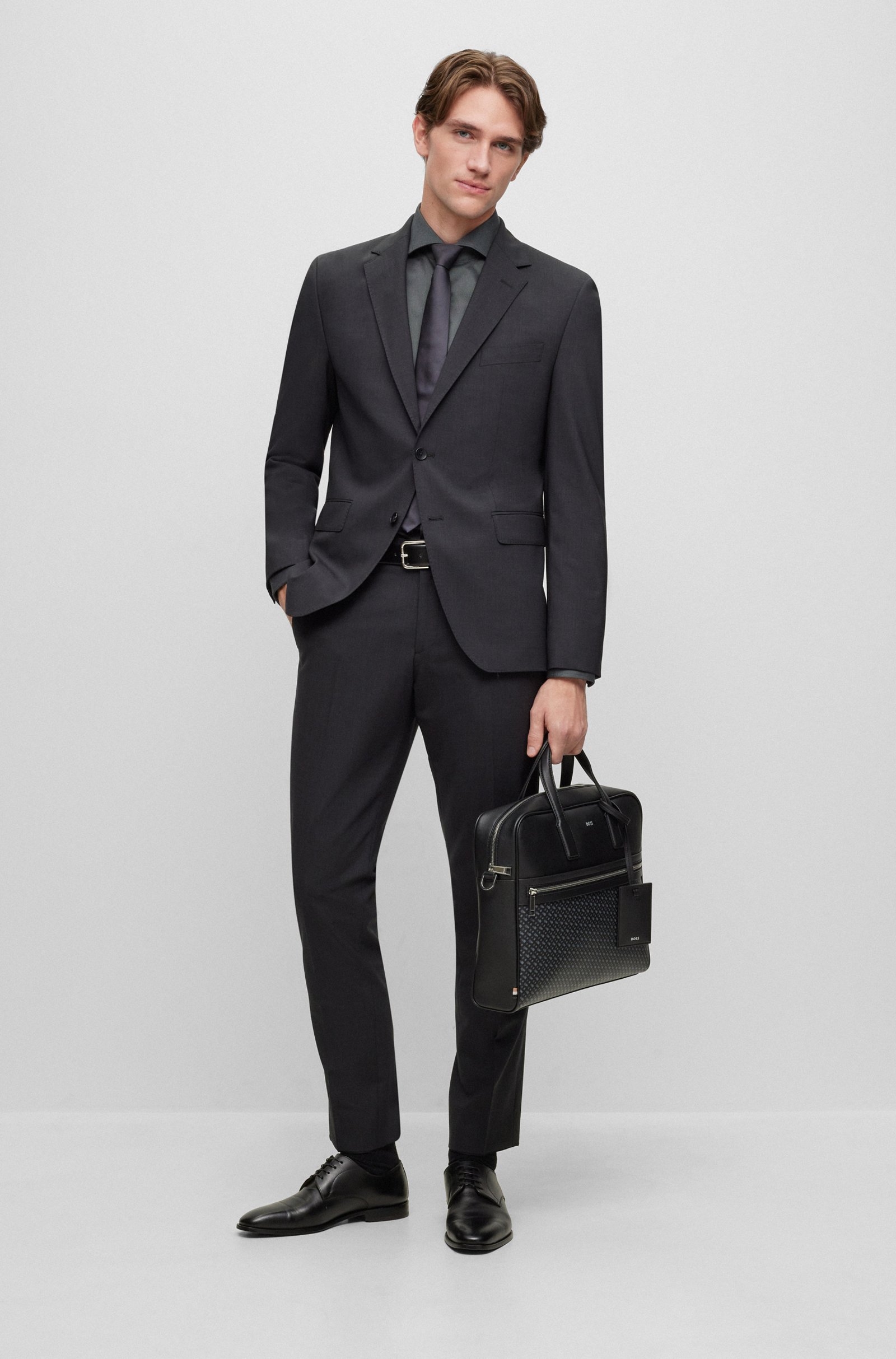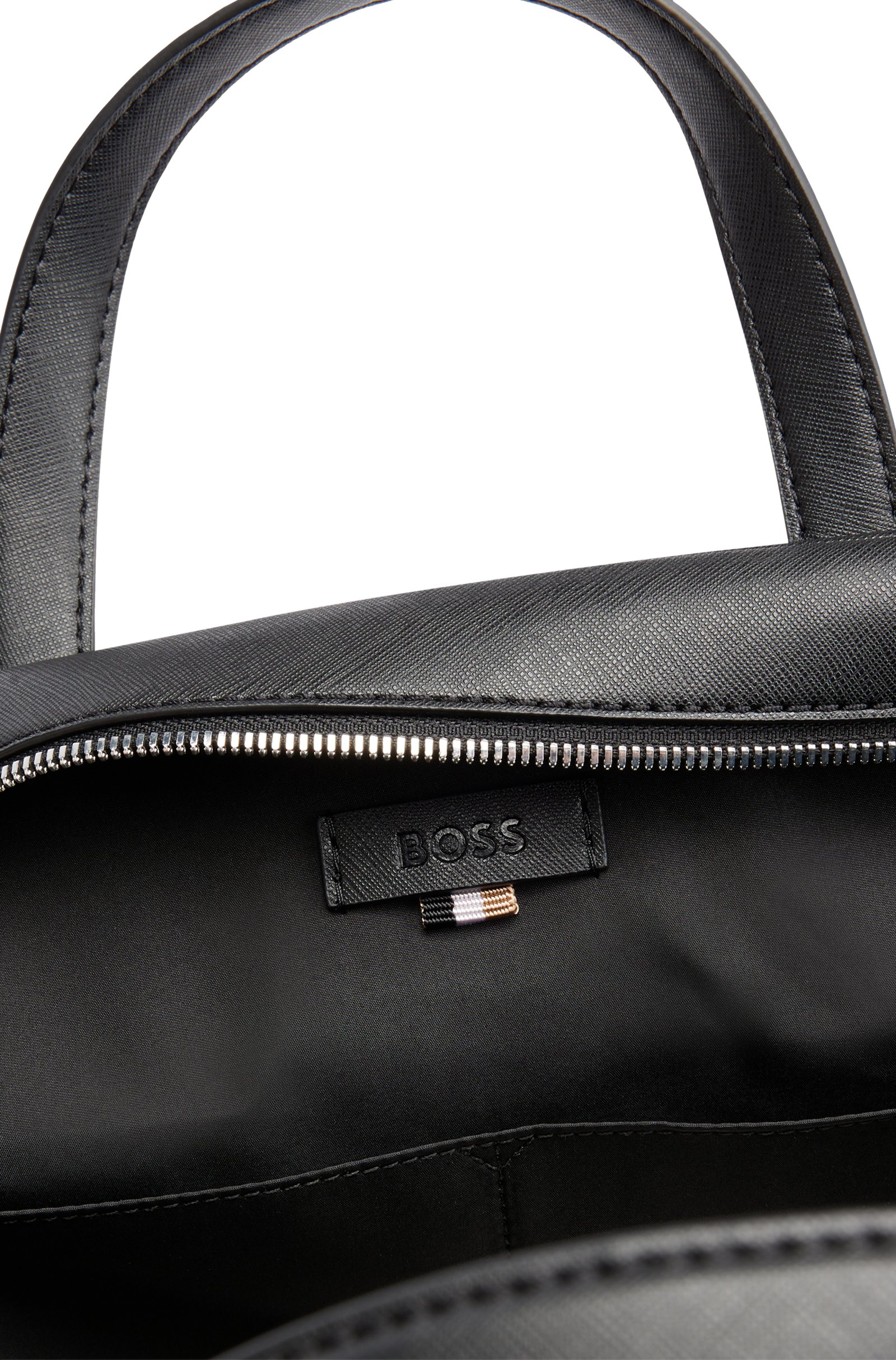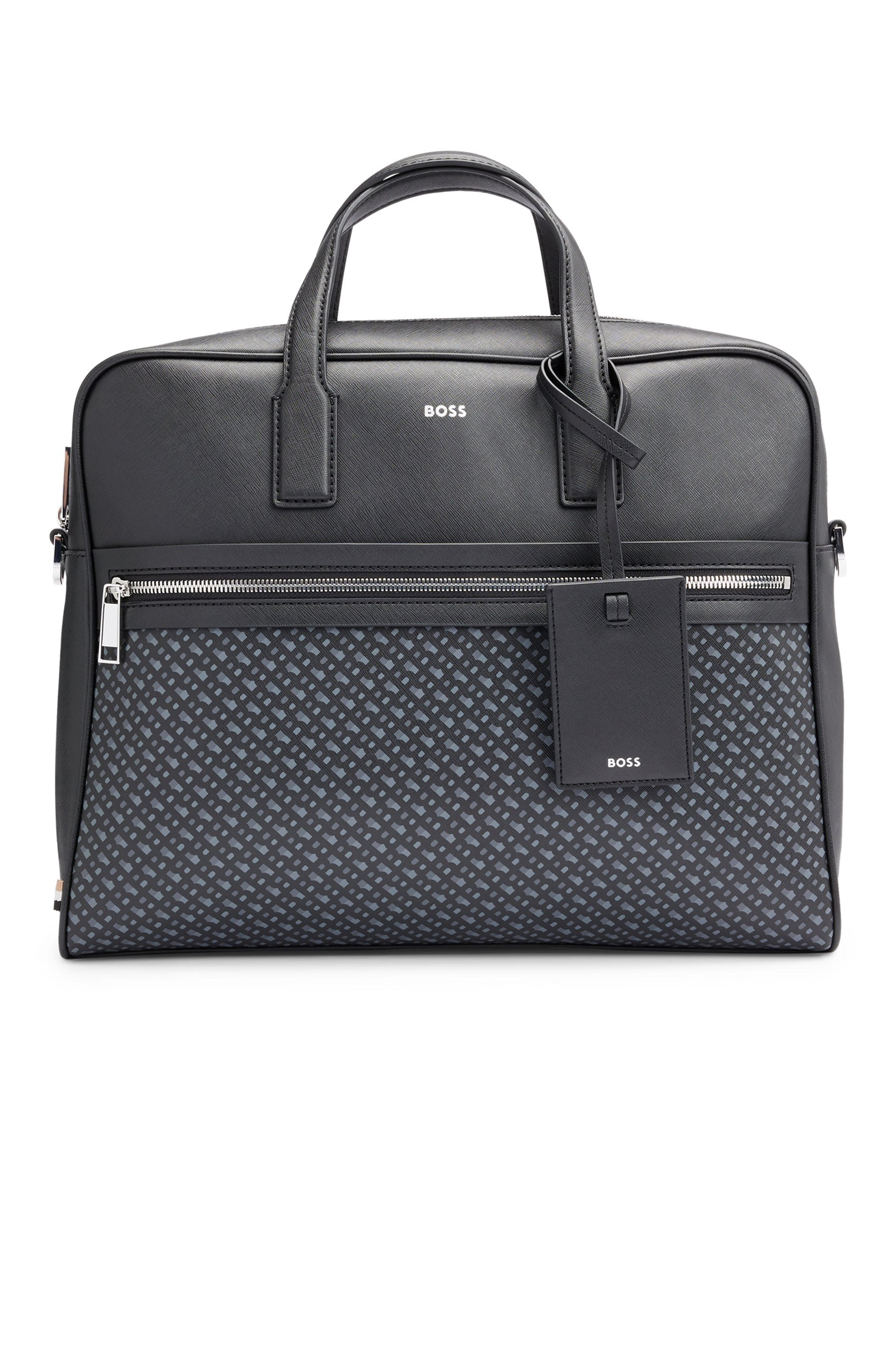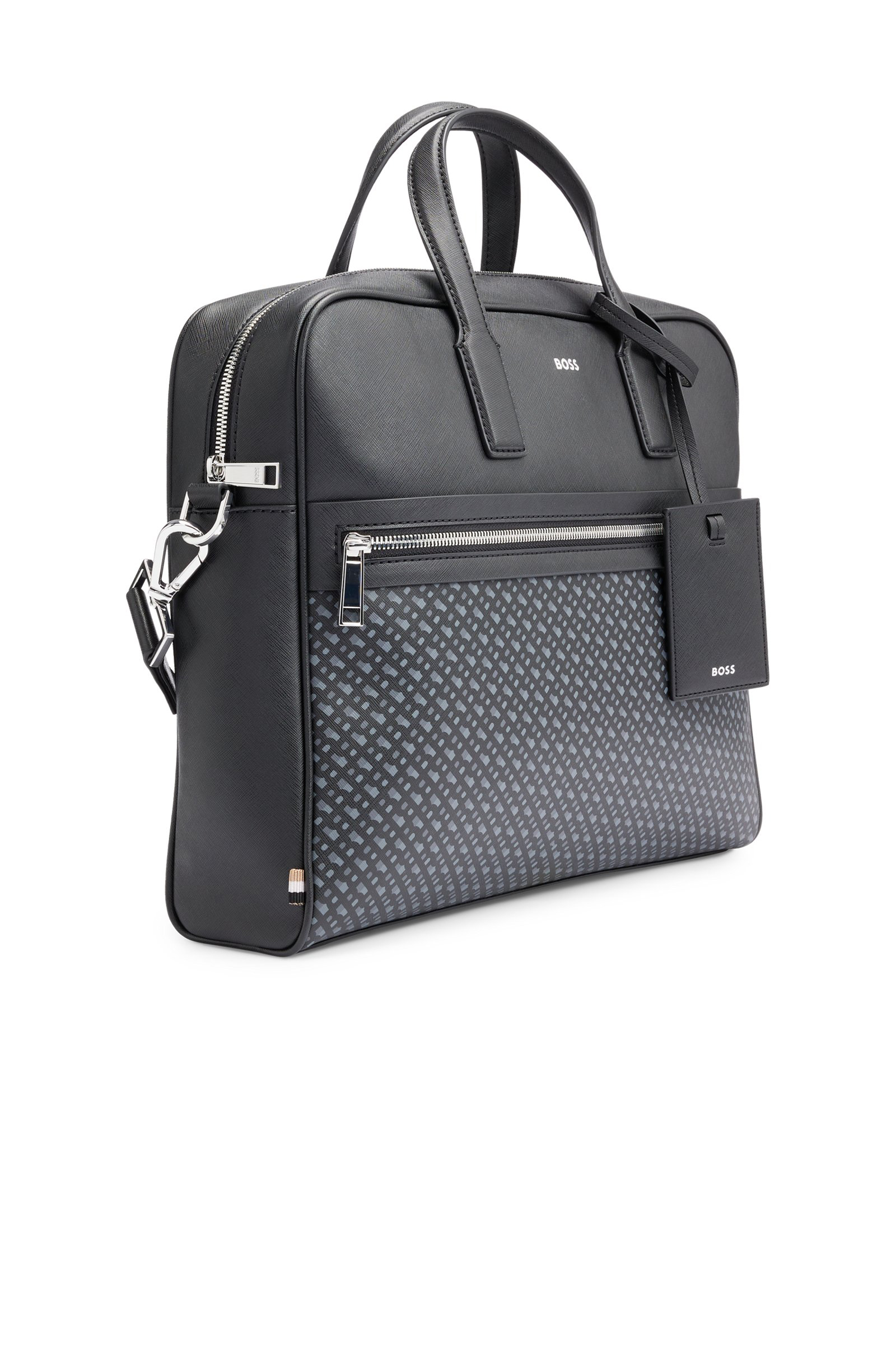 Strukturierte BOSS Herren-Aktentasche mit Logo-Schriftzug, abnehmbarem Schulterriemen, Smart Sleeve auf der Rückseite und Monogramm-Details.