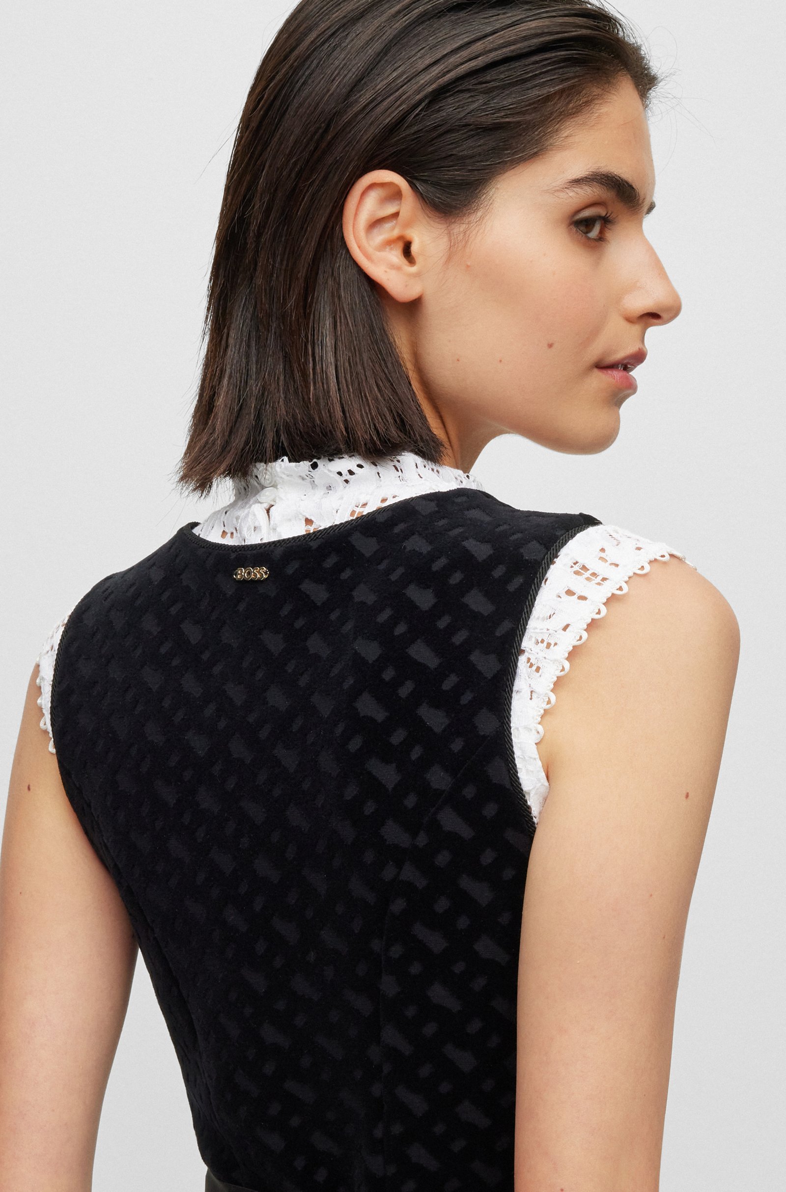 Traditionell inspiriertes Dirndl-Kleid mit tonaler Seidenschürze und Bindegürtel. Der ärmellose Style besteht aus einem samtenen Korsett-Oberteil aus einem Baumwoll-Mix mit Monogramm-Muster und einem gepunkteten Rock. In Kombination mit einem Spitzentop aus der Capsule-Kollektion entsteht ein eleganter Kontrast. Aus einer exklusiven Kollektion mit zeitlosen und traditionellen Trachten, die in Zusammenarbeit mit der Dirndl-Expertin KINGA MATHE entworfen wurden.