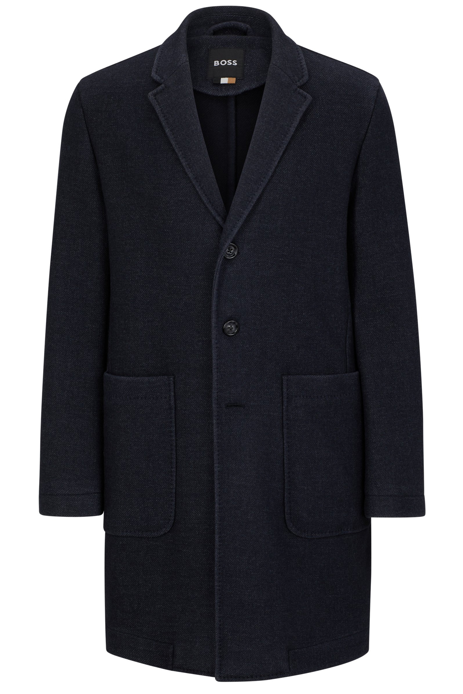 Formeller BOSS Herren-Mantel aus einem fein gemusterten Woll-Mix mit schmaler Passform und großen aufgesetzten Taschen.