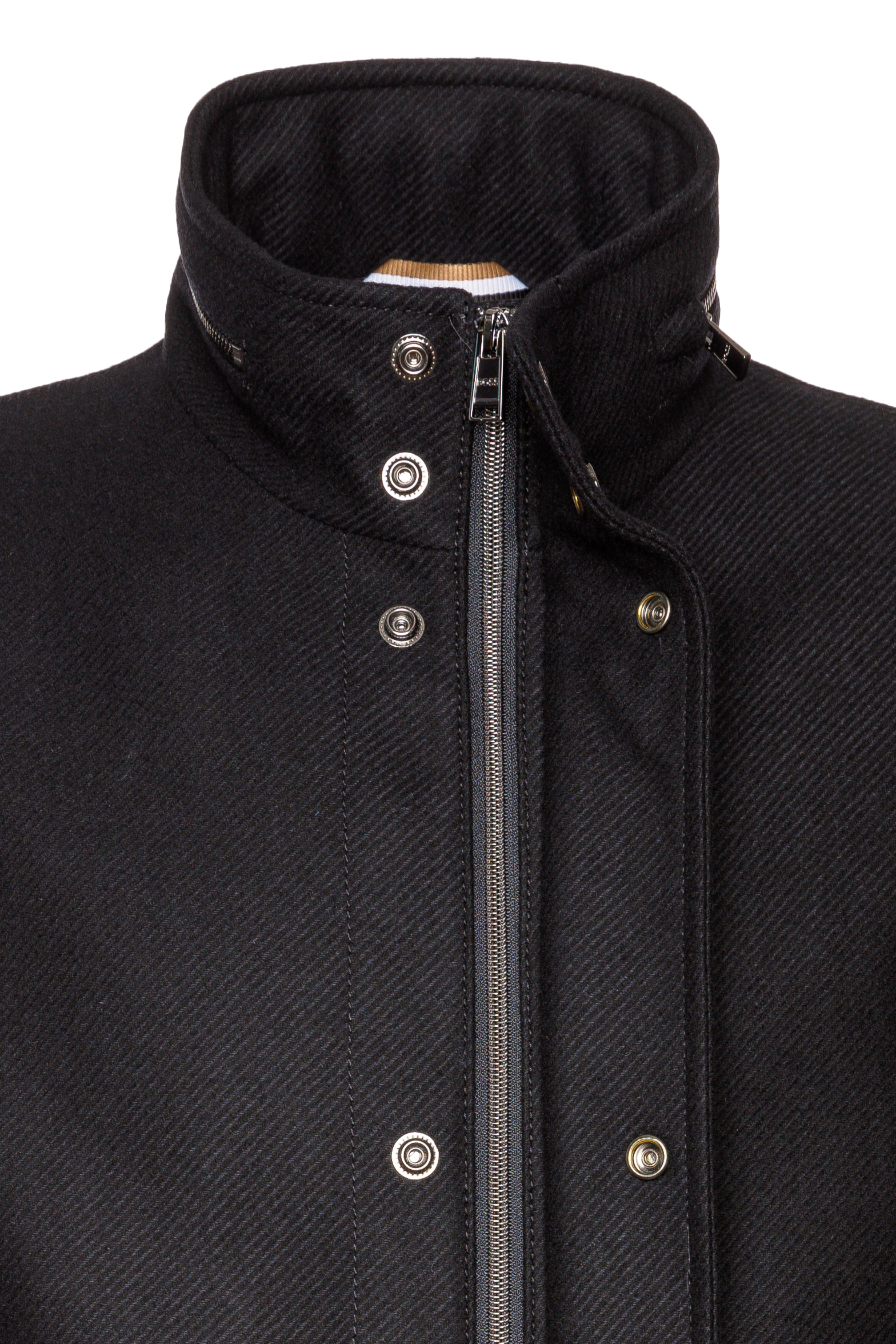 • Stehkragen mit Übertritt und Druckknopfverschluss