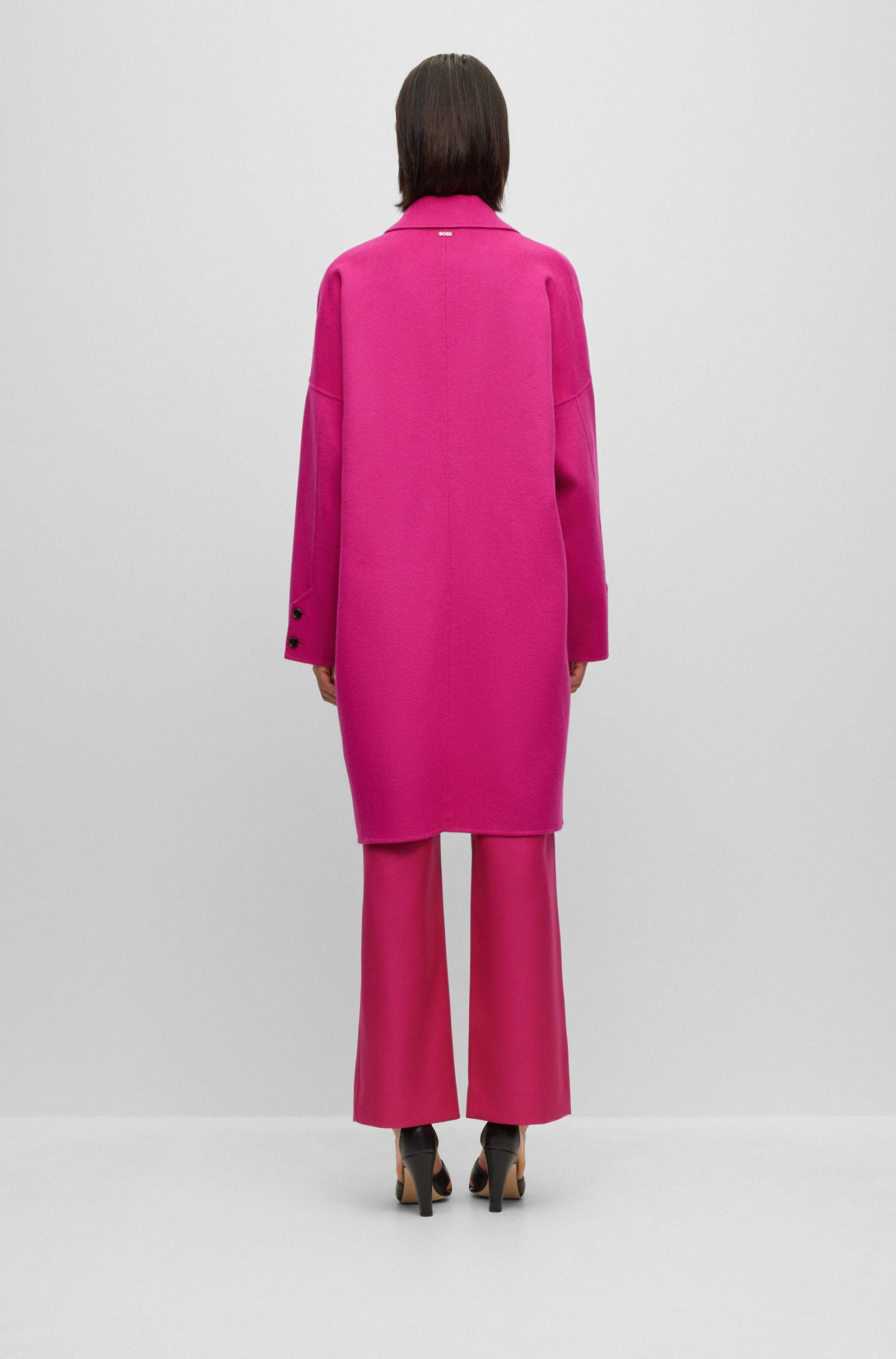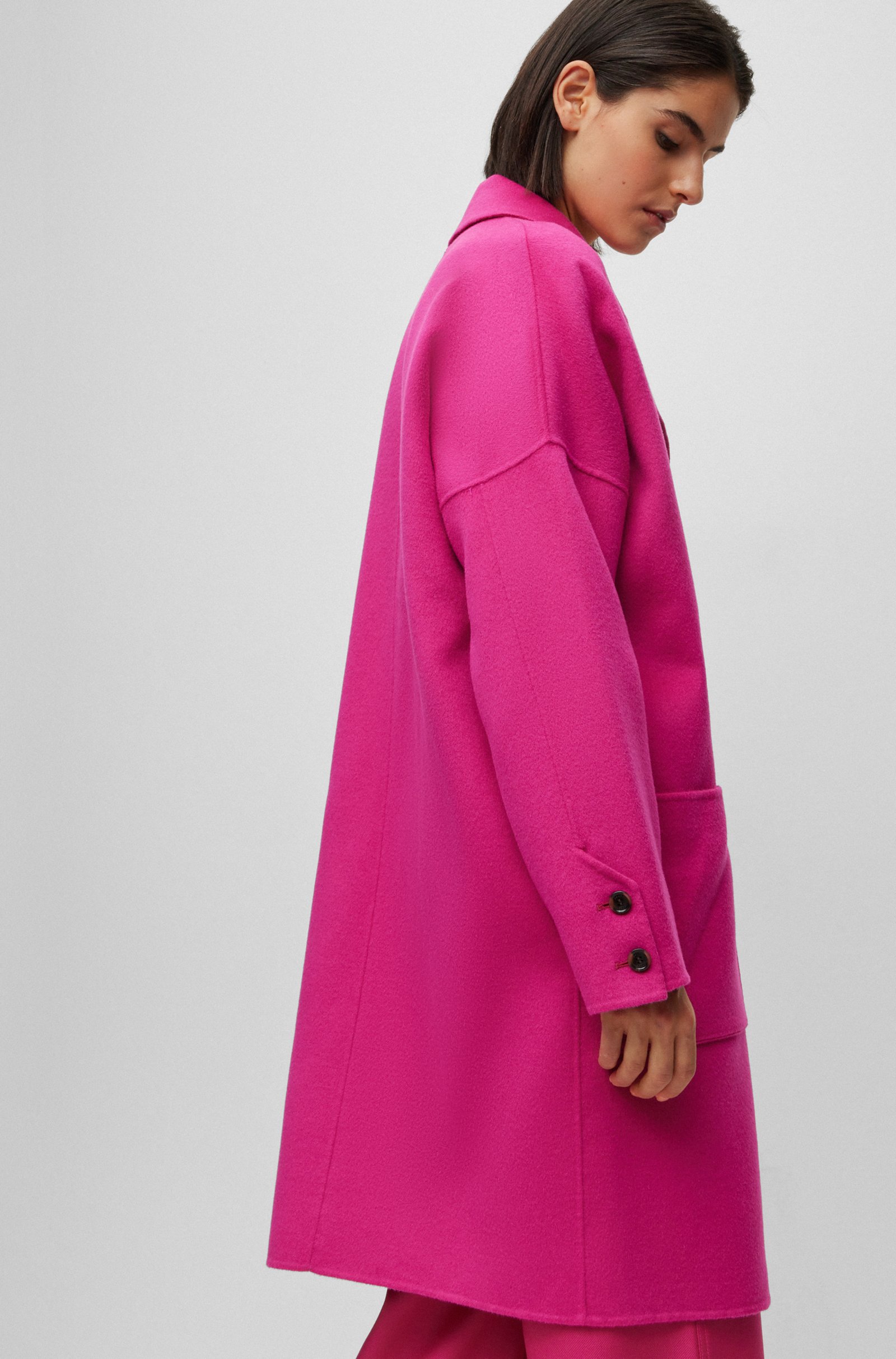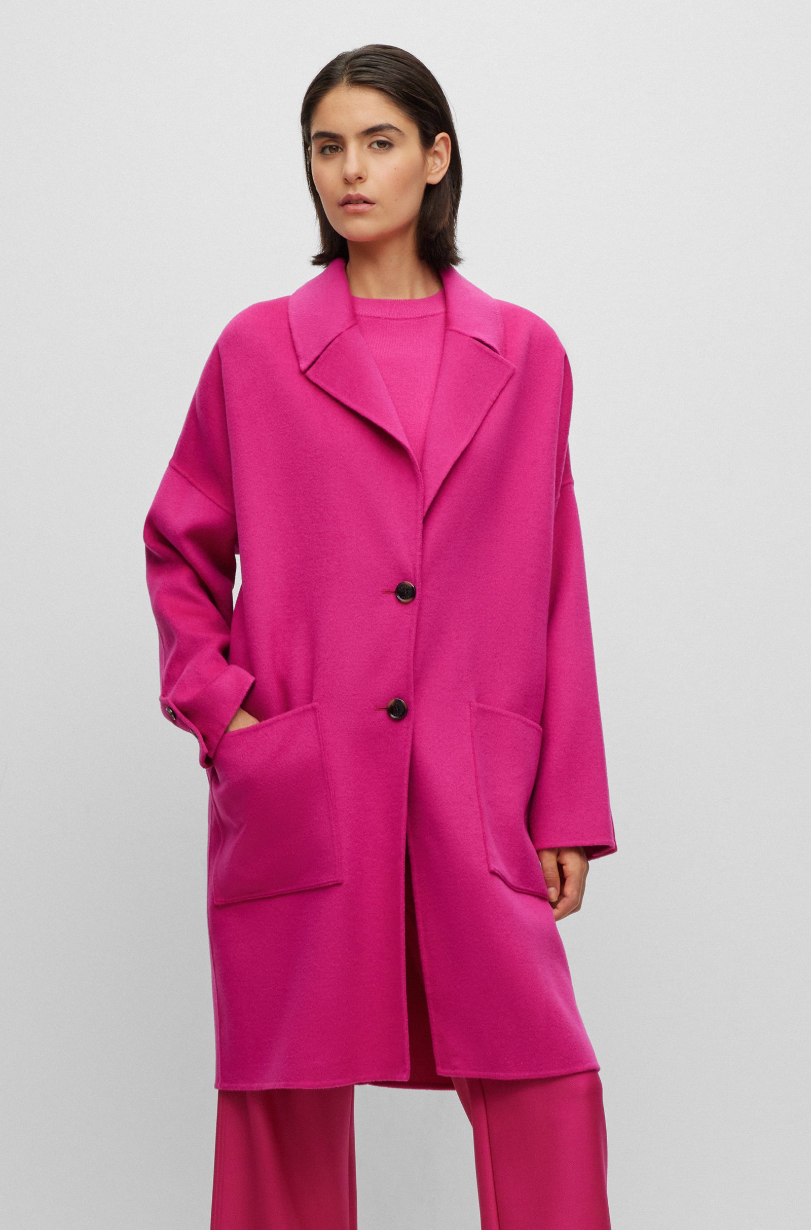 Ideal für die Übergangszeit: der locker geschnittene, melierte BOSS Damen-Mantel aus einem schweren, zweiseitigen Woll-Mix mit Oversize-Revers.