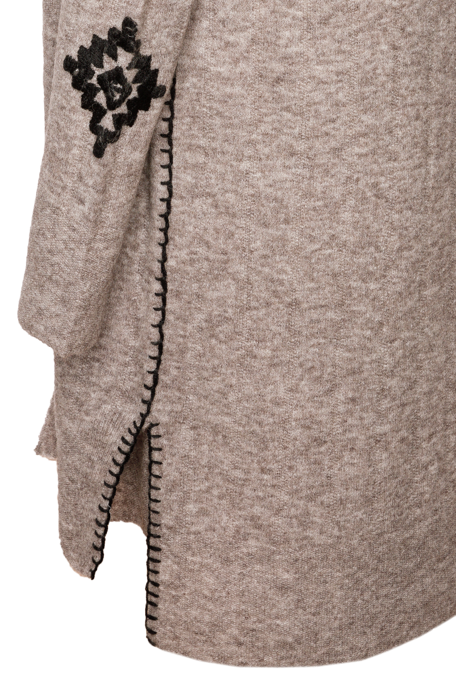 • Mit schwarzen Ziernähten und Stickereien