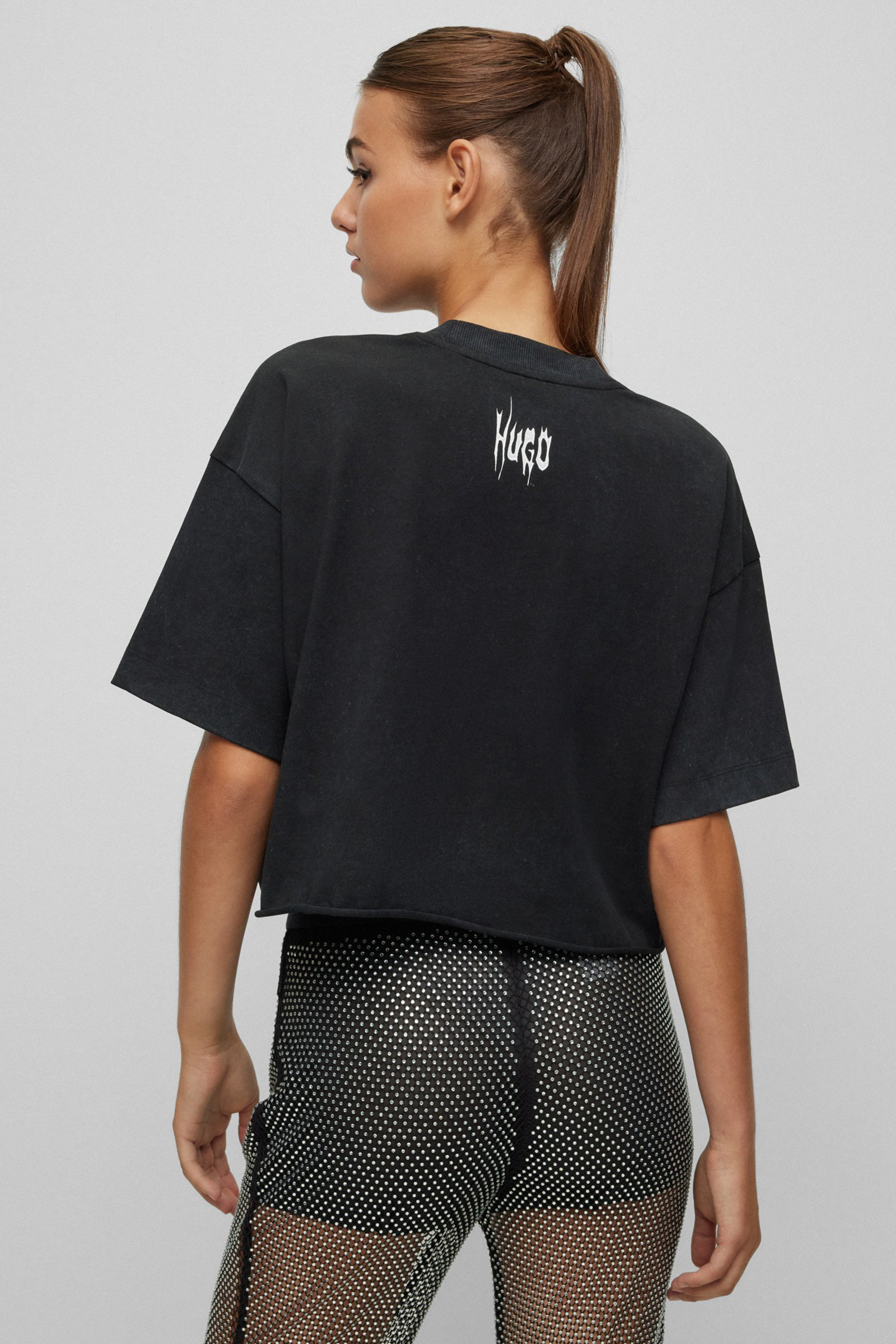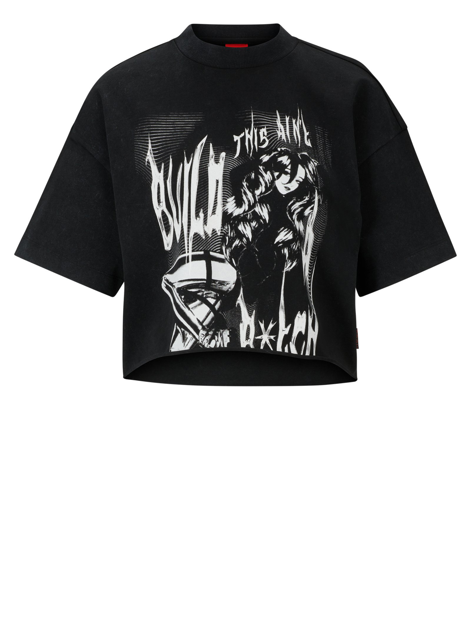 Locker geschnittenes HUGO T-Shirt aus schwerem Jersey in Cropped-Länge mit speziellem Artwork auf Vorder- und Rückseite. Aus der limitierten Capsule in Zusammenarbeit mit Bella Poarch, die die typische HUGO Authentizität und Individualität mit dem charakteristischen Grunge-Glamour der Sängerin kombiniert.