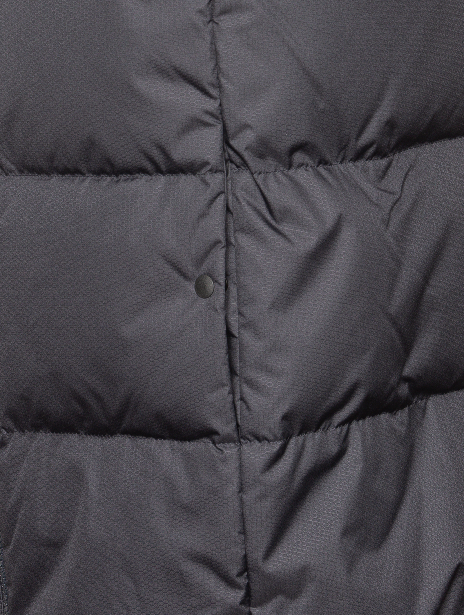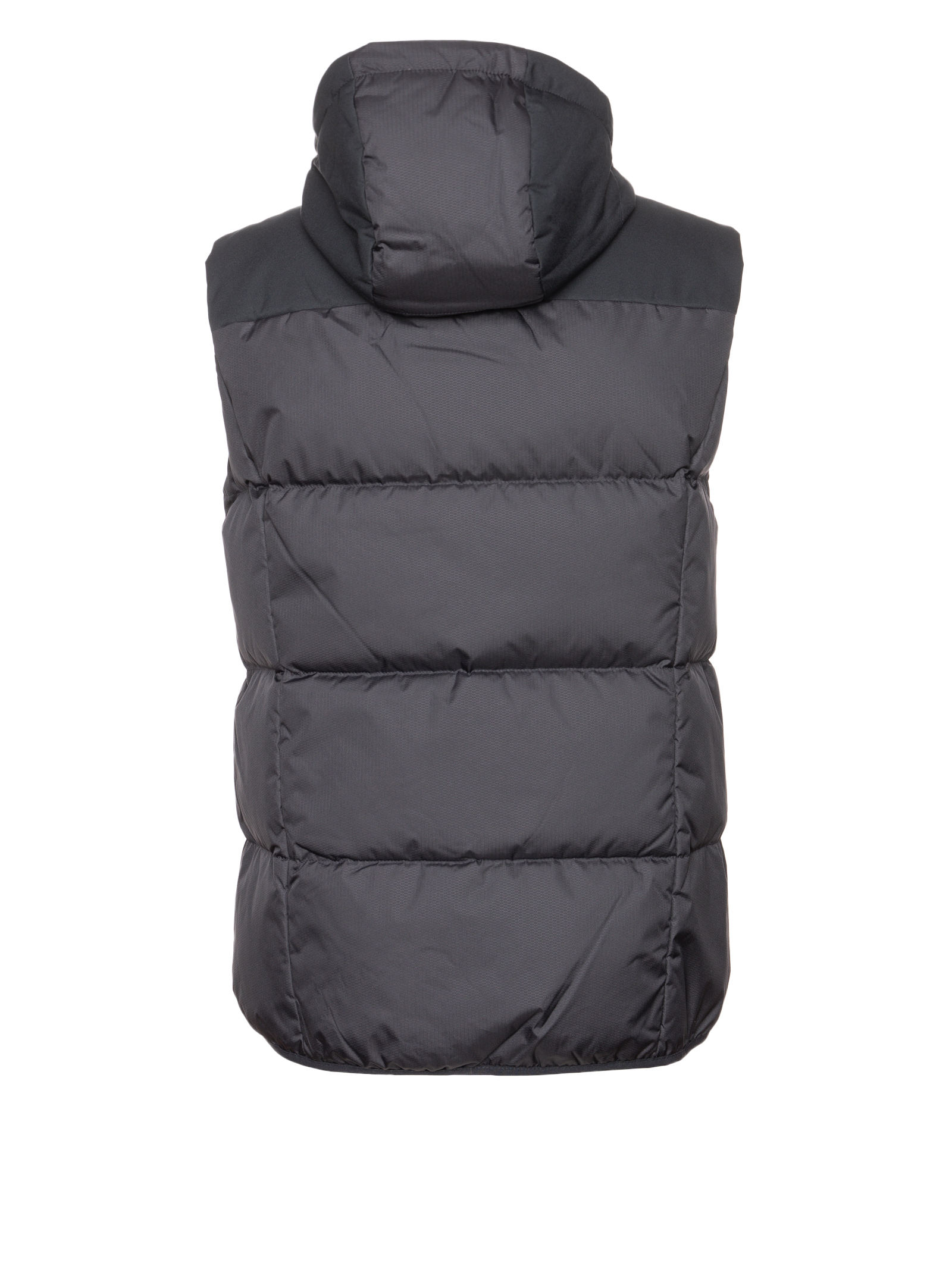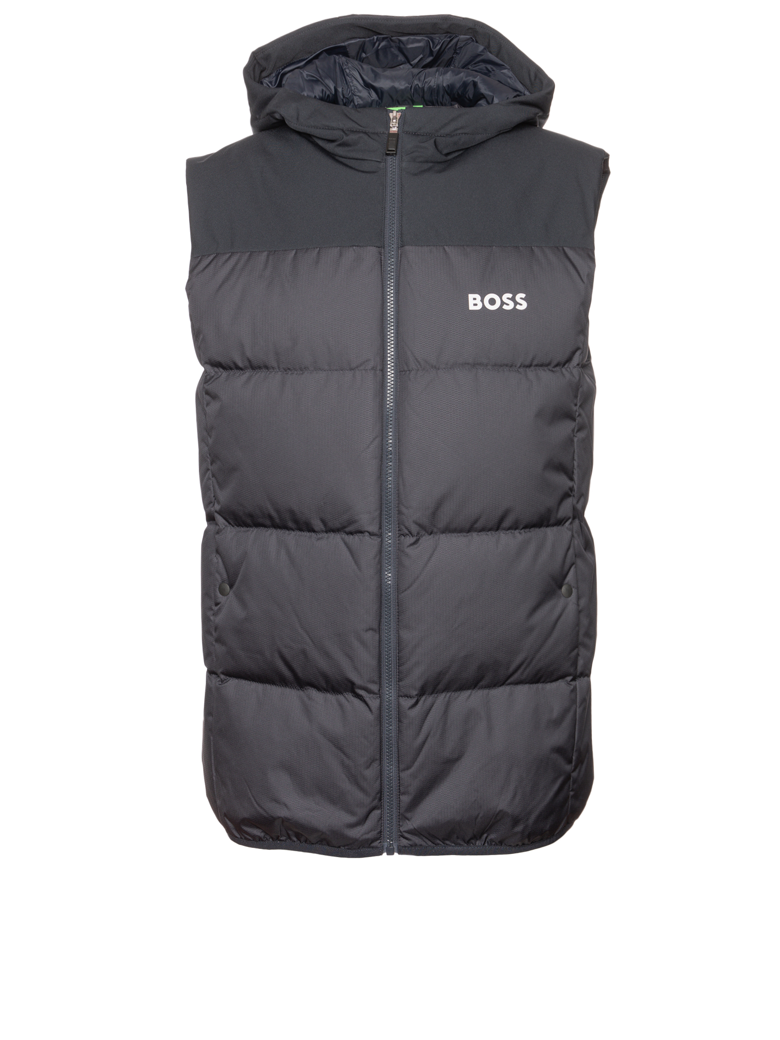 Gerade geschnittene Herren-Weste von BOSS Menswear aus einem wasserabweisenden Material-Mix mit Kapuze und Logo auf der Brust.