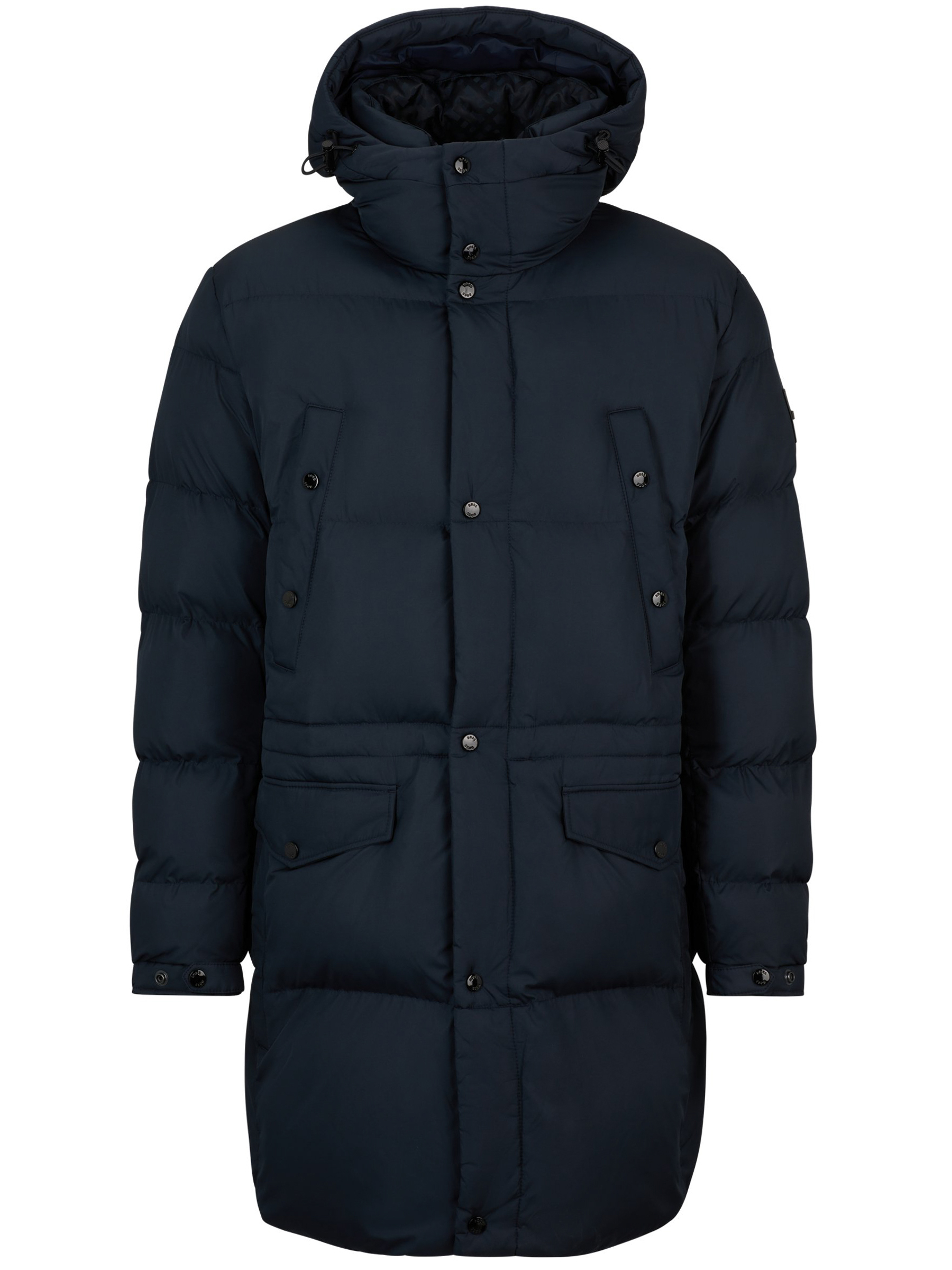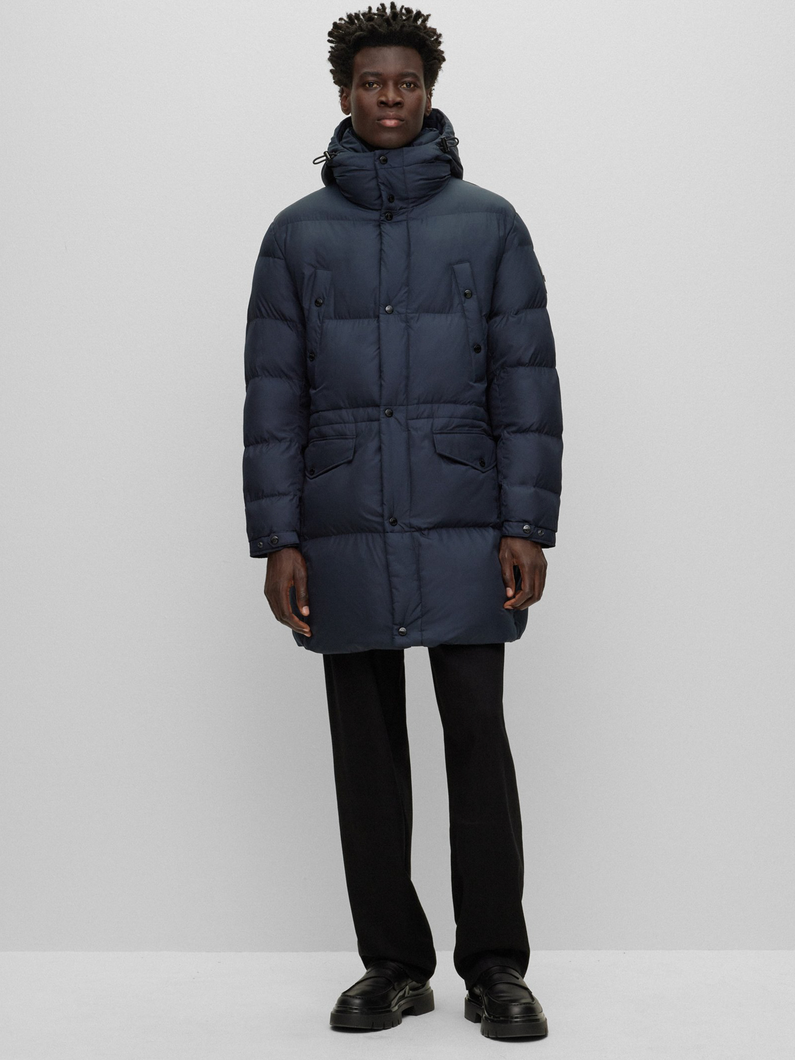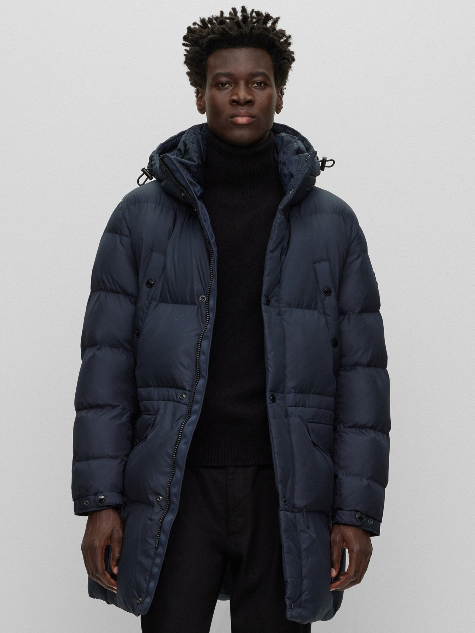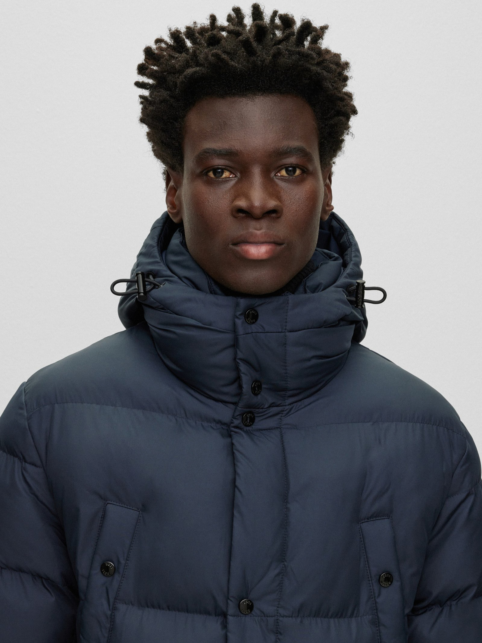 Wasserabweisende BOSS Herren-Kapuzenjacke mit leichter Füllung, Monogramm-Kragen und Logo-Druckknöpfen.