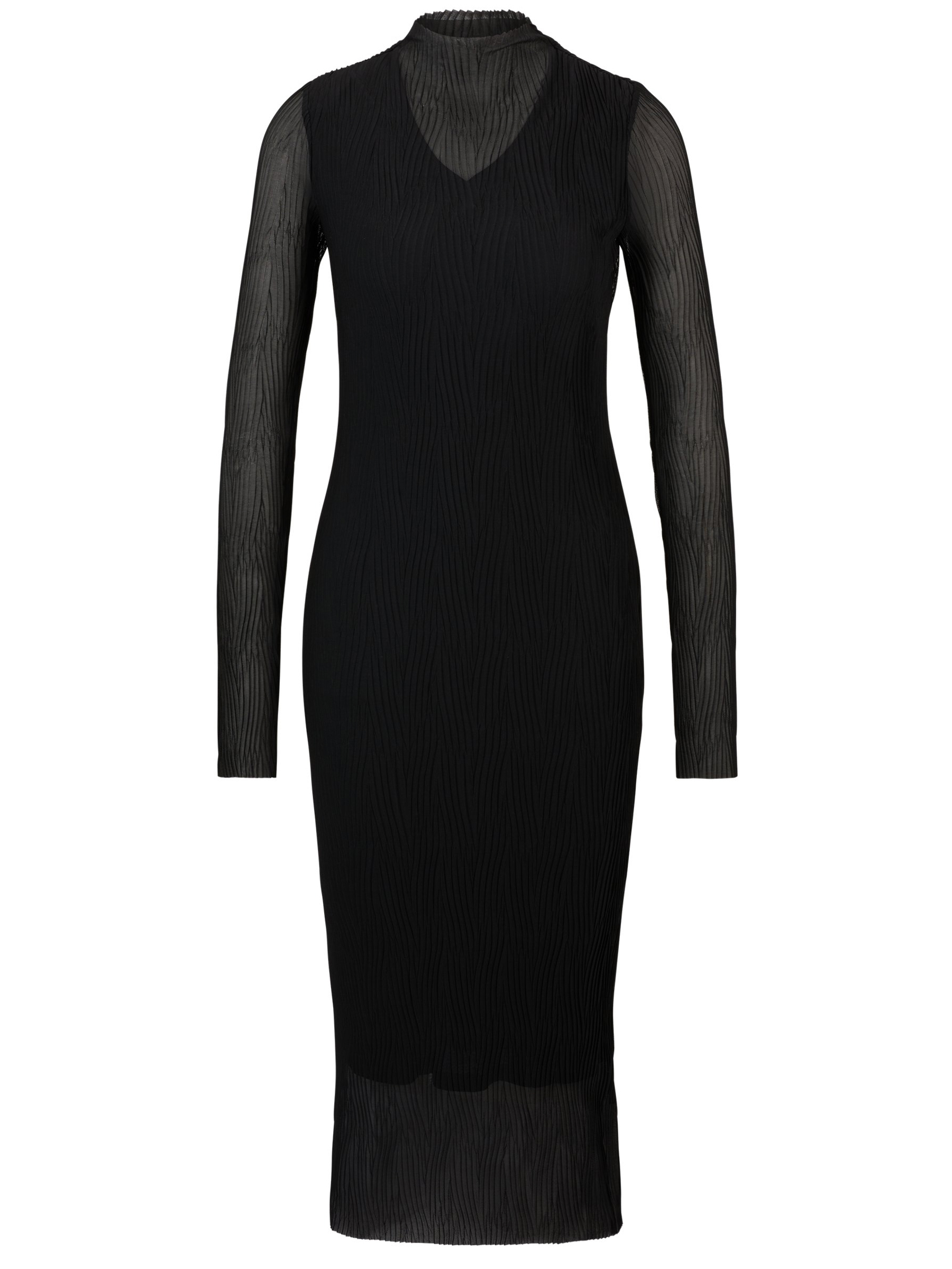 Zeitgemäßes BOSS Damen-Kleid. Der Style aus Stretch-Tüll mit gewellten Plissee-Falten ist mit einem glatten Innenfutter am Rumpf versehen. Ein Stehkragen rundet die zeitgemäße Silhouette ab.