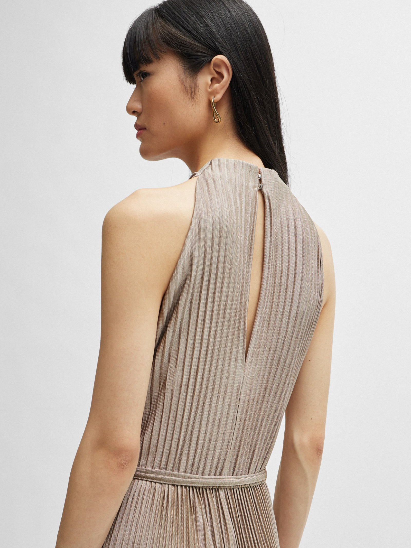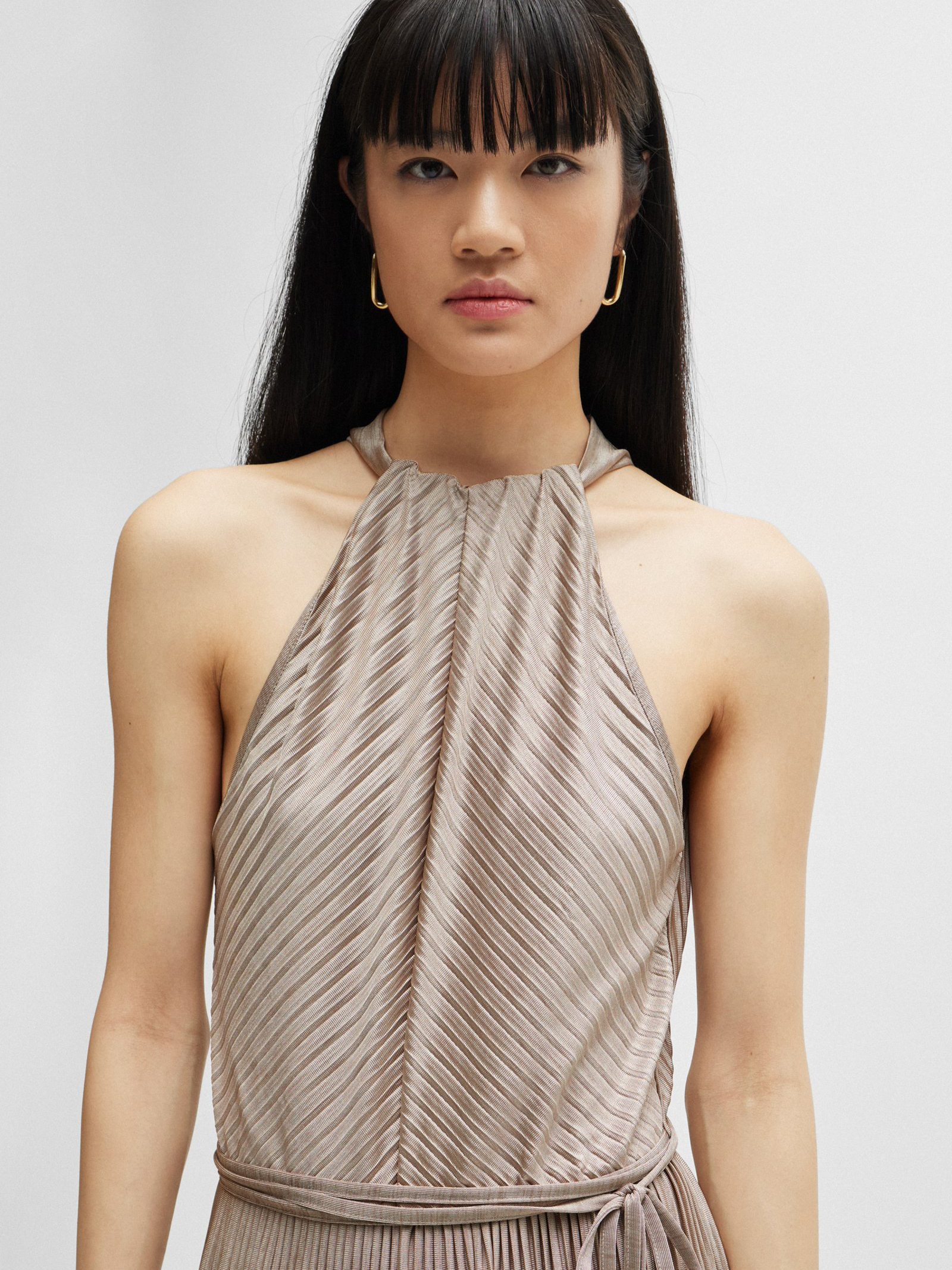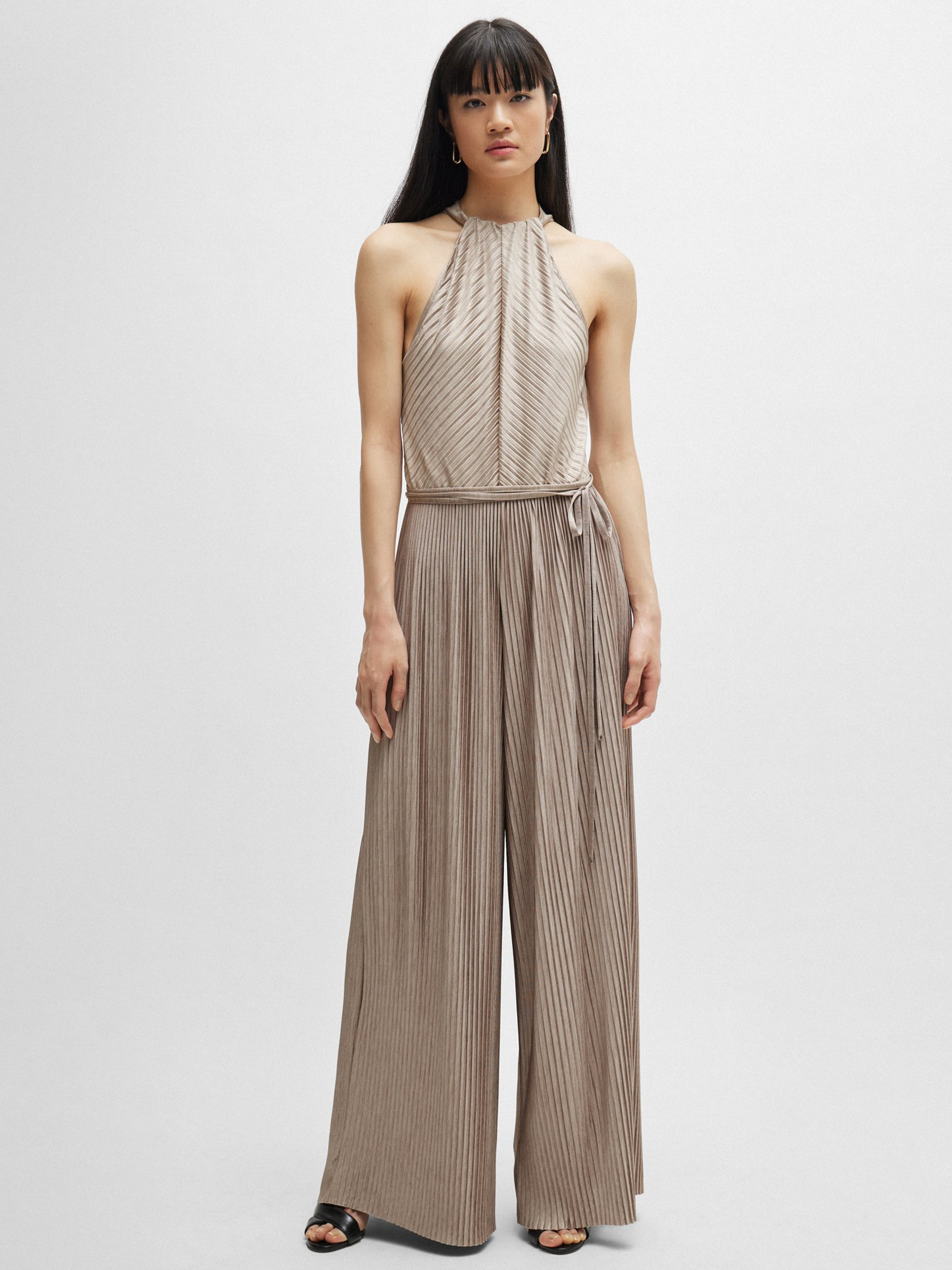 Eleganter, ärmelloser BOSS Damen-Jumpsuit aus einem schimmernden, elastischen Material-Mix mit mehrfach gewickeltem Gürtel und Plissee-Falten, die in verschiedene Richtungen gehen.