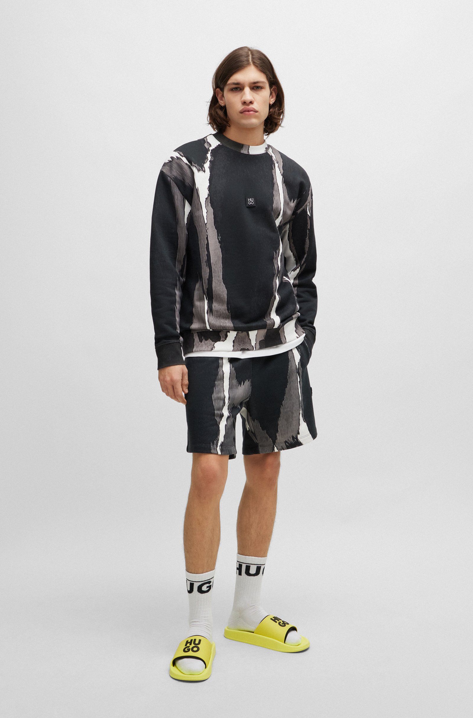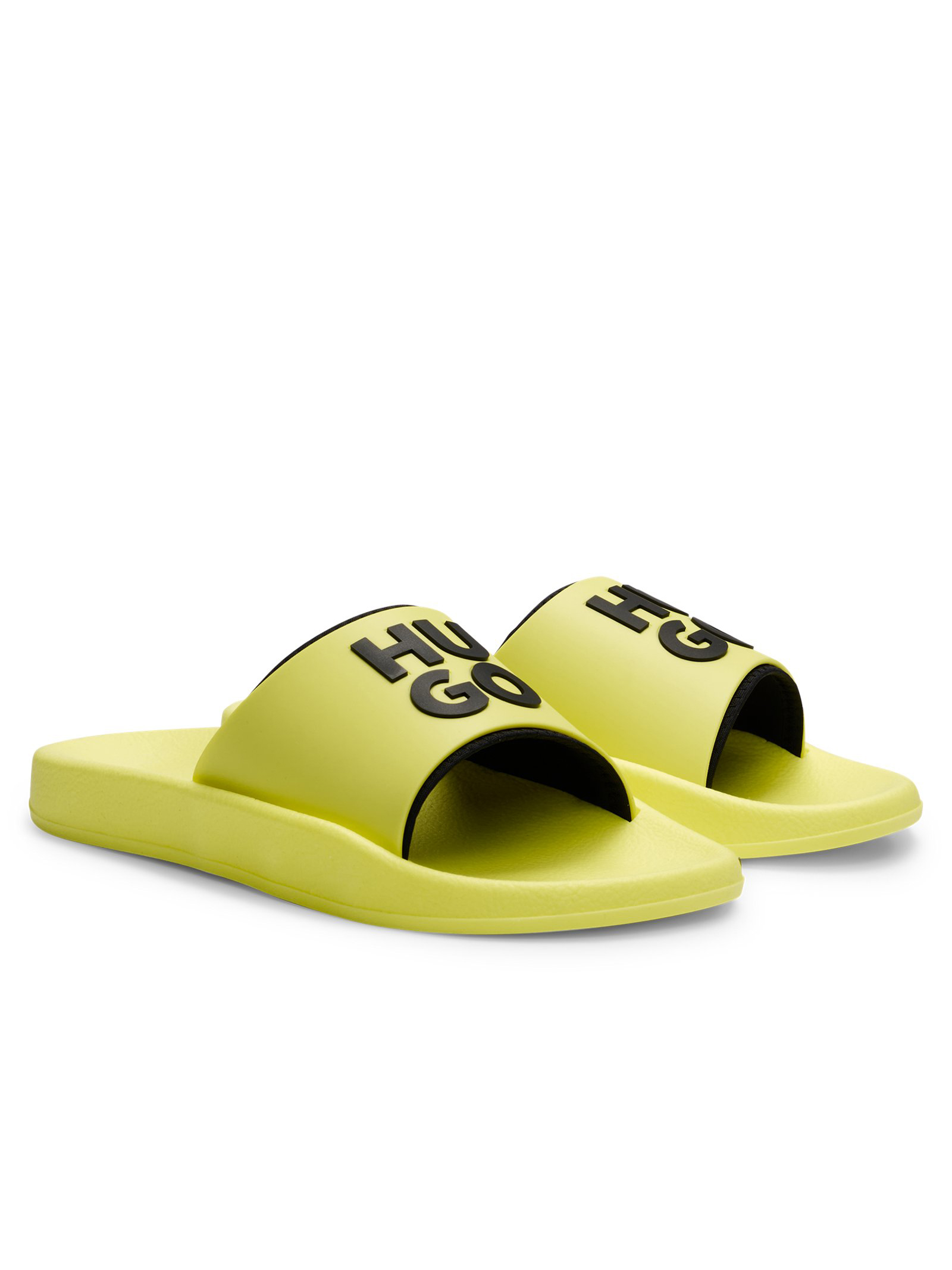 Lässig-coole HUGO Slides im leichten, bequemen Design. Mehrlagige Riemen mit erhabenem, gummiertem Logo sorgen für einen markanten Look. Made in Italy.