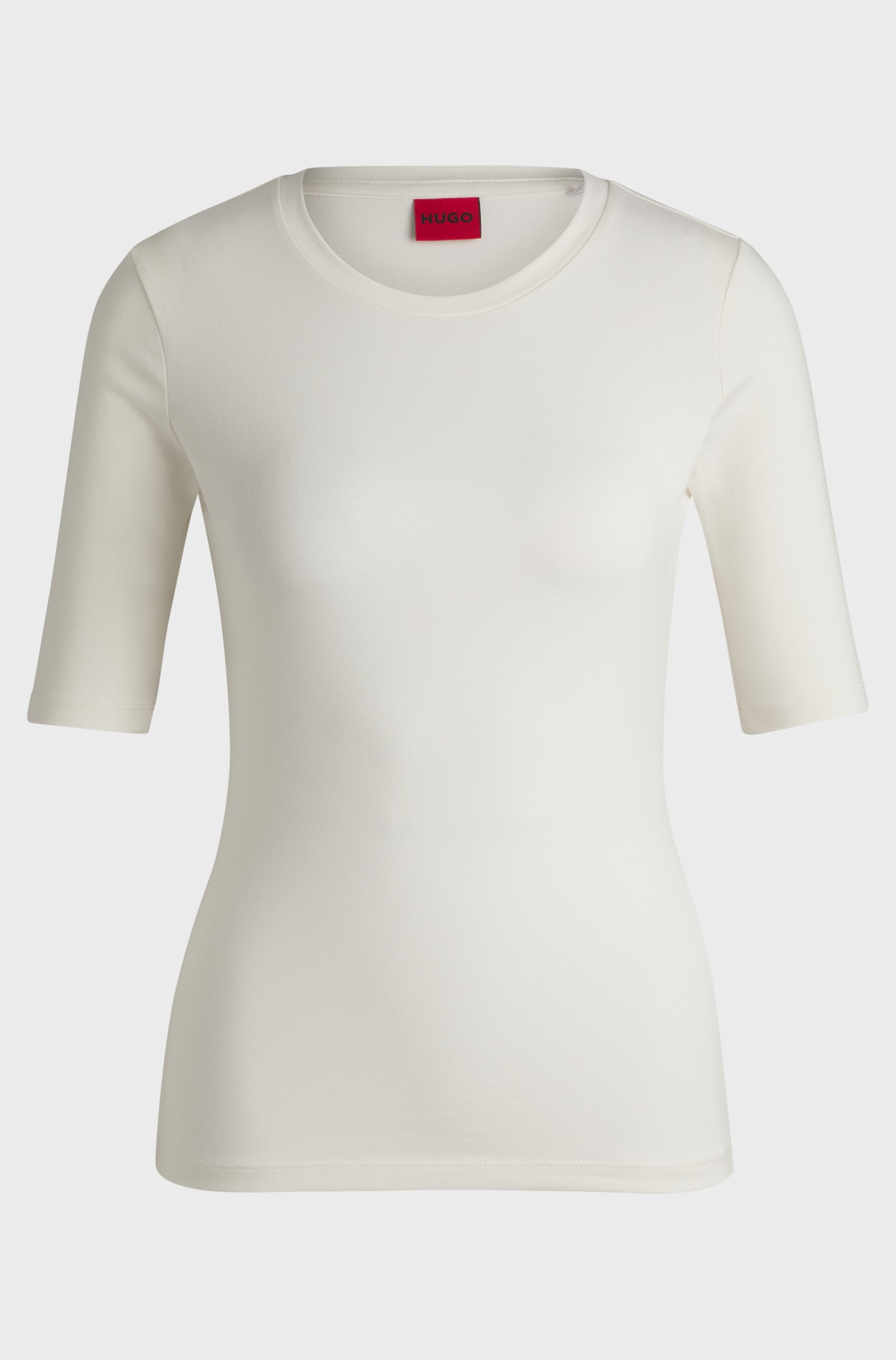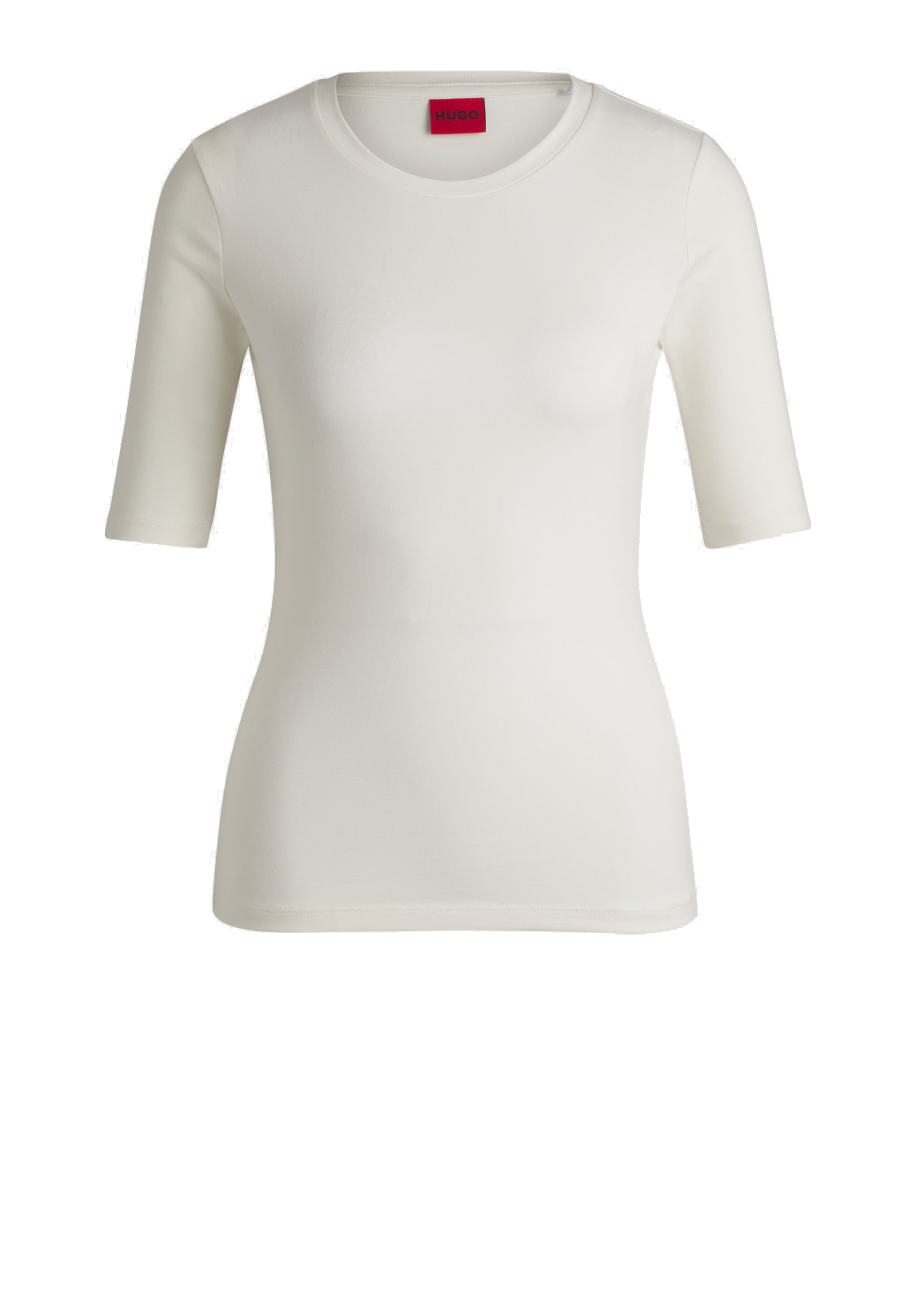 Schmeichelhaftes HUGO T-Shirt mit schmaler Passform und verkürzten Ärmeln. Der Style ist aus einem atmungsaktiven und soften Stretch-Gewebe gefertigt und verfügt über ein Logo auf der Rückseite.