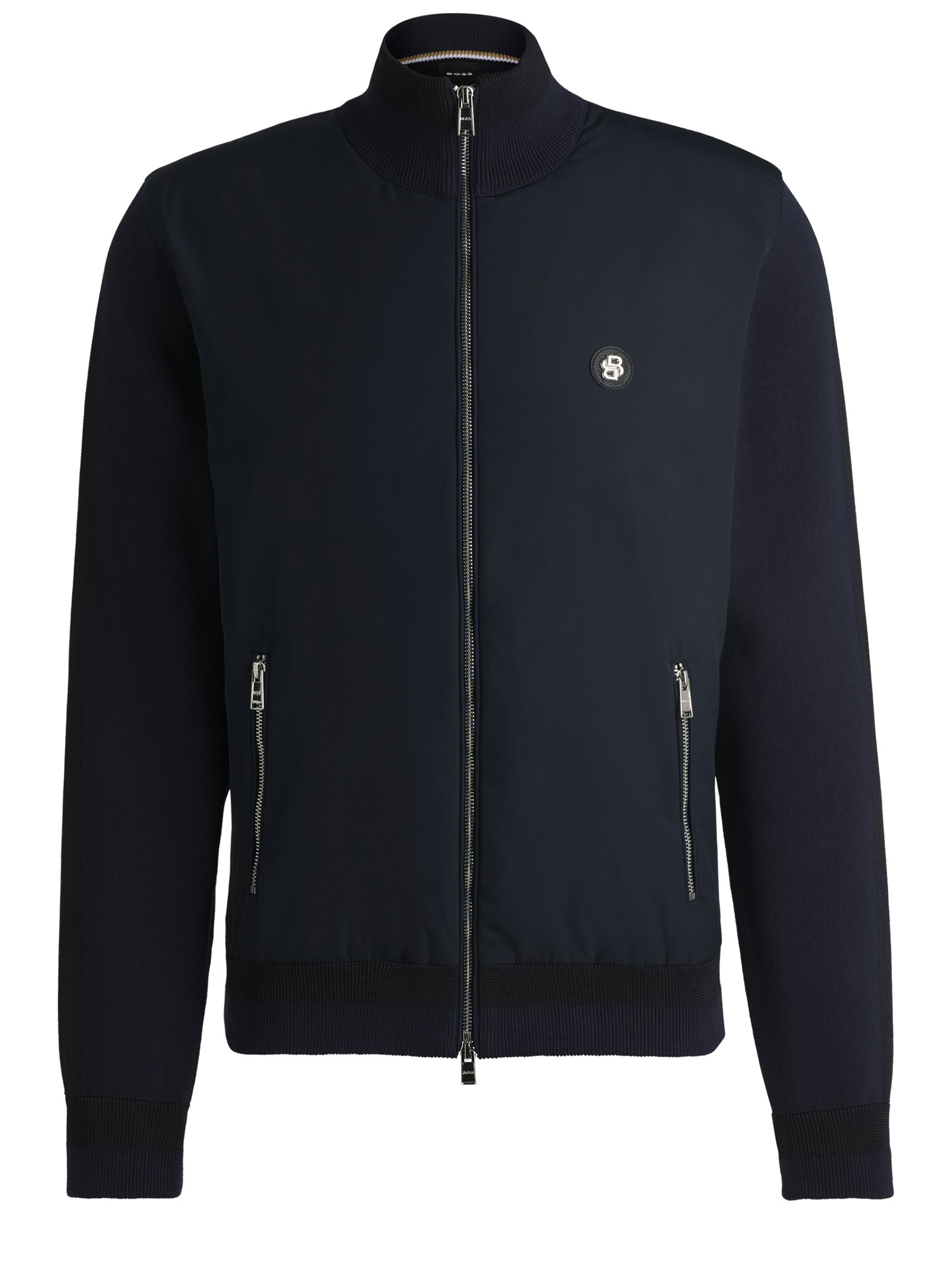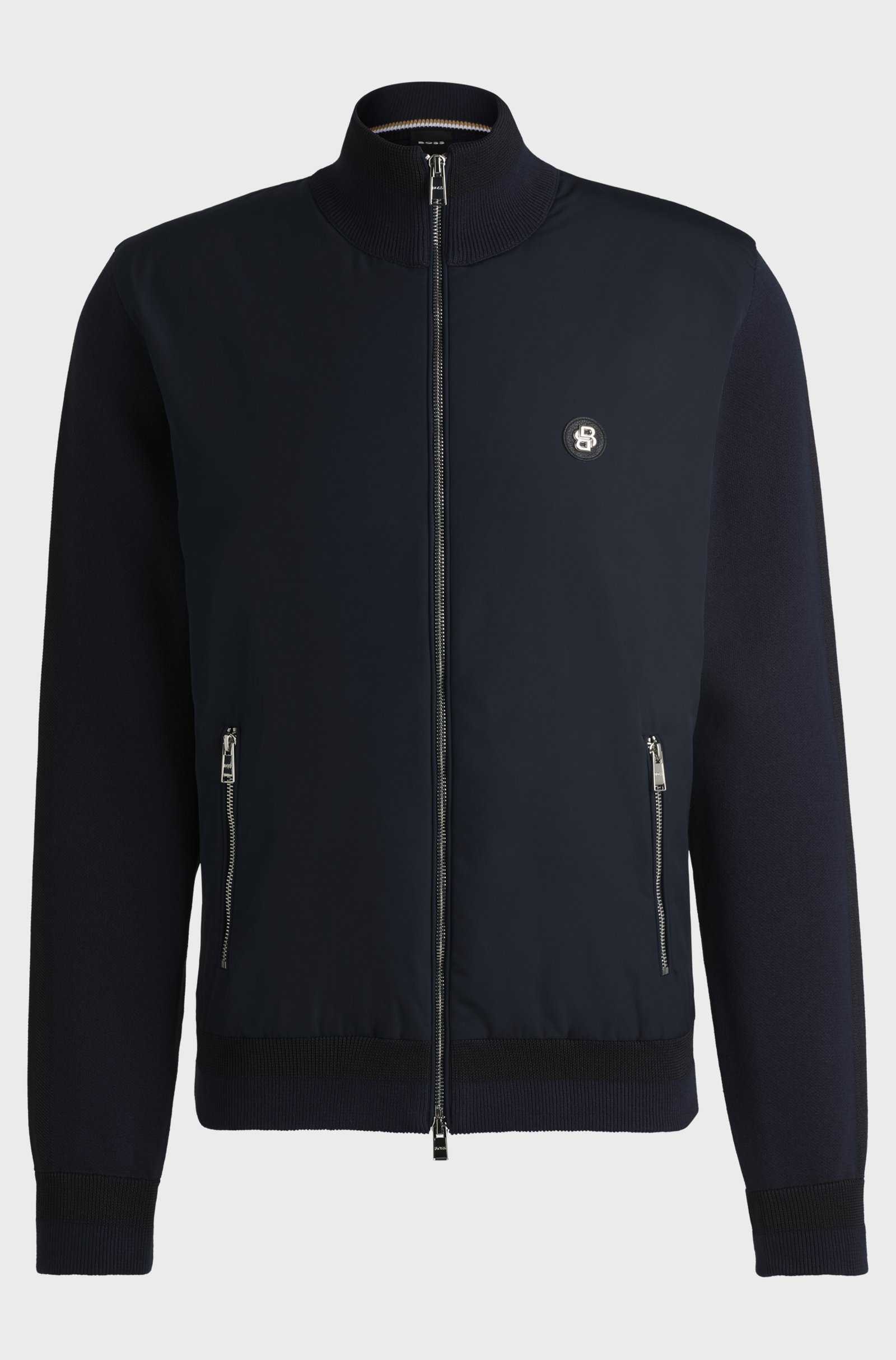 Charakteristische BOSS Jacke mit Reißverschluss. Die gerade geschnittene Outerwear ist aus verschiedenen Materialien gefertigt und mit einem doppelten Monogramm-Aufnäher auf der Brust versehen.