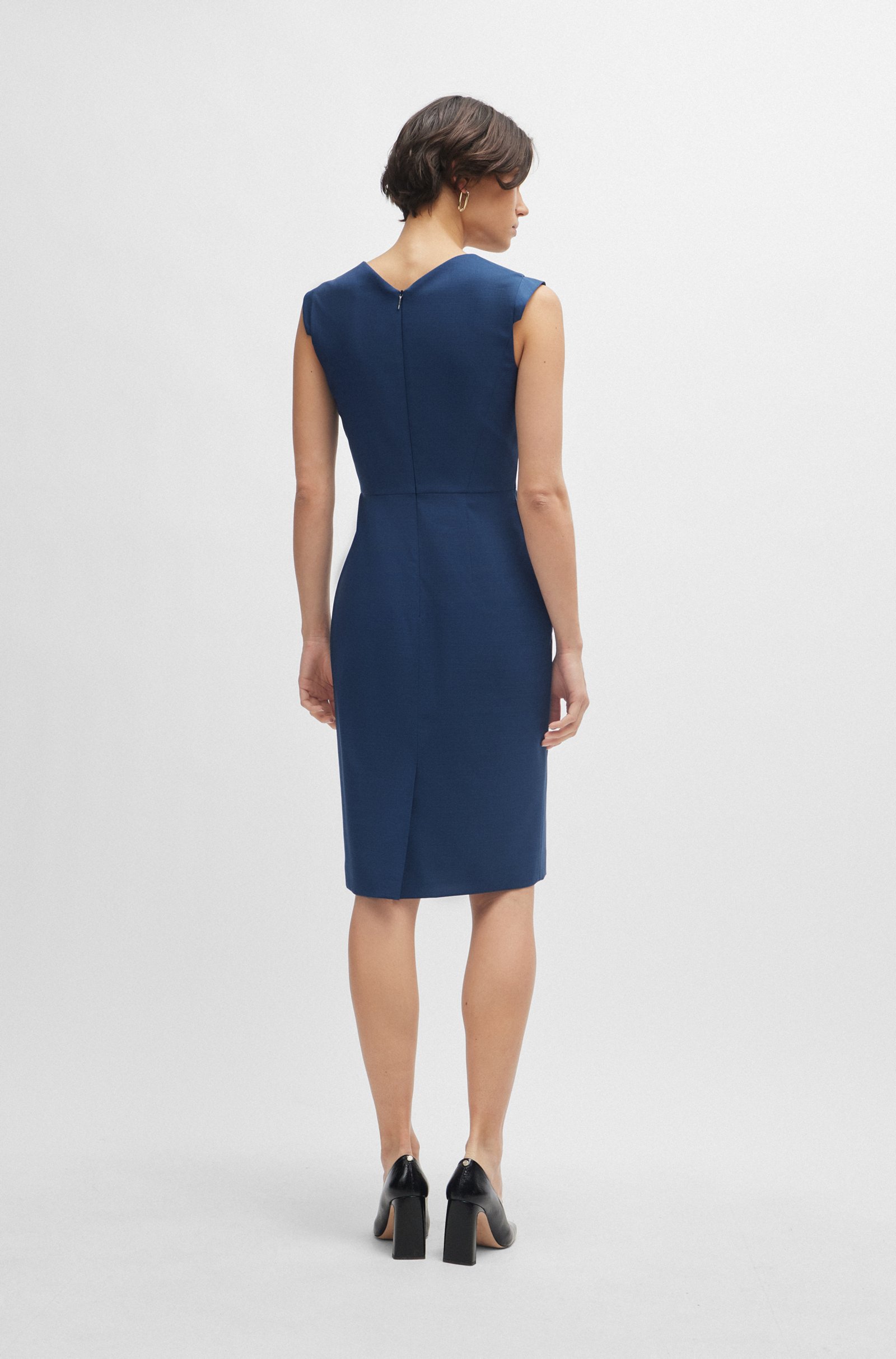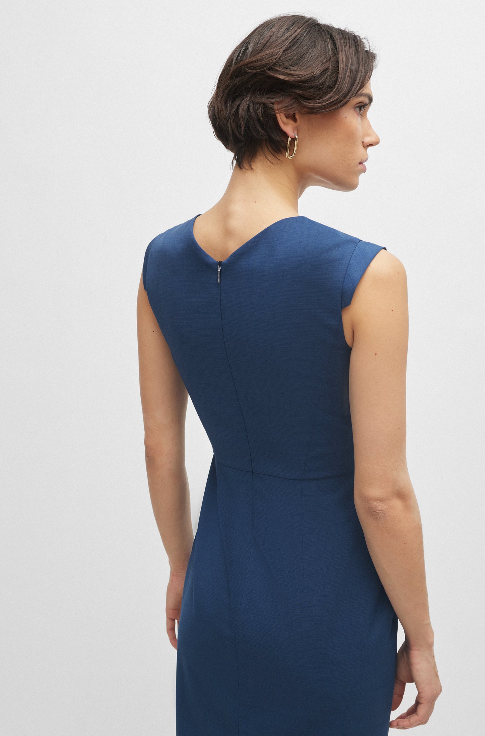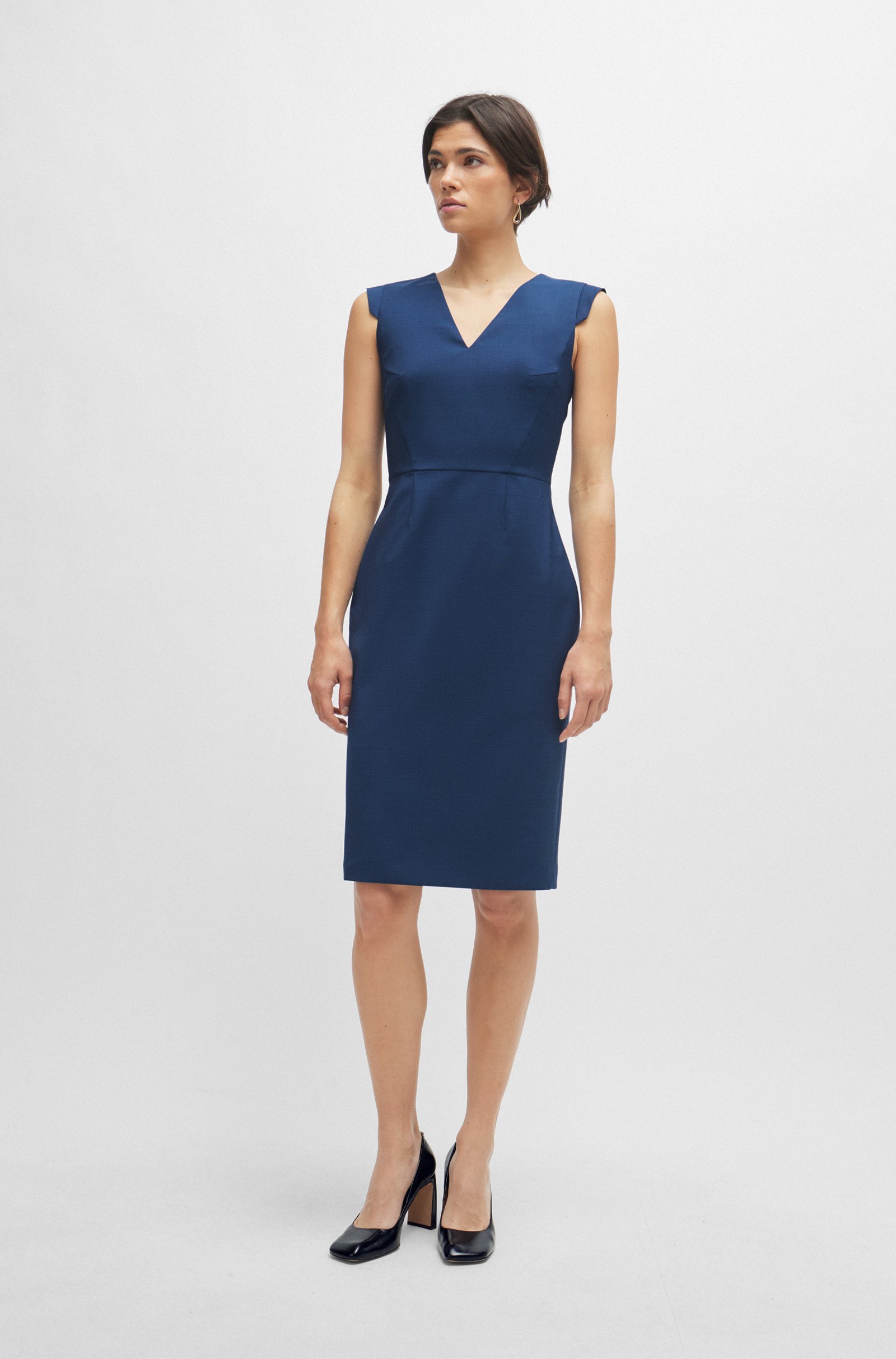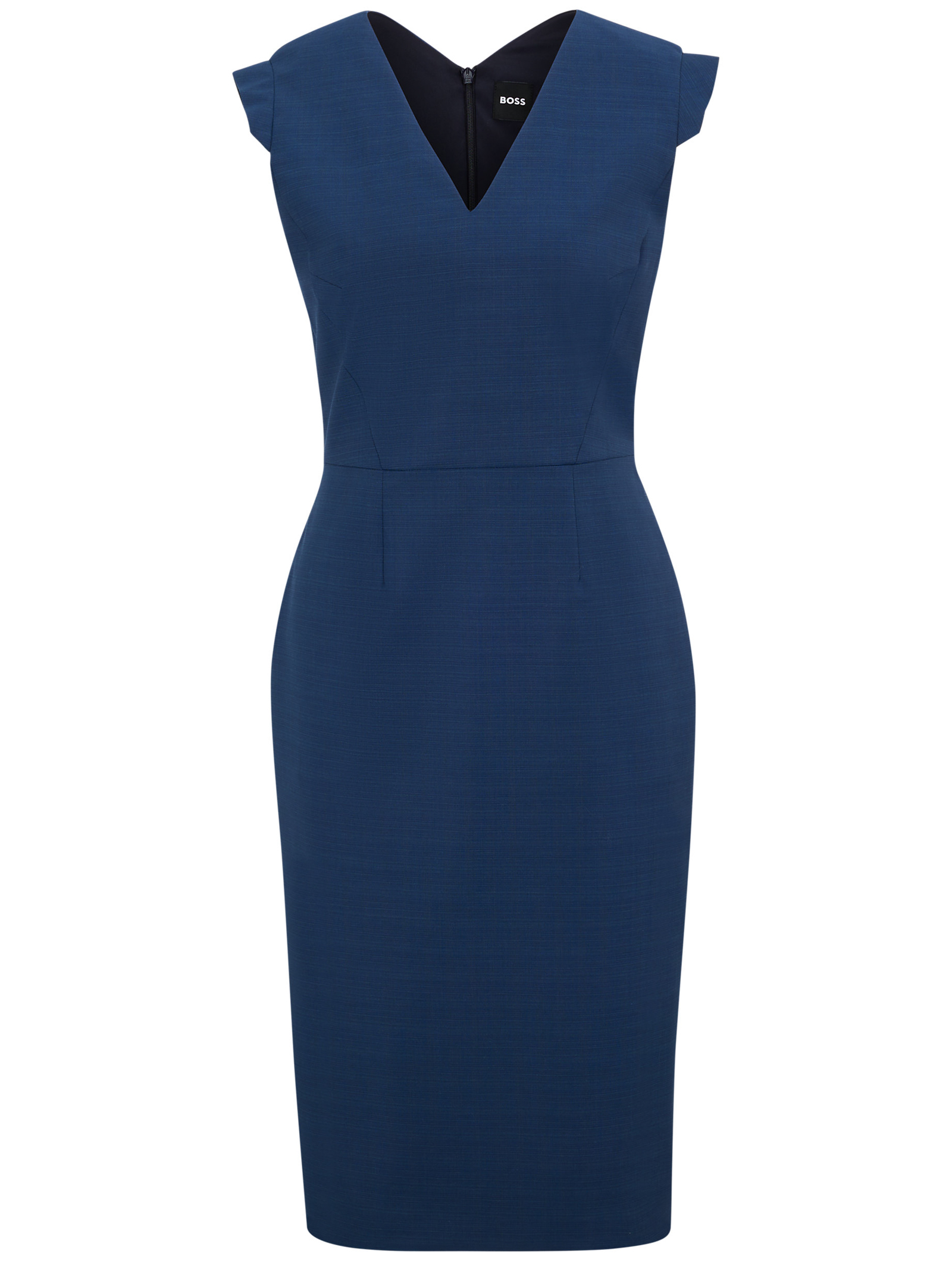 Elegantes BOSS Business-Kleid. Das feminine Kleid mit zeitgemäßen Flügelärmeln und V-Ausschnitt ist aus melierter Schurwolle gefertigt. Ein glattes Innenfutter und ein verdeckter Reißverschluss auf der Rückseite runden den Style ab.