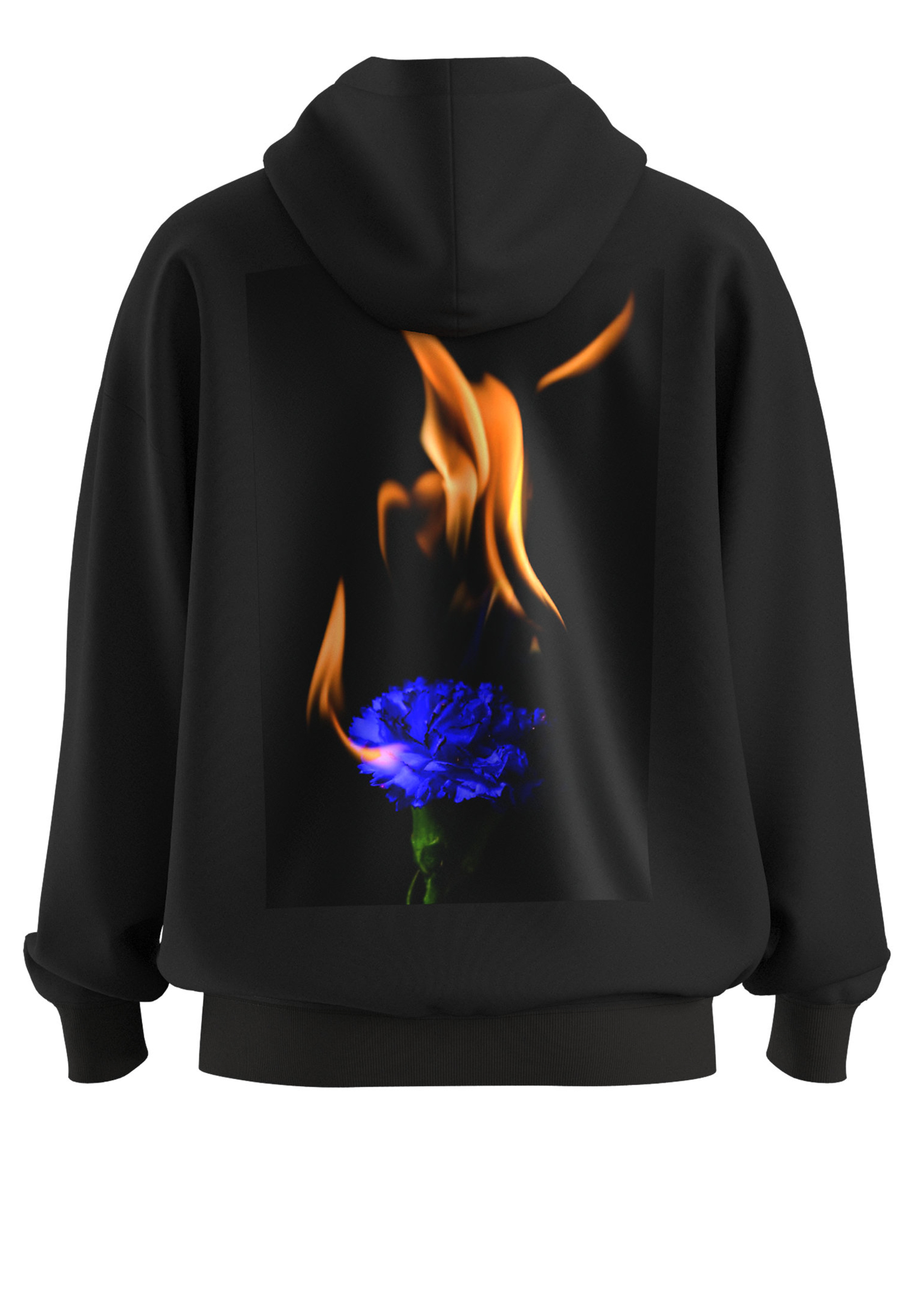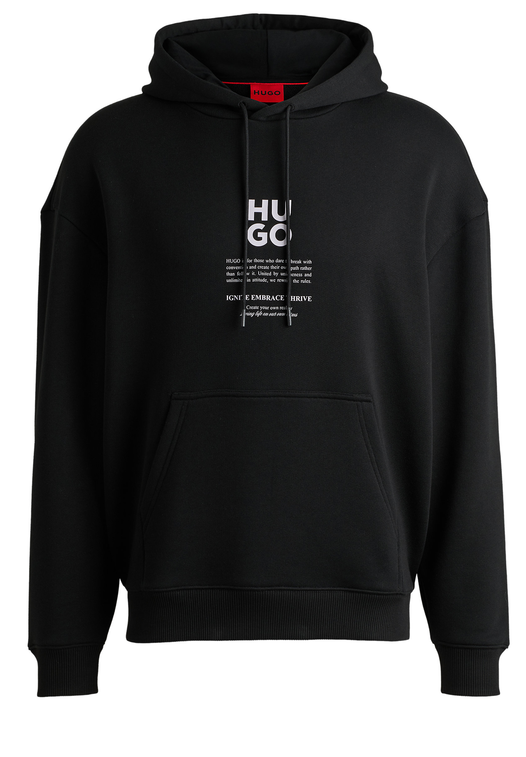 HUGO Hoodie mit Oversize-Passform und charakteristischer Botschaft. Der Layer aus einem Baumwoll-Mix ist auf der Rückseite mit einem floralen Flammen-Artwork versehen.