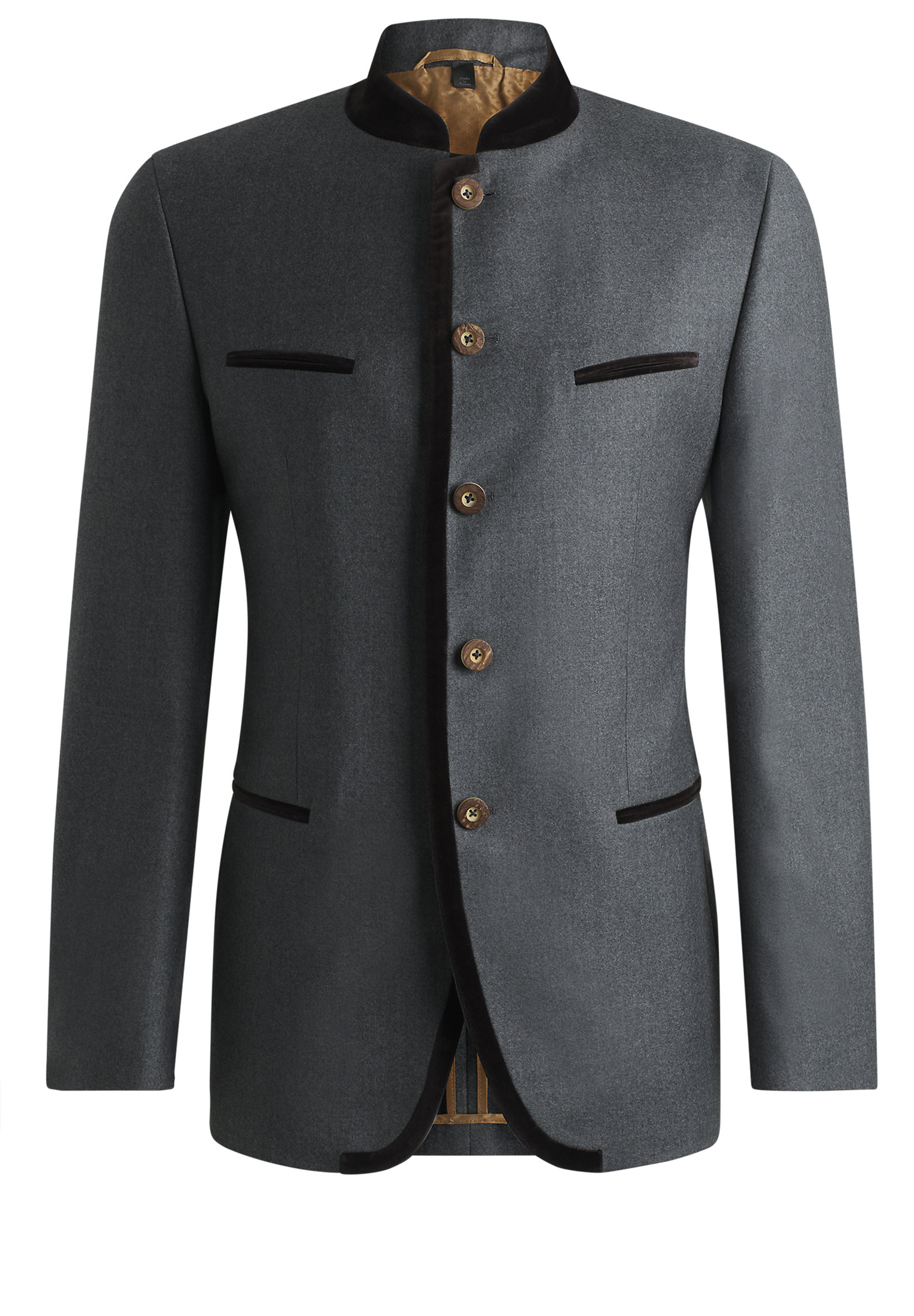 Präzise gefertigte BOSS Trachten-Jacke aus grauem Schurwoll-Flanell. Traditionelle Details wie ein Stehkragen runden den Style ab. Aus einer limitierten BOSS Kollektion mit traditionellen Trachten-Styles für Herren.
