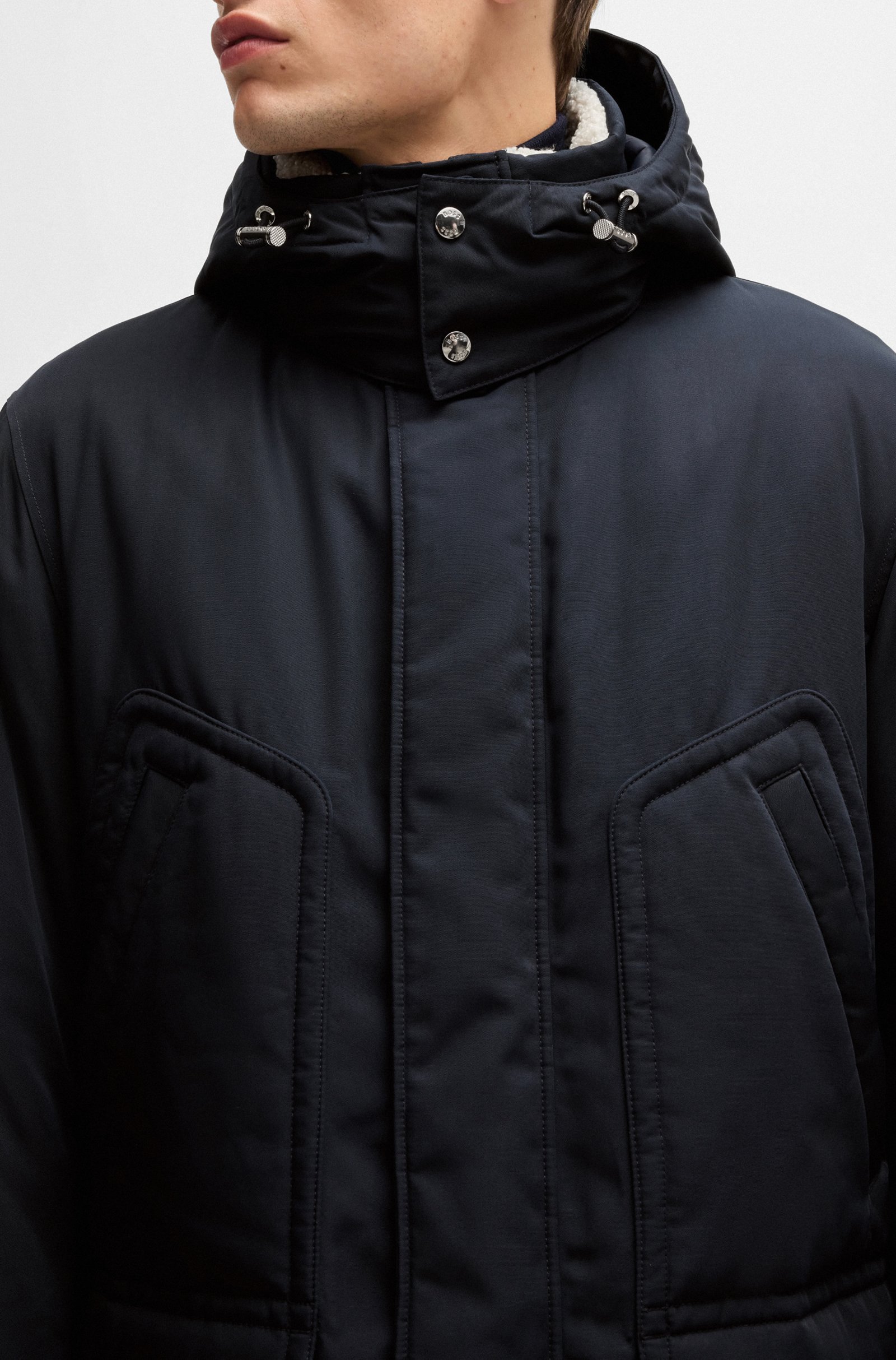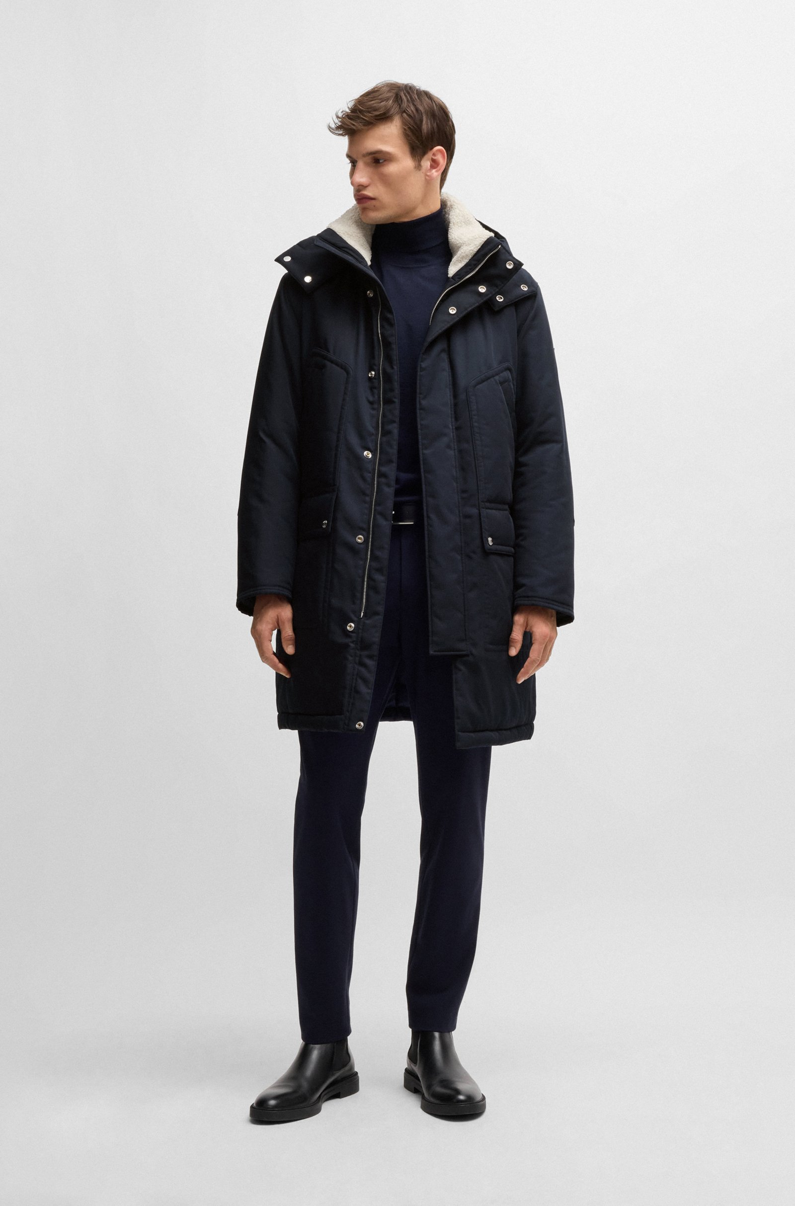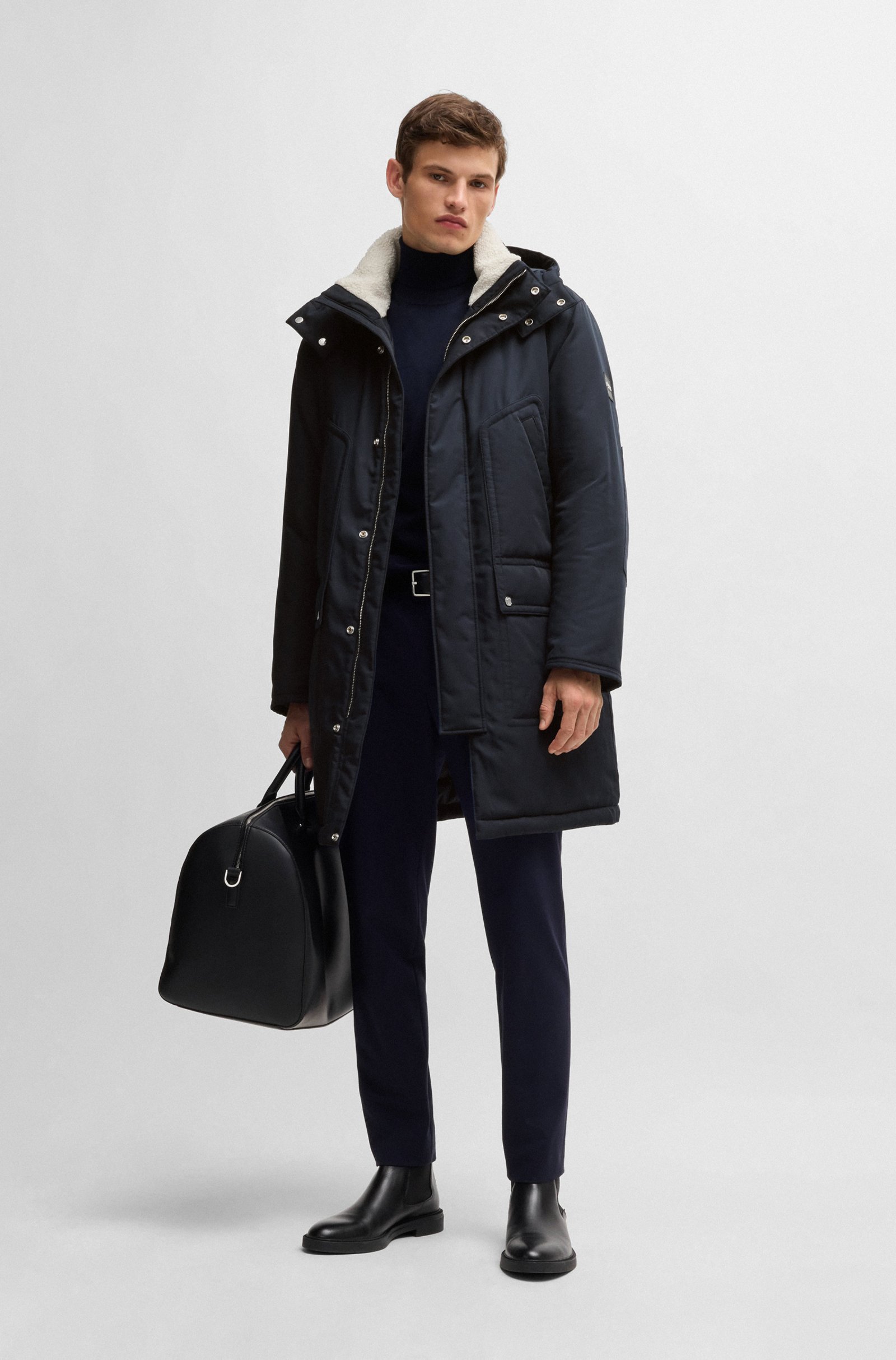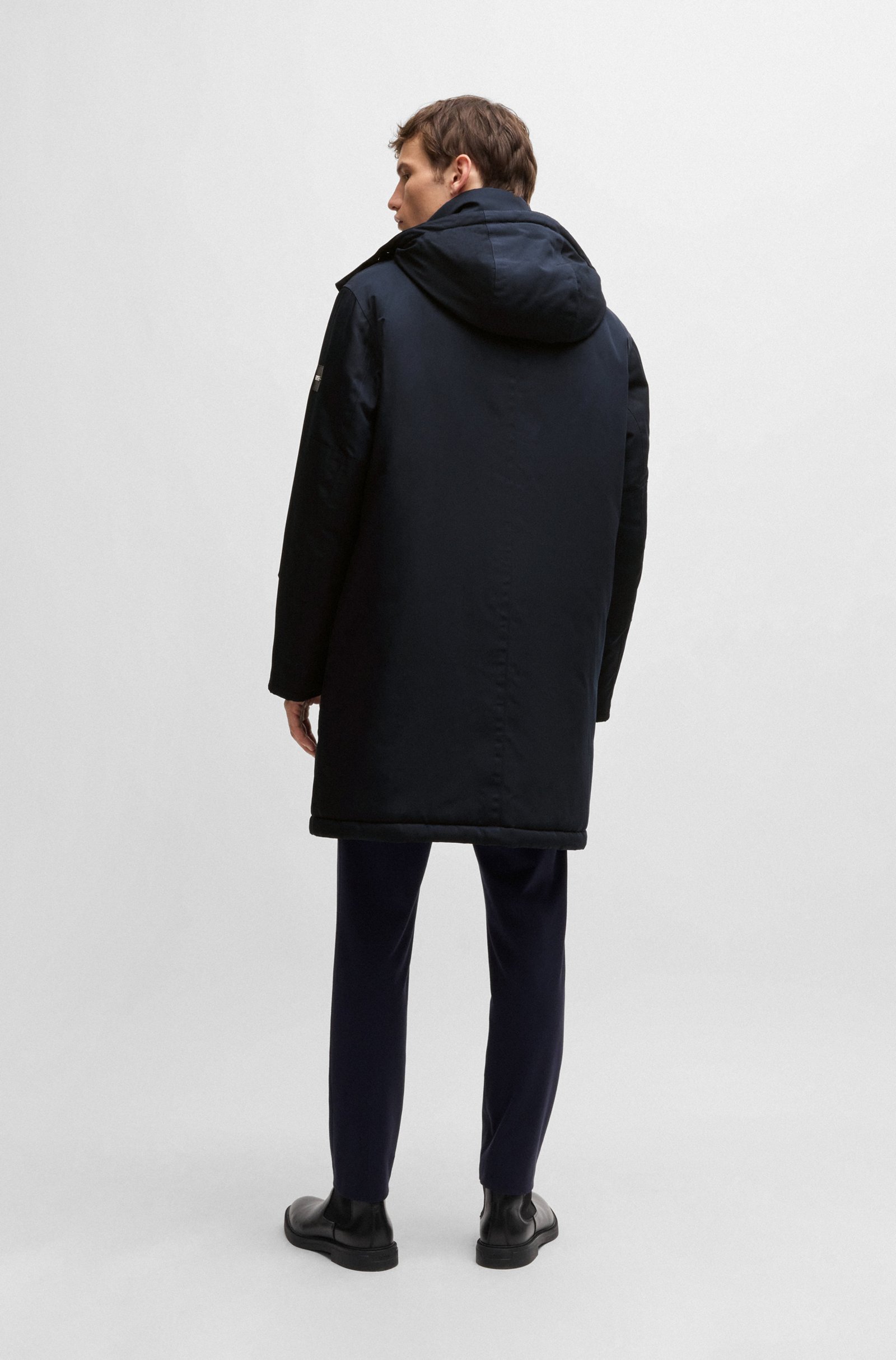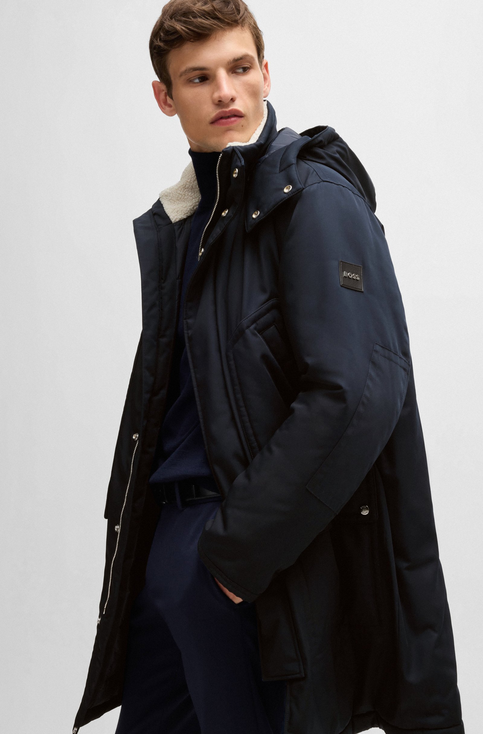 Zeitgemäße BOSS Jacke mit abnehmbarer Kapuze. Die gerade geschnittene Outerwear ist aus softem Canvas mit wasserabweisendem Finish gefertigt. Das Produkt wird teilweise aus recyceltem Polyester gefertigt. Wir bei HUGO BOSS bevorzugen recycelten Polyester aus Materialabfällen und gebrauchten Stoffresten und geben unser Bestes, um von Polyester aus PET-Flaschen umzusteigen. Durch die Verwendung von recycelten Materialien werden kostbare Ressourcen gespart.