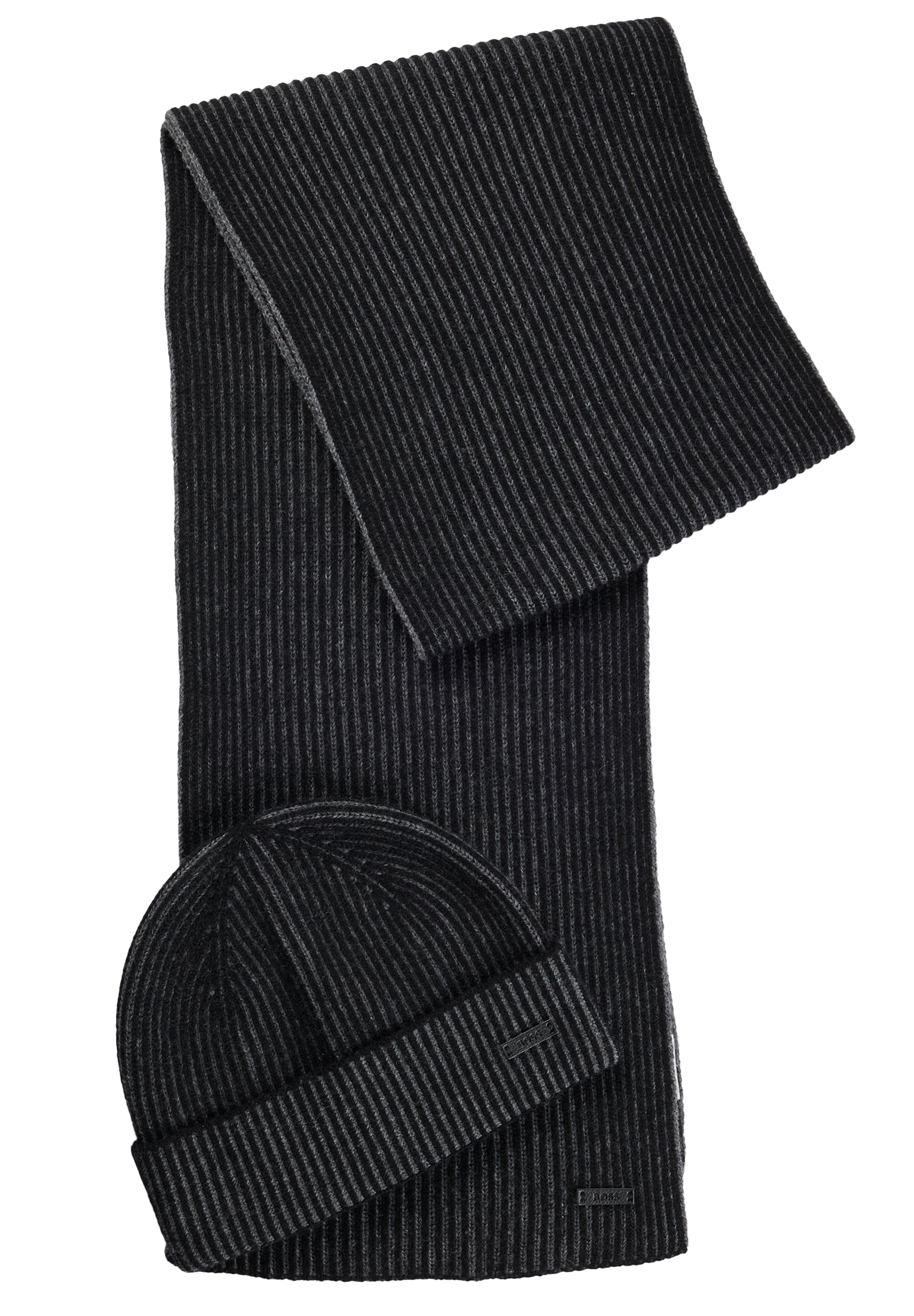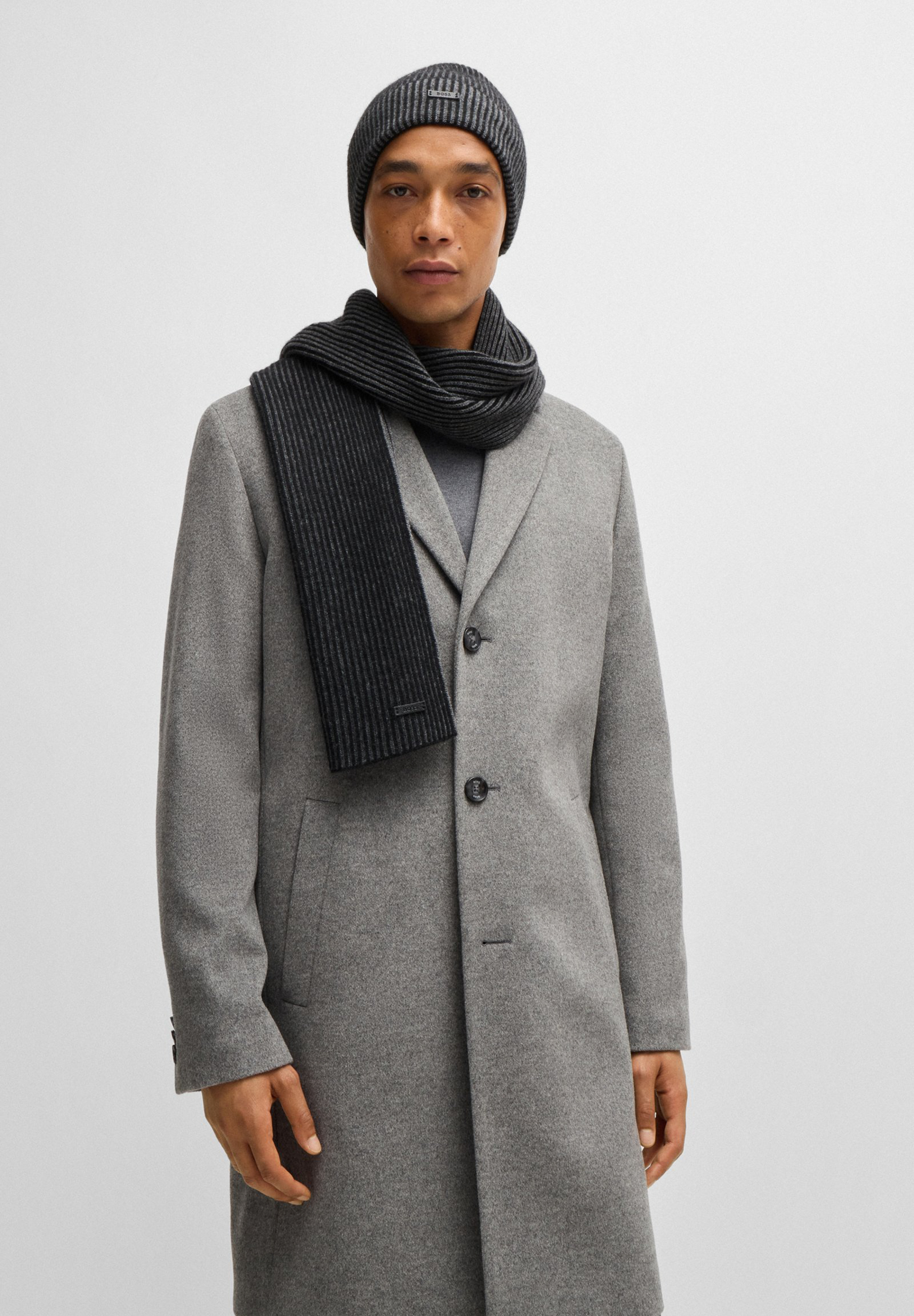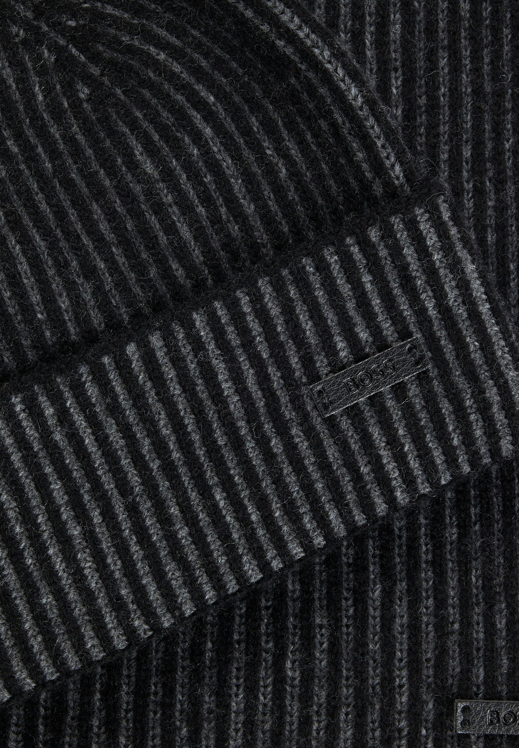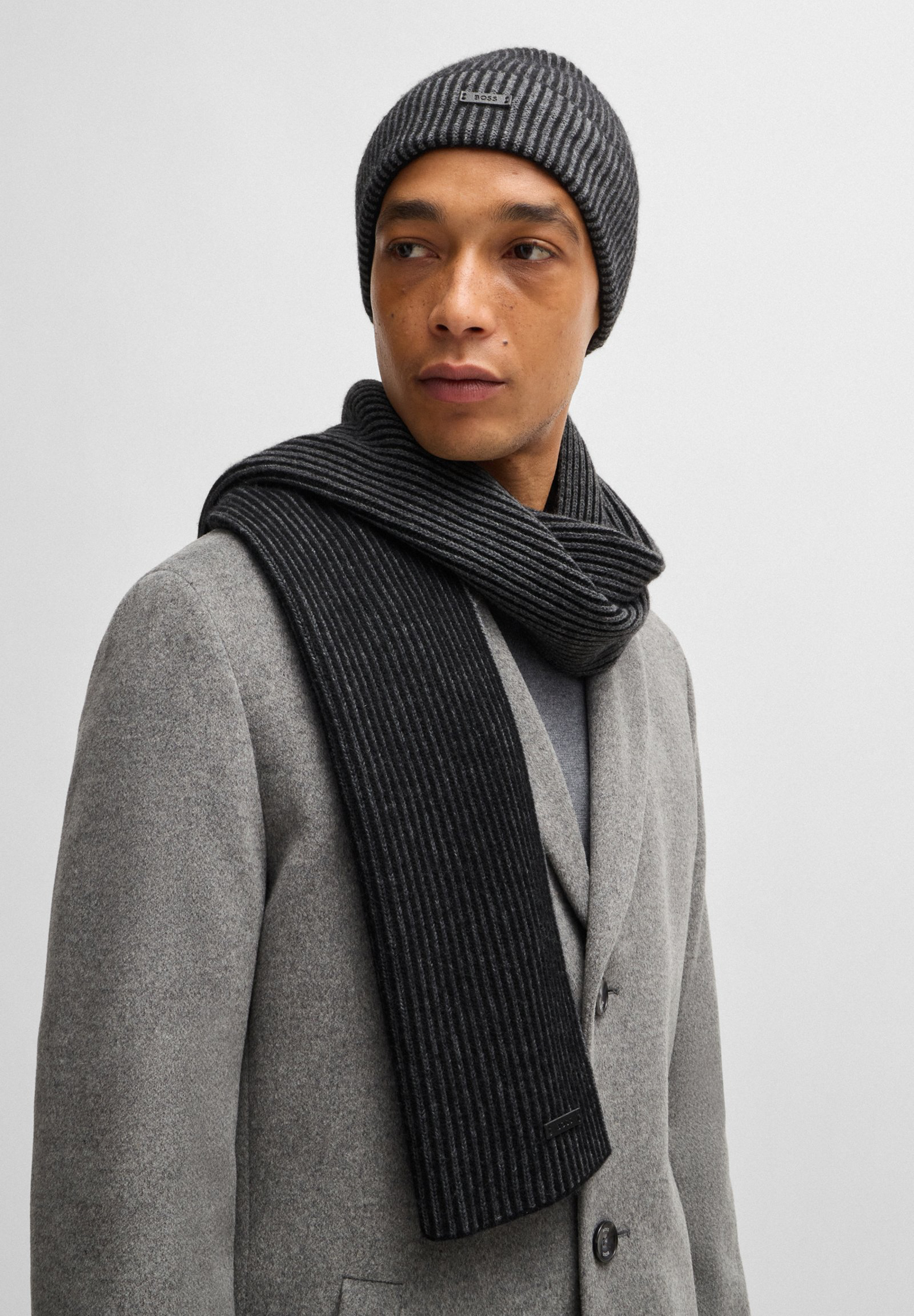 BOSS Mütze und Schal aus einem Material-Mix mit Woll- und Kaschmir-Anteil in einer Geschenkbox. Beide Accessoires sind mit einem Logo-Etikett aus synthetisch beschichtetem Textil versehen. Synthetisch beschichtetes Textil, manchmal auch als Kunstleder bezeichnet, ist ein Gewebe, das echtem Leder ähnelt und/oder ein mattes, glänzendes, glattes oder strukturiertes beschichtetes Erscheinungsbild aufweist.  Dieses Produkt wurde mit recyceltem Polyamid aus Materialabfällen und gebrauchten Stoffresten oder industriellen Fischernetzen hergestellt. Durch die Verwendung von recycelten Materialien werden kostbare Ressourcen gespart.