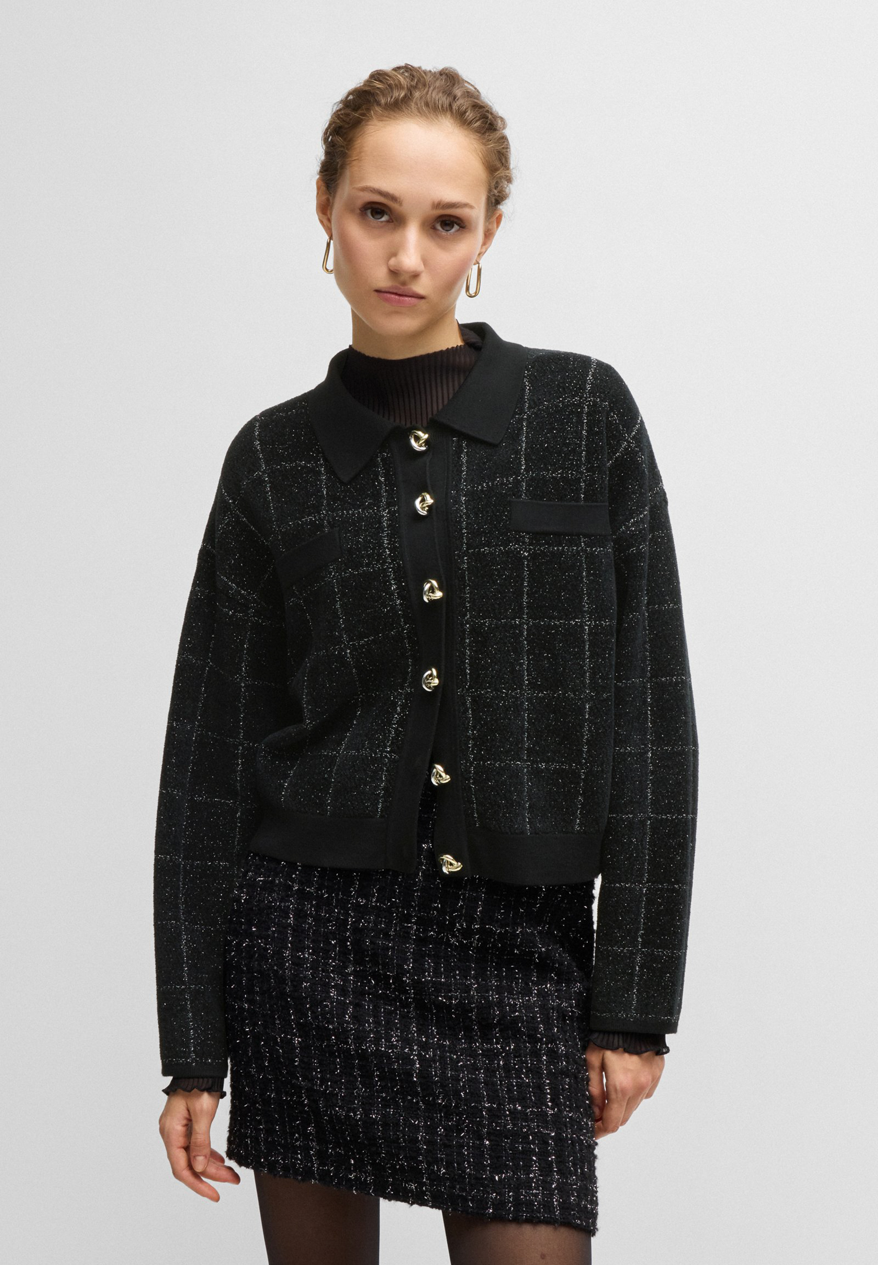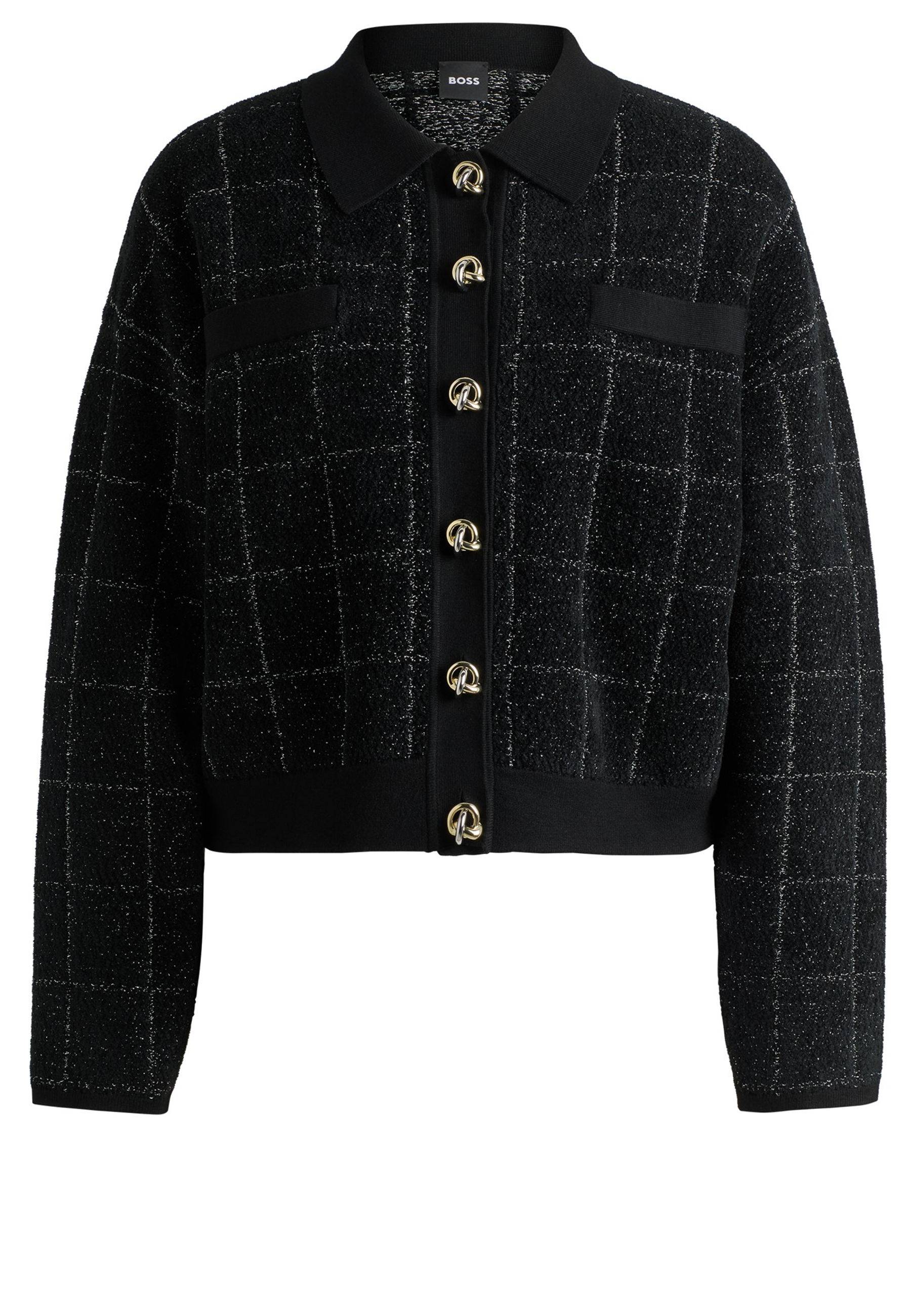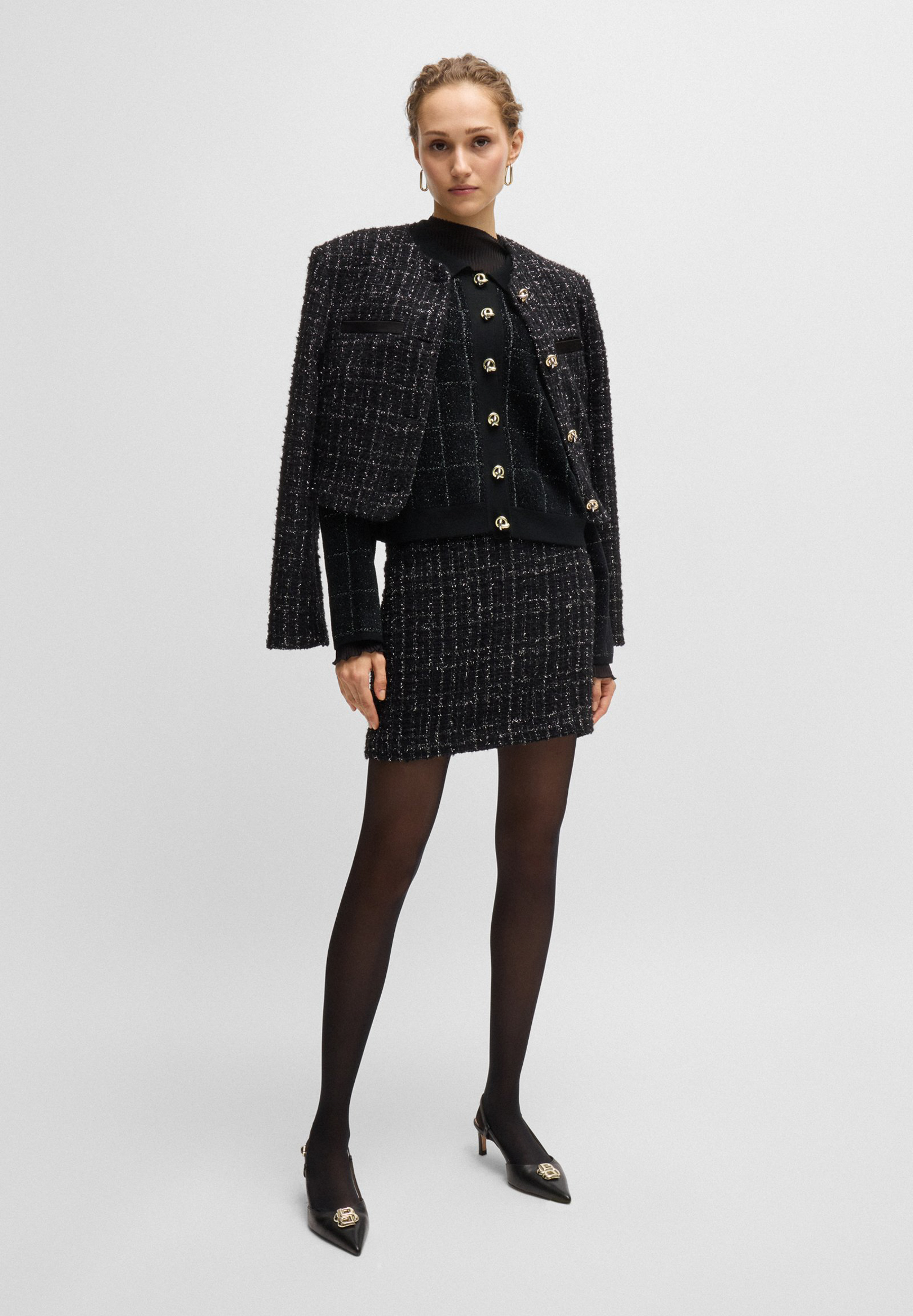 Eine elegante Jacke mit Feature-Knoten von BOSS. Konzipiert, um sich mit dem passenden Rock zu koordinieren, ist dieses Stück in funkelnden Tweed gefertigt.