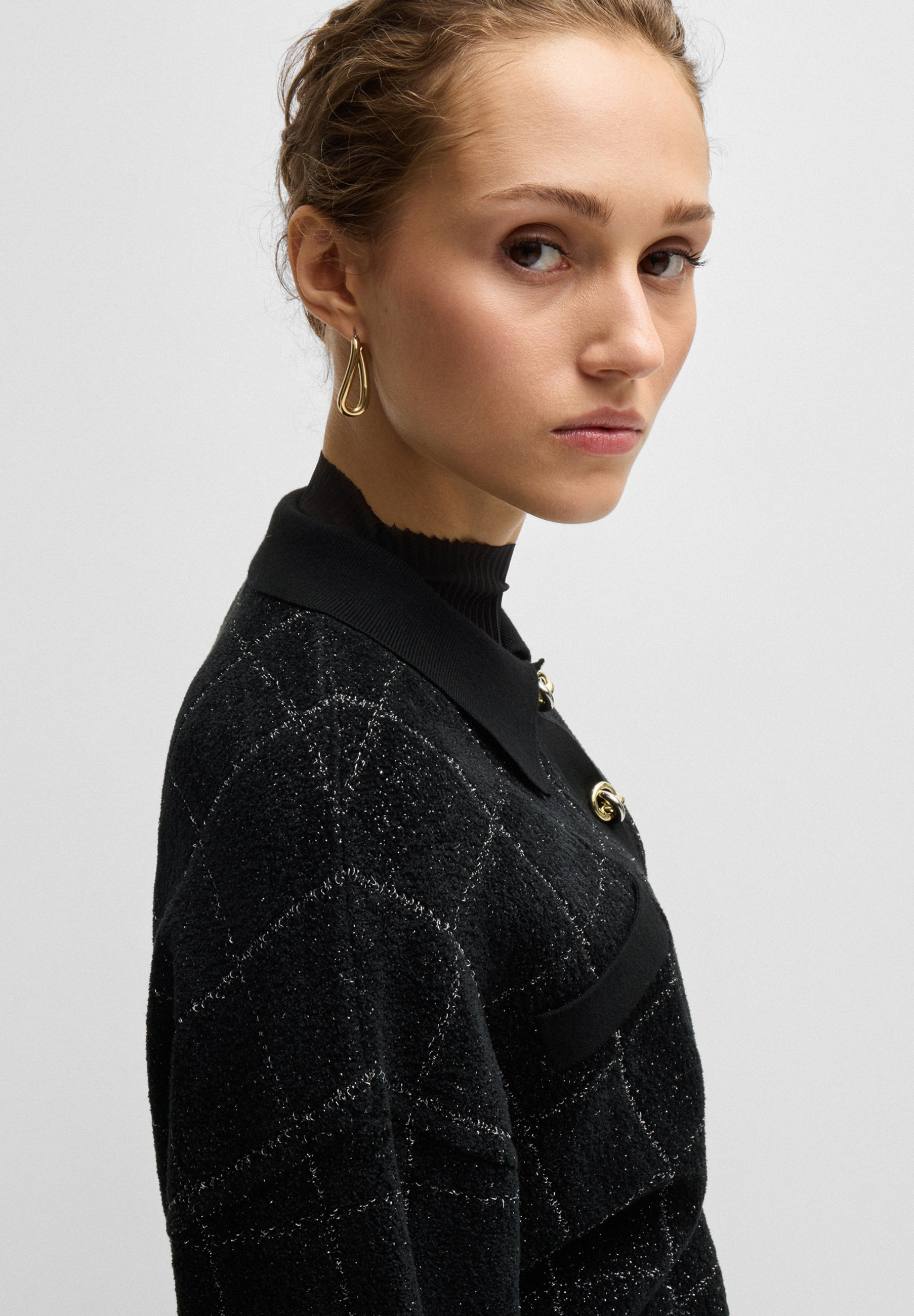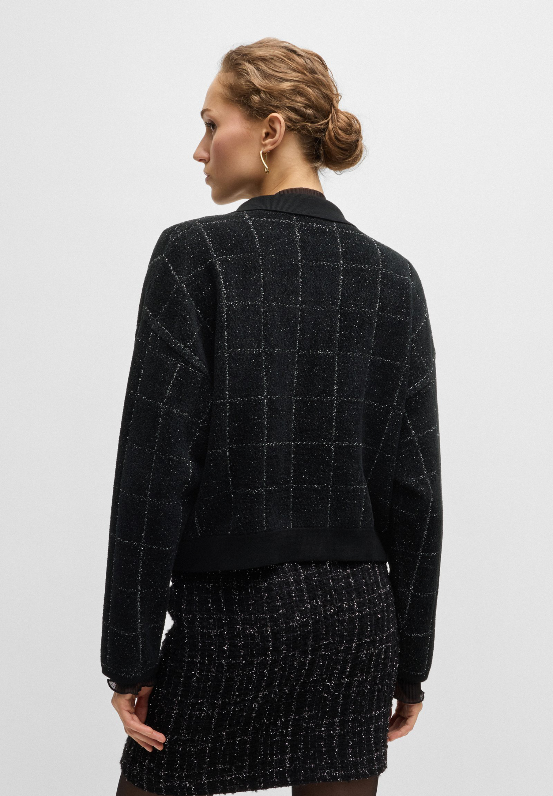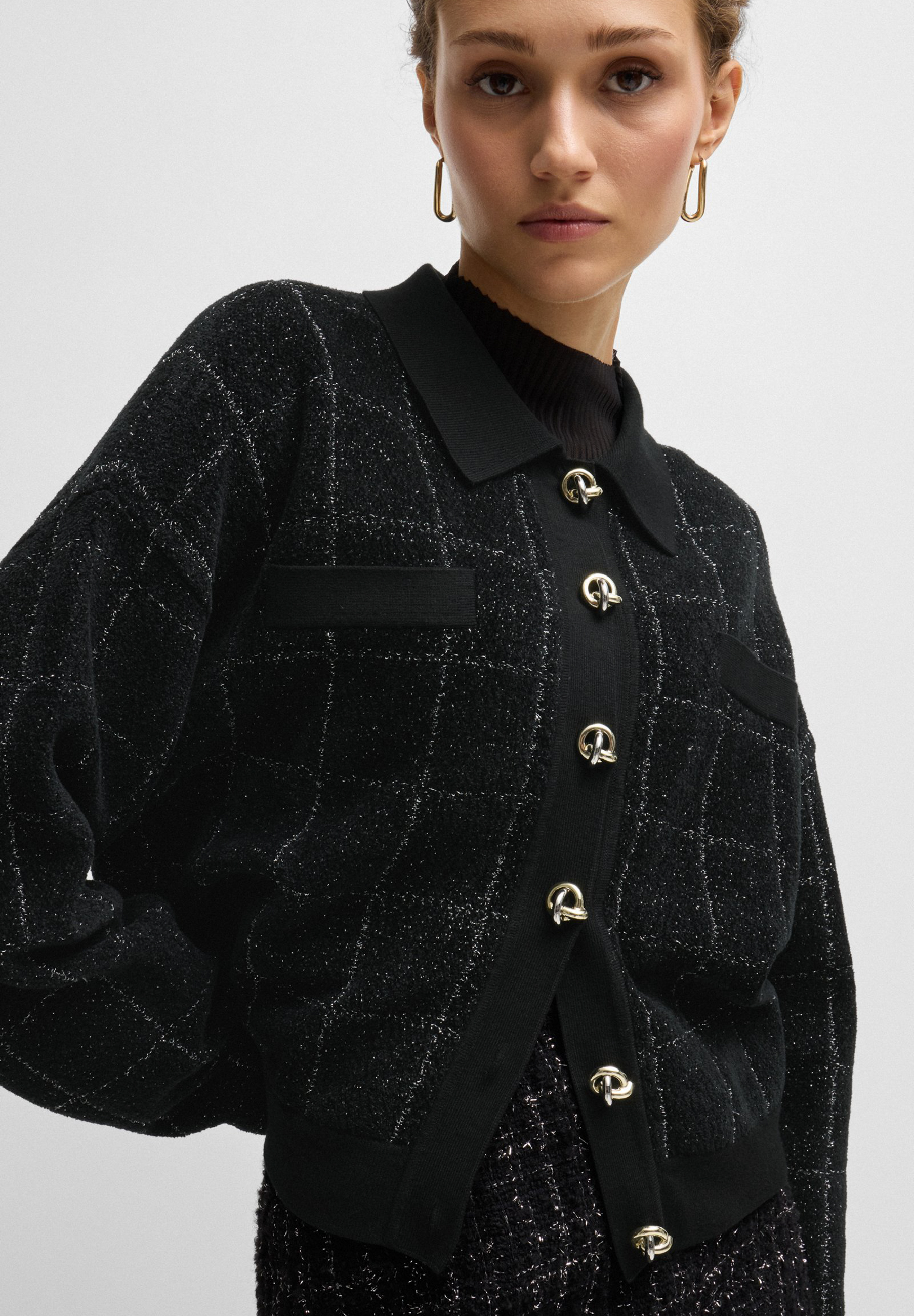 Eine elegante Jacke mit Feature-Knoten von BOSS. Konzipiert, um sich mit dem passenden Rock zu koordinieren, ist dieses Stück in funkelnden Tweed gefertigt.