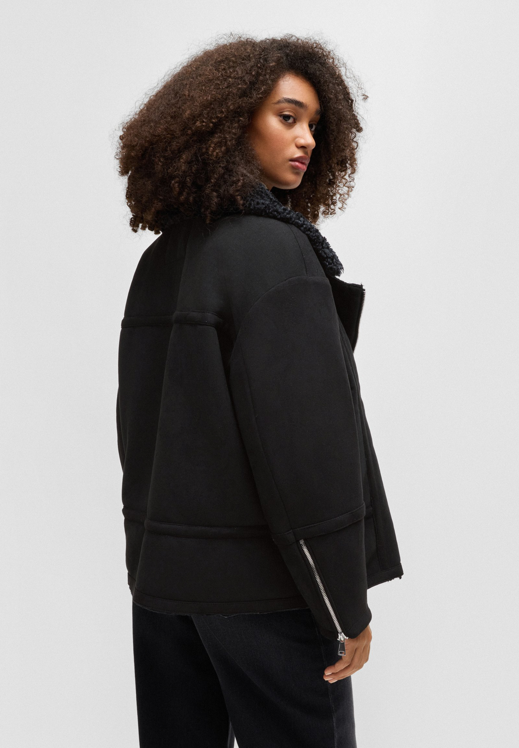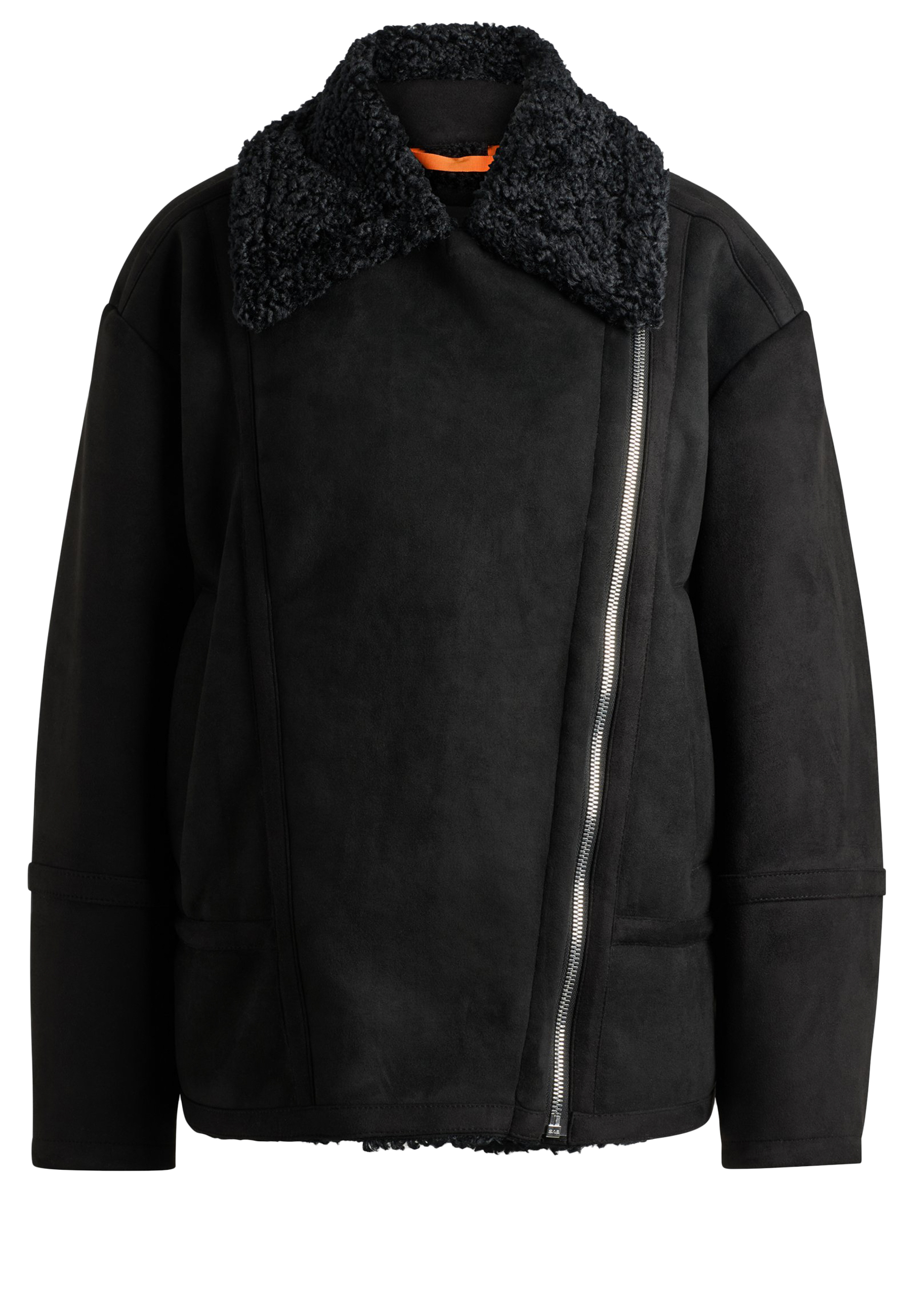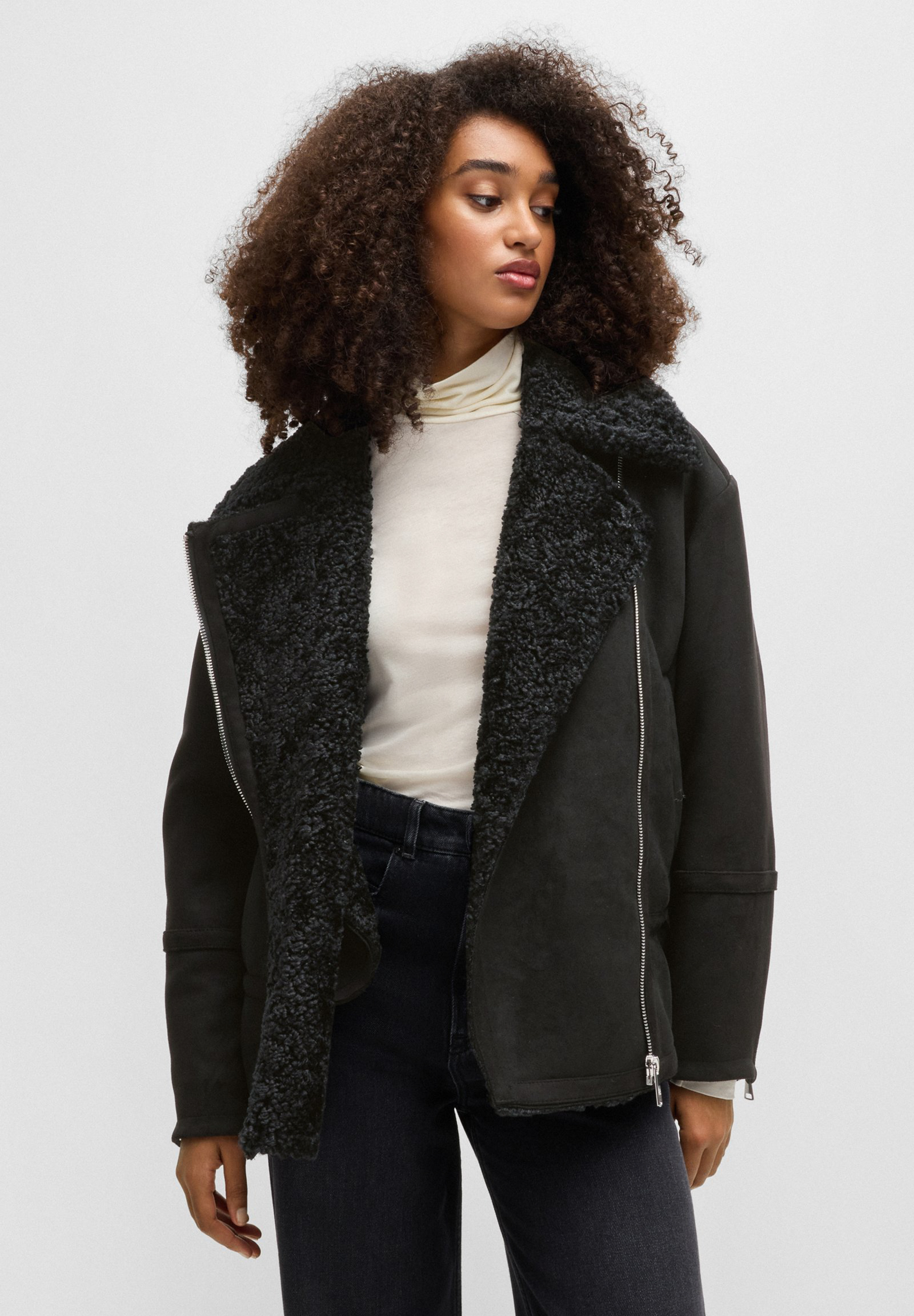 Kuscheliger, wattierter BOSS Mantel. Die Outerwear im Piloten-Stil ist aus einem Material-Mix in Veloursleder-Optik und Shearling-Imitat gefertigt und mit einem asymmetrischen Reißverschluss versehen.