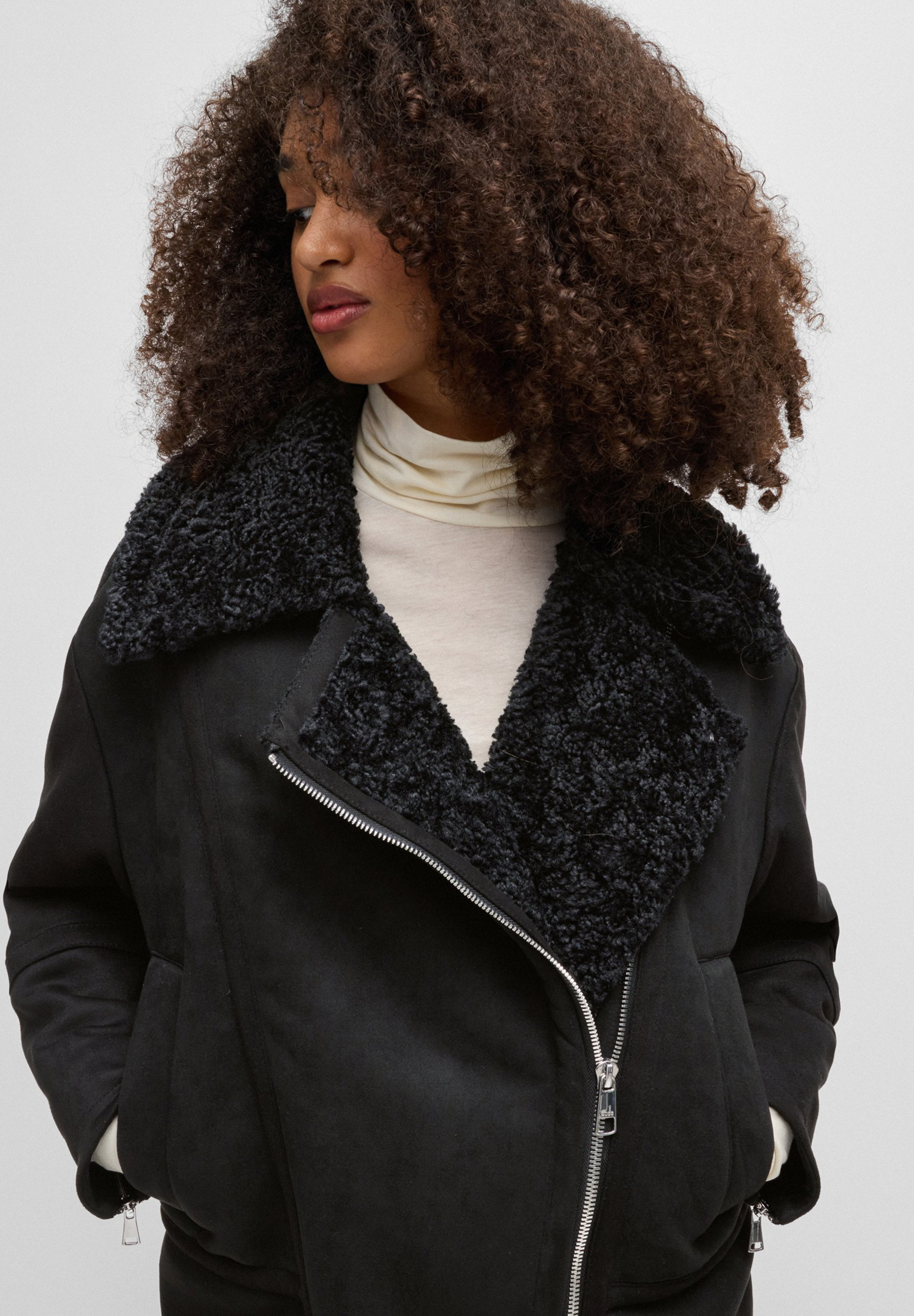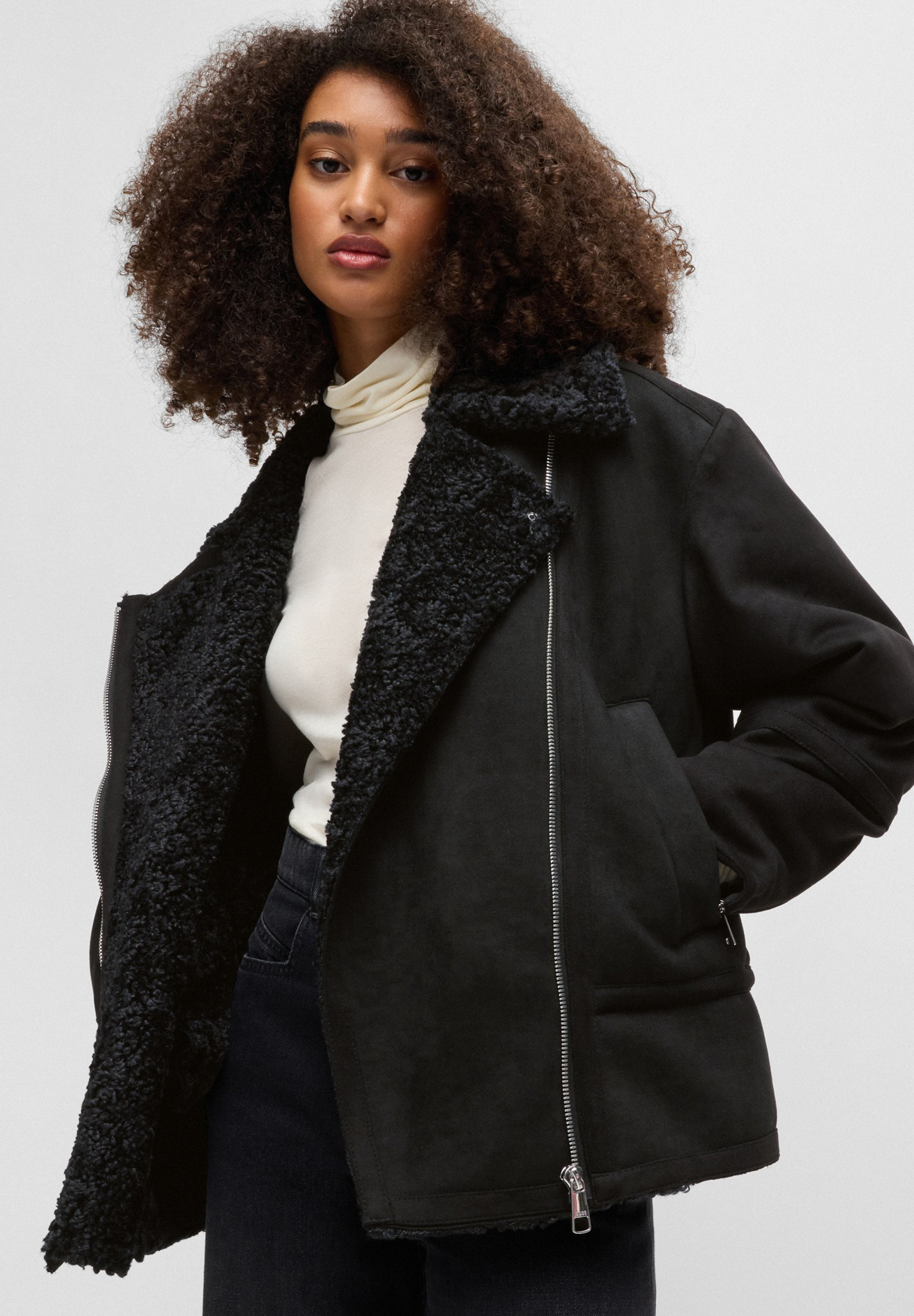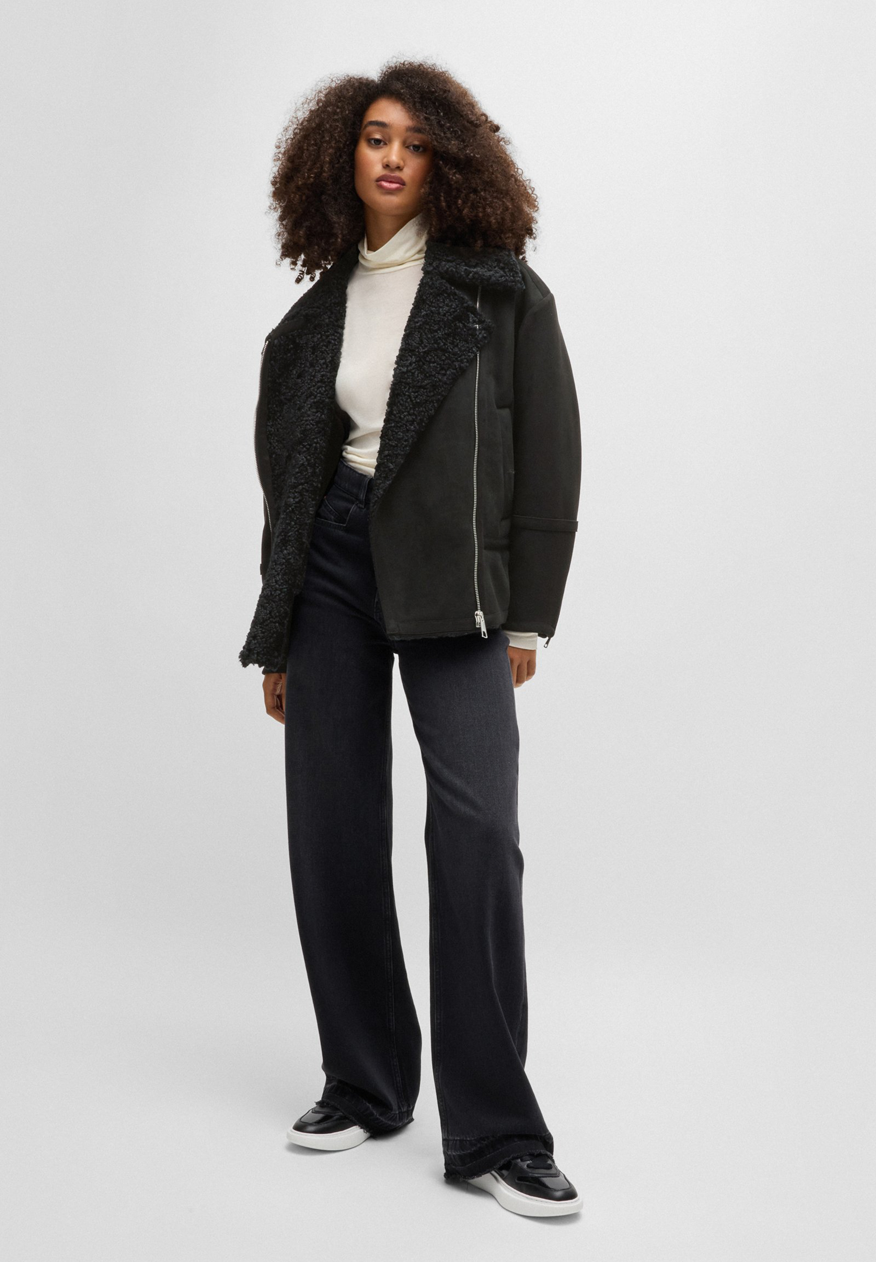 Kuscheliger, wattierter BOSS Mantel. Die Outerwear im Piloten-Stil ist aus einem Material-Mix in Veloursleder-Optik und Shearling-Imitat gefertigt und mit einem asymmetrischen Reißverschluss versehen.