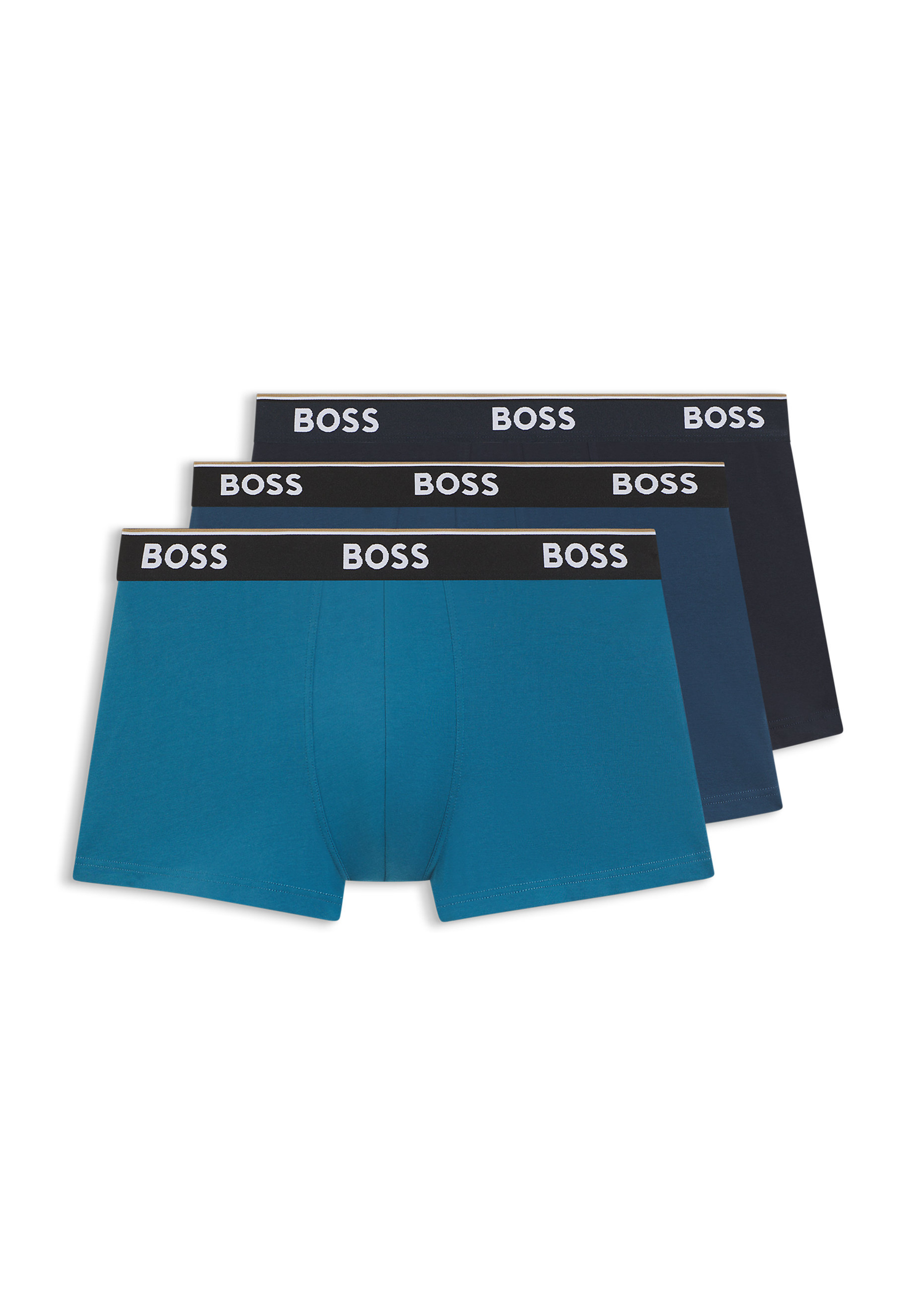Eng anliegende BOSS Boxershorts mit kurzem Bein, die aus komfortablem Baumwoll-Jersey mit Elasthan-Anteil gefertigt sind. Die Unterwäsche mit mittlerer Bundhöhe ist mit Signature-Streifen und mehreren Logos versehen.
