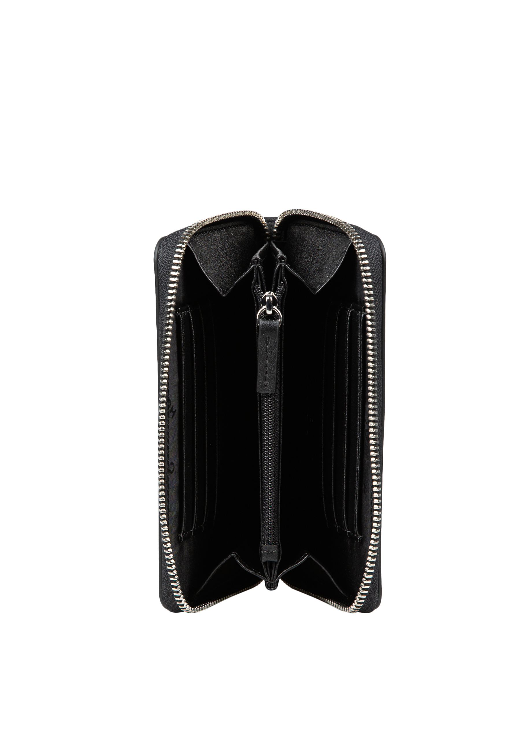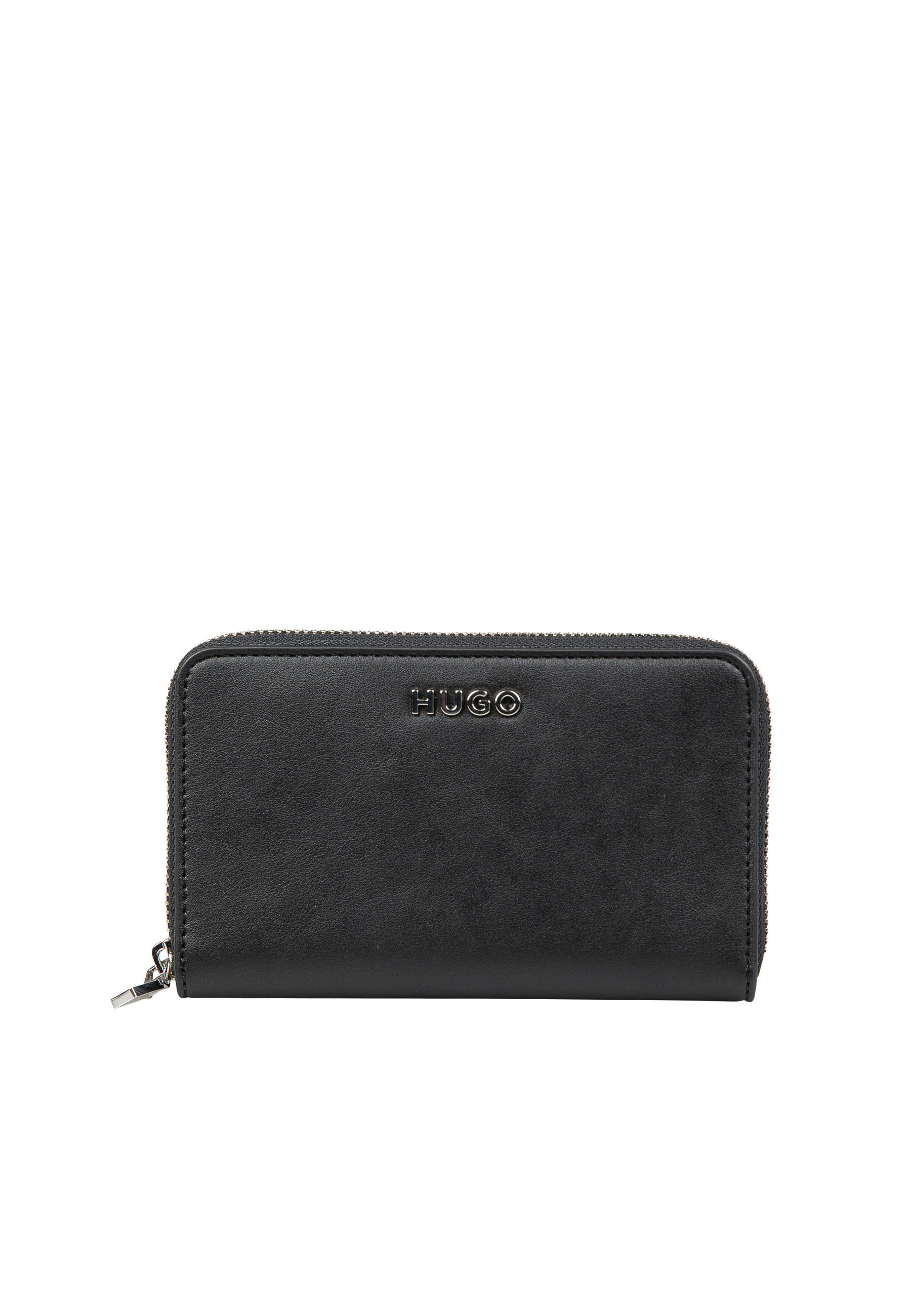 Zeitgemäße HUGO Geldbörse mit poliertem Logo-Schriftzug. Das Accessoire mit umlaufendem Reißverschluss ist aus einem synthetisch beschichteten Textil mit glattem Finish gefertigt. Synthetisch beschichtetes Textil, manchmal auch als Kunstleder bezeichnet, ist ein Gewebe, das Echtleder ähnelt und/oder ein mattes, glänzendes, glattes oder strukturiertes beschichtetes Erscheinungsbild aufweist.