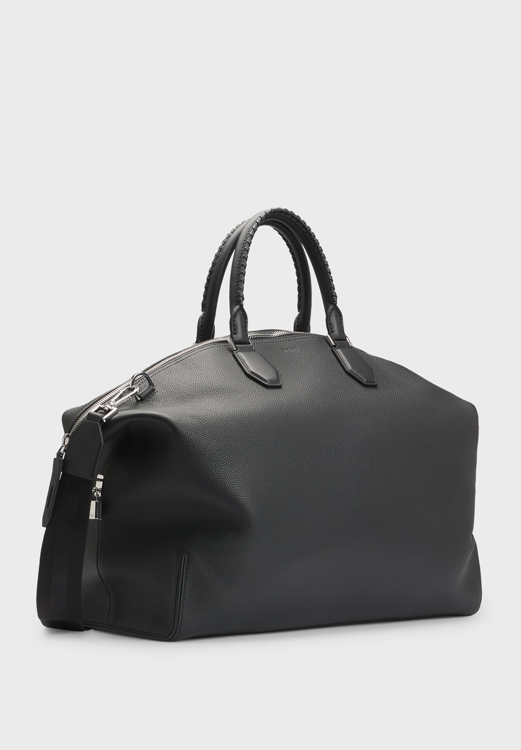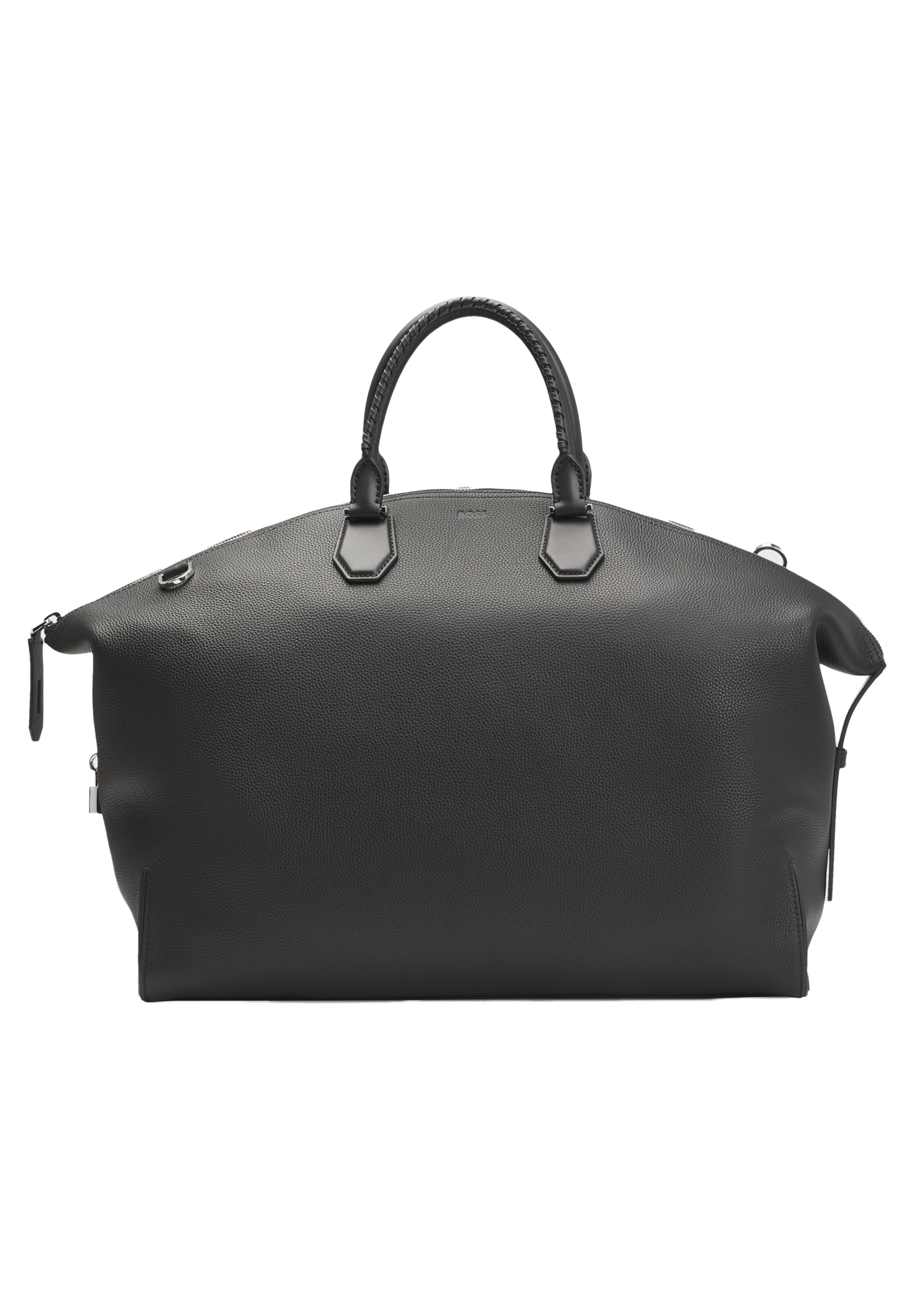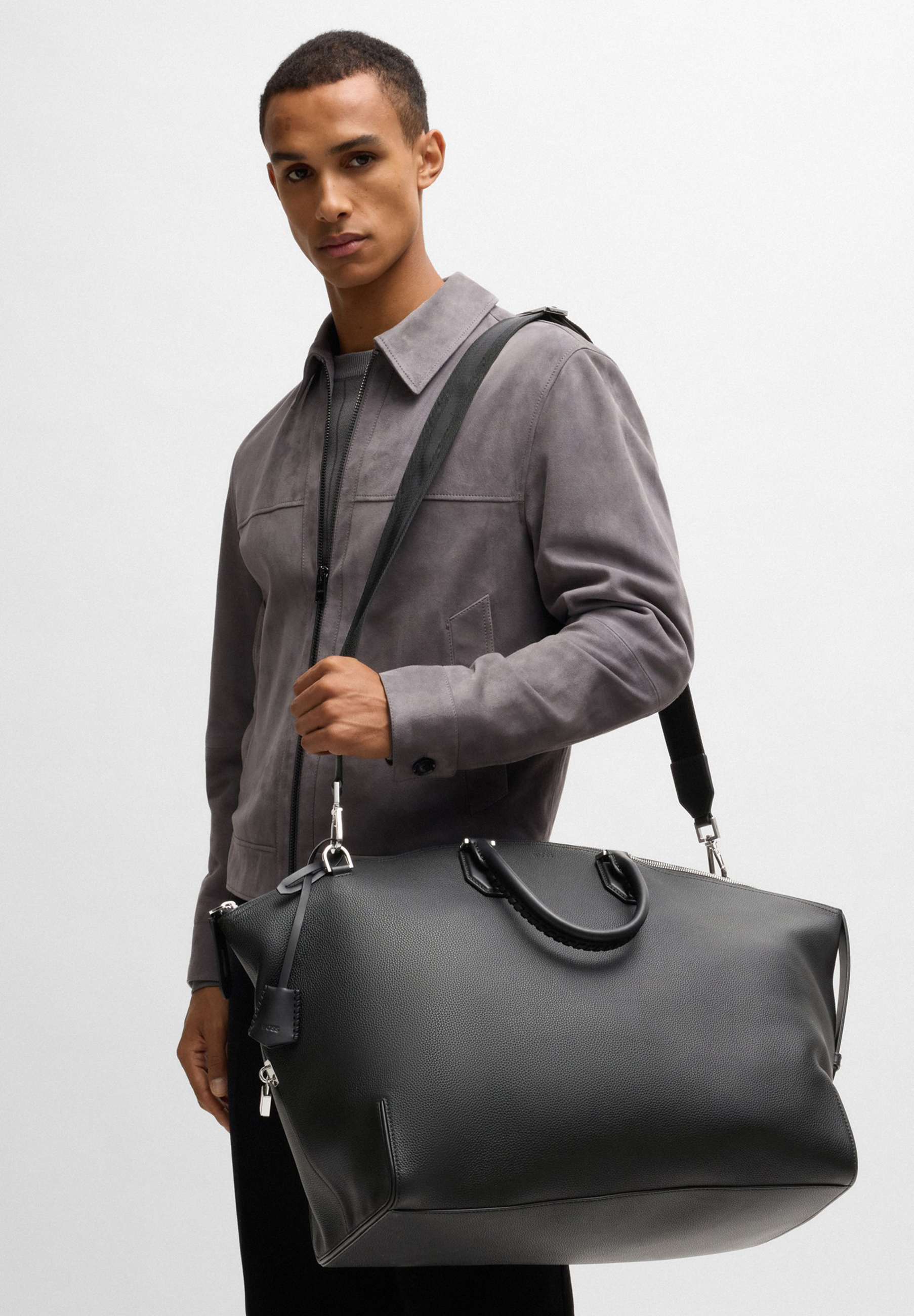 Charakteristischer BOSS Weekender aus genarbtem Leder. Das Accessoire ist mit abnehmbaren Details wie einem praktischen Vorhängeschloss, einem Adressanhänger und einem Schlüsseletui ausgestattet.
