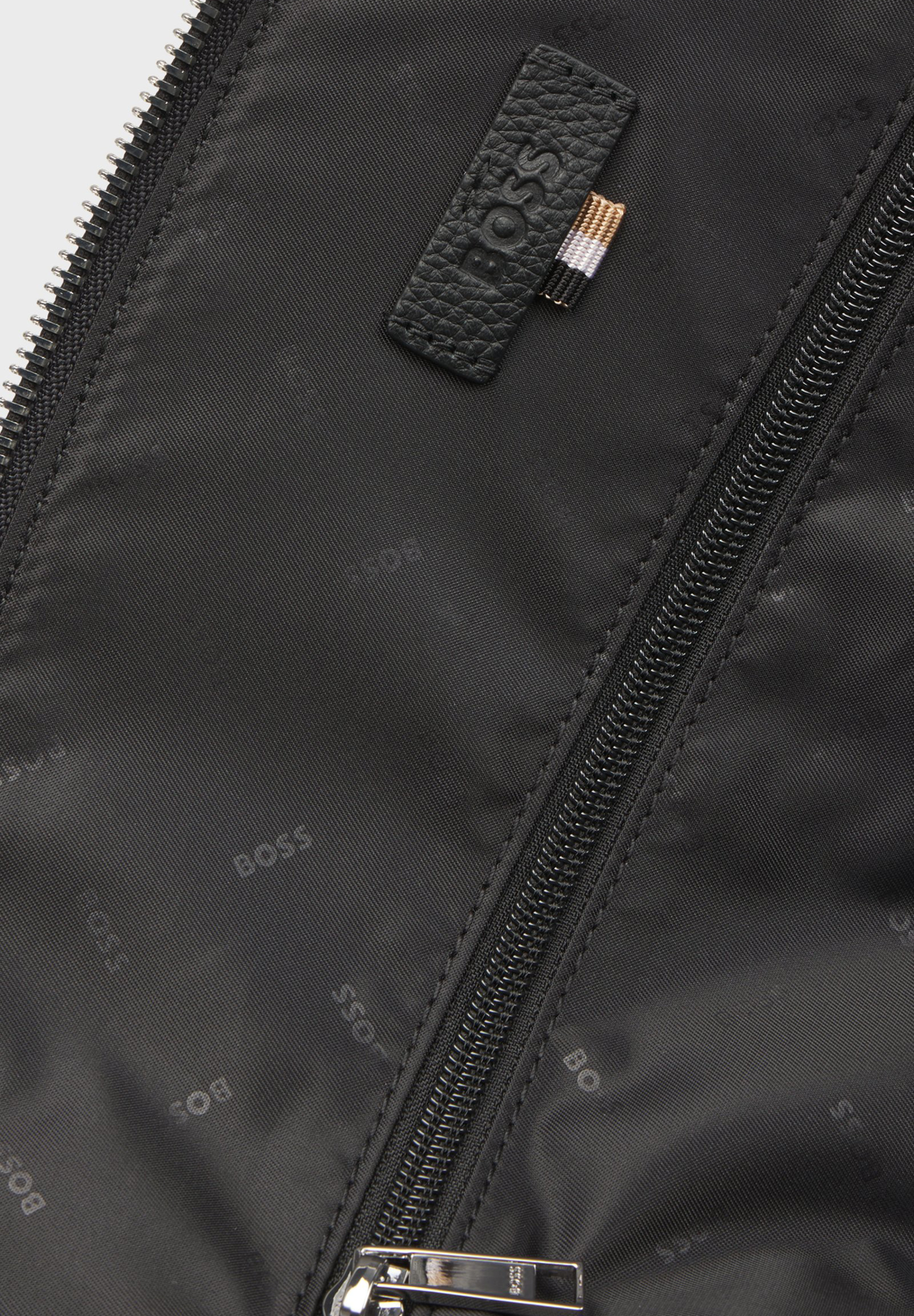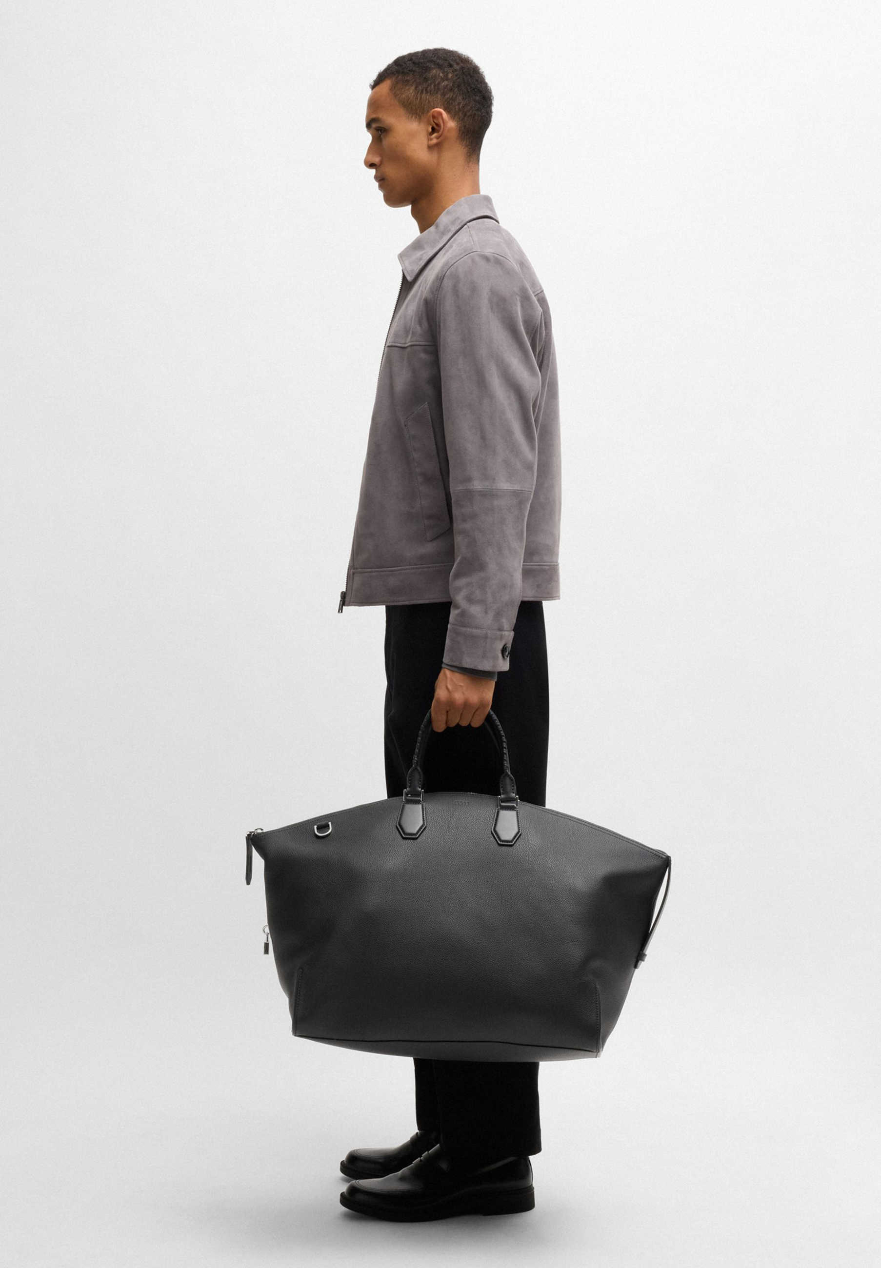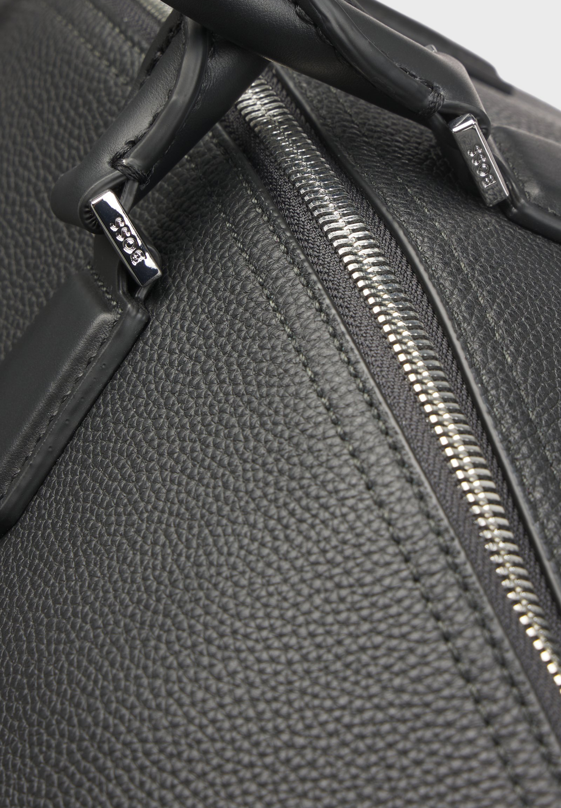 Charakteristischer BOSS Weekender aus genarbtem Leder. Das Accessoire ist mit abnehmbaren Details wie einem praktischen Vorhängeschloss, einem Adressanhänger und einem Schlüsseletui ausgestattet.