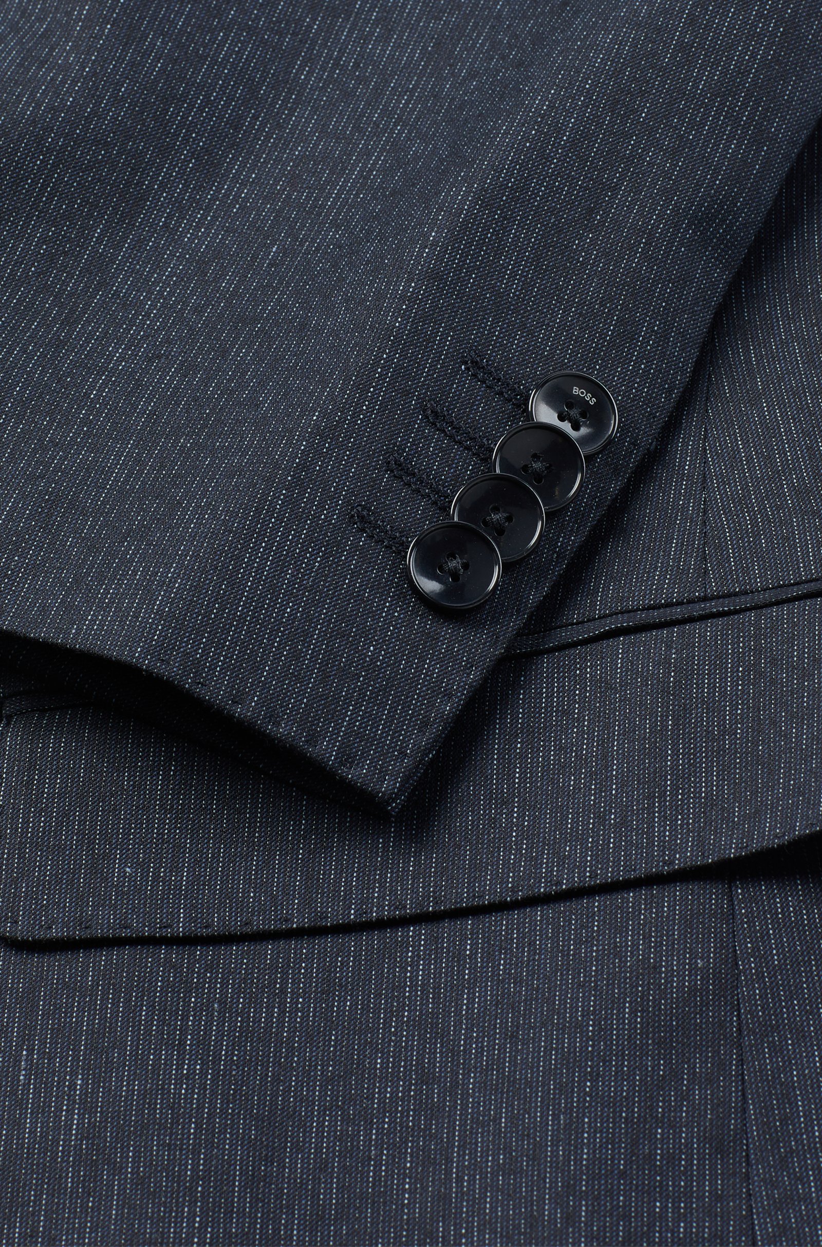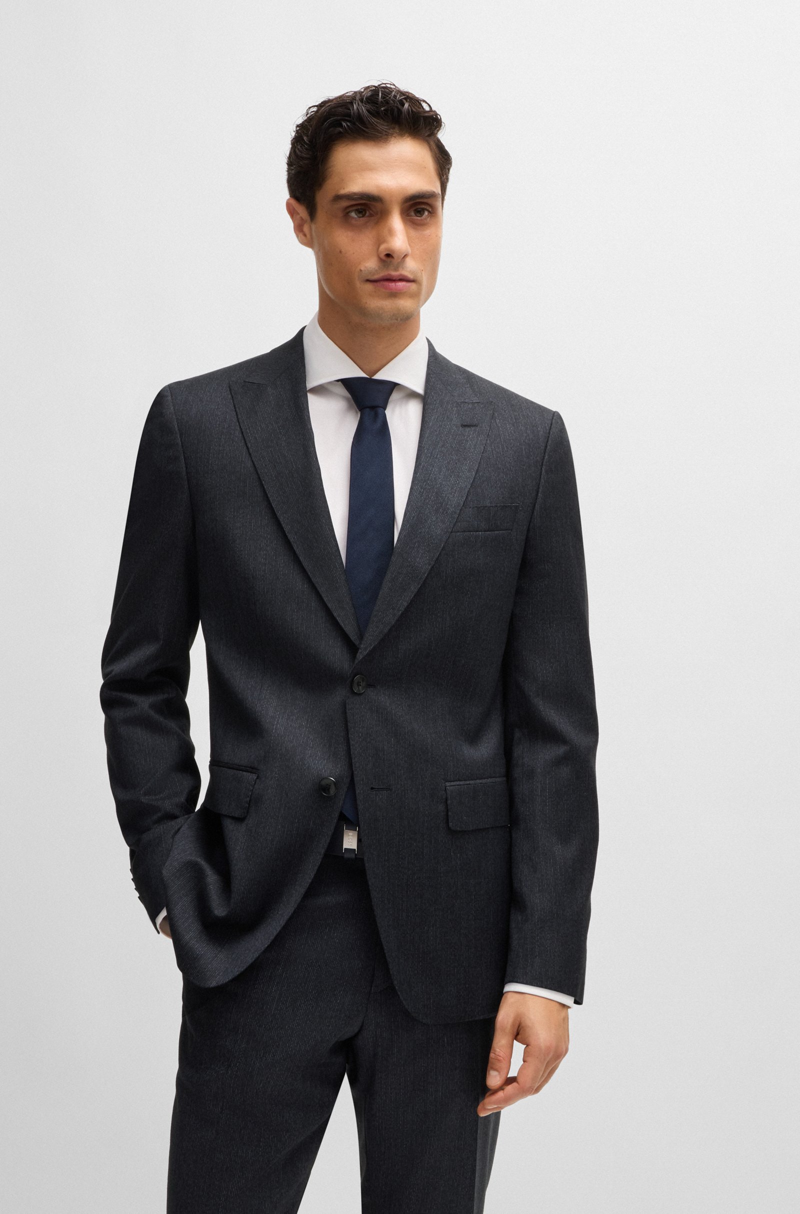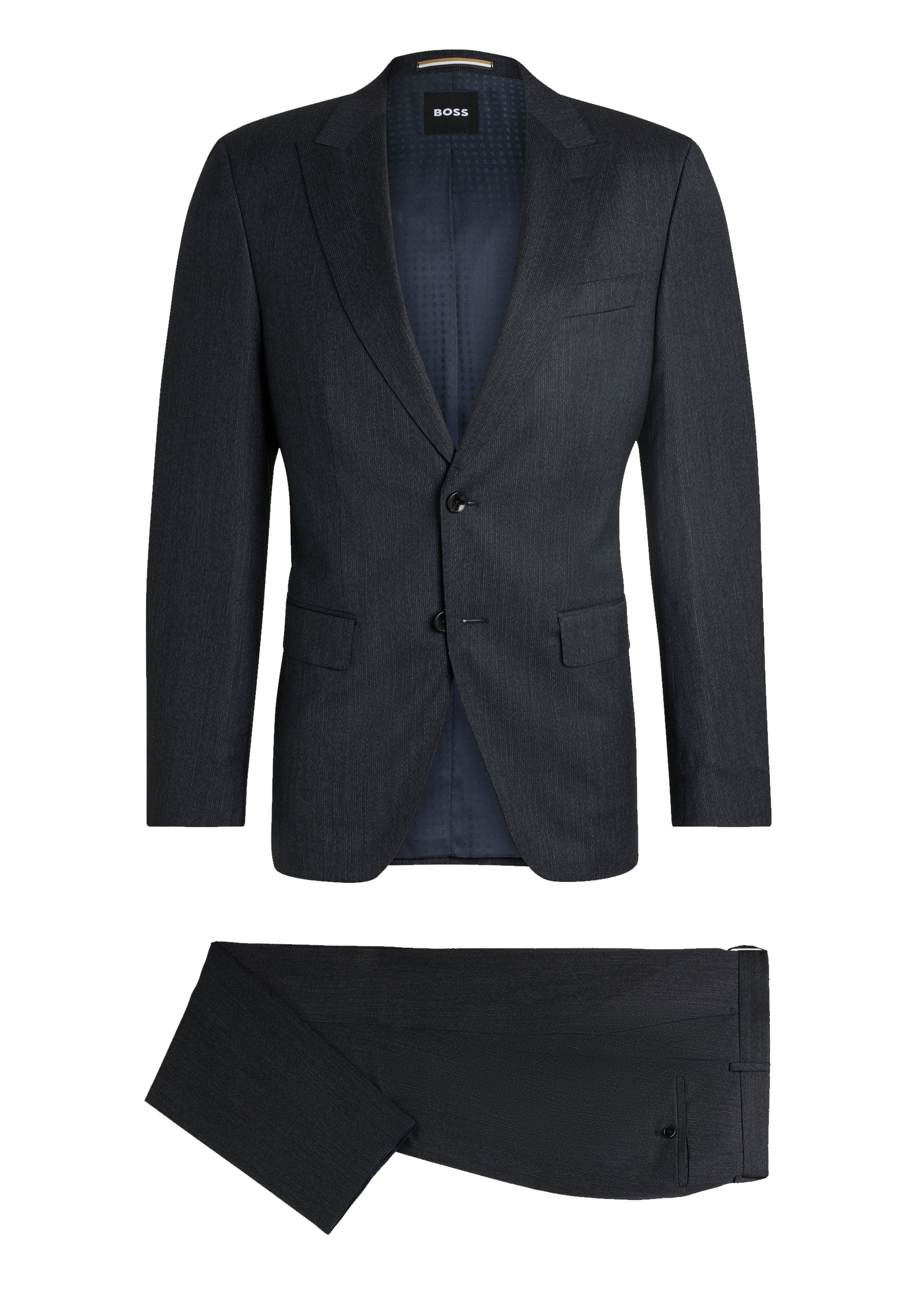 Schmal geschnittener BOSS Anzug mit konstruierten Schultern. Der elegante Zweiteiler ist aus einem elastischen Schurwoll-Mix mit dezentem Muster gefertigt und lässt sich vielseitig kombinieren. Ein charakteristisches Innenfutter rundet das Ensemble ab.