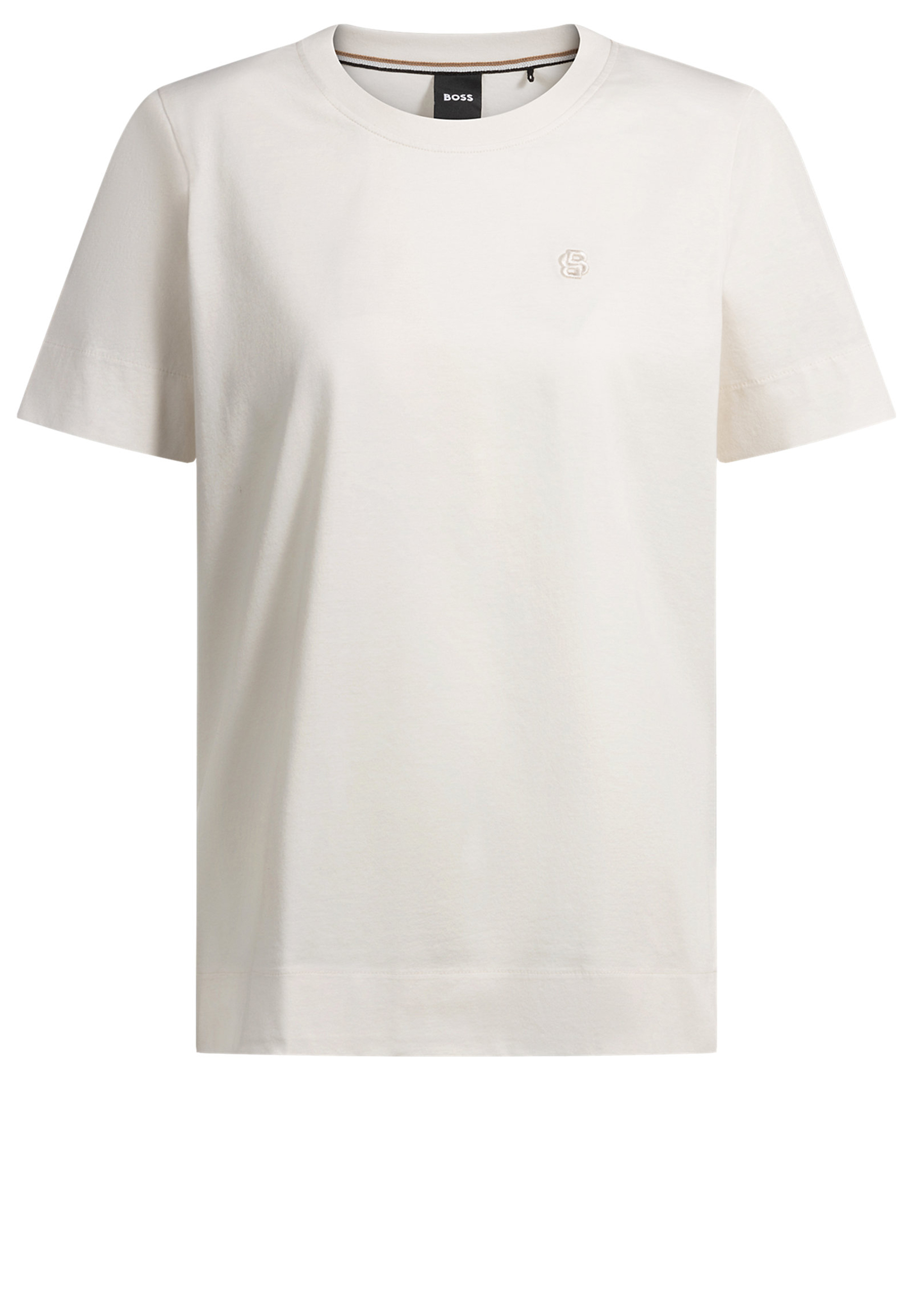 Dieses T-Shirt von BOSS Womenswear ist aus Jersey mit merzerisiertem Finish für zusätzliche Weichheit gefertigt. Doppelte B-Monogrammstickerei und breite Säume werten dieses Stück auf.