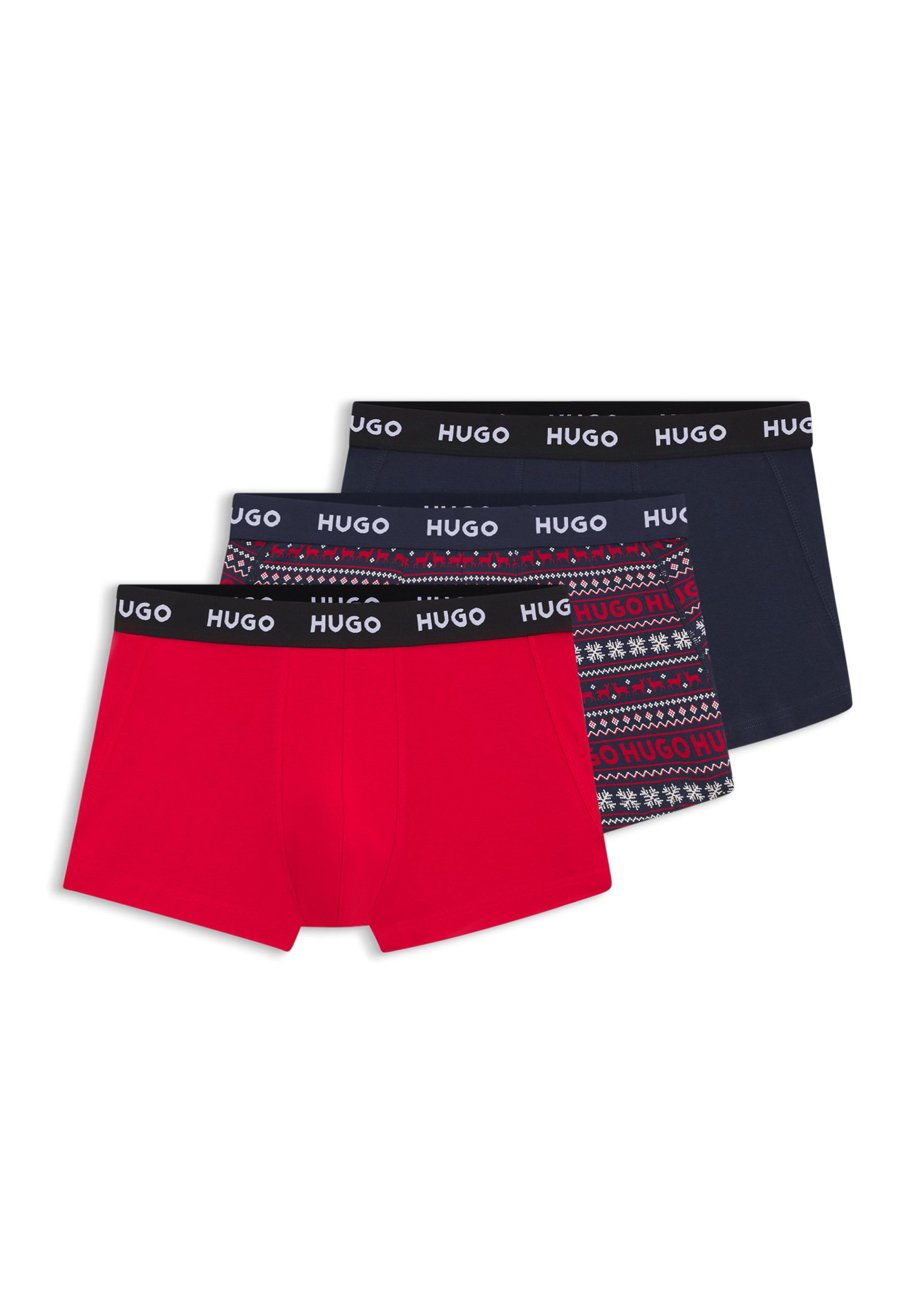 Drei eng anliegende HUGO Boxershorts mit kurzem Bein und mittlerer Bundhöhe. Die Unterhosen aus softer Stretch-Baumwolle sind mit mehreren Logos am Bund versehen.