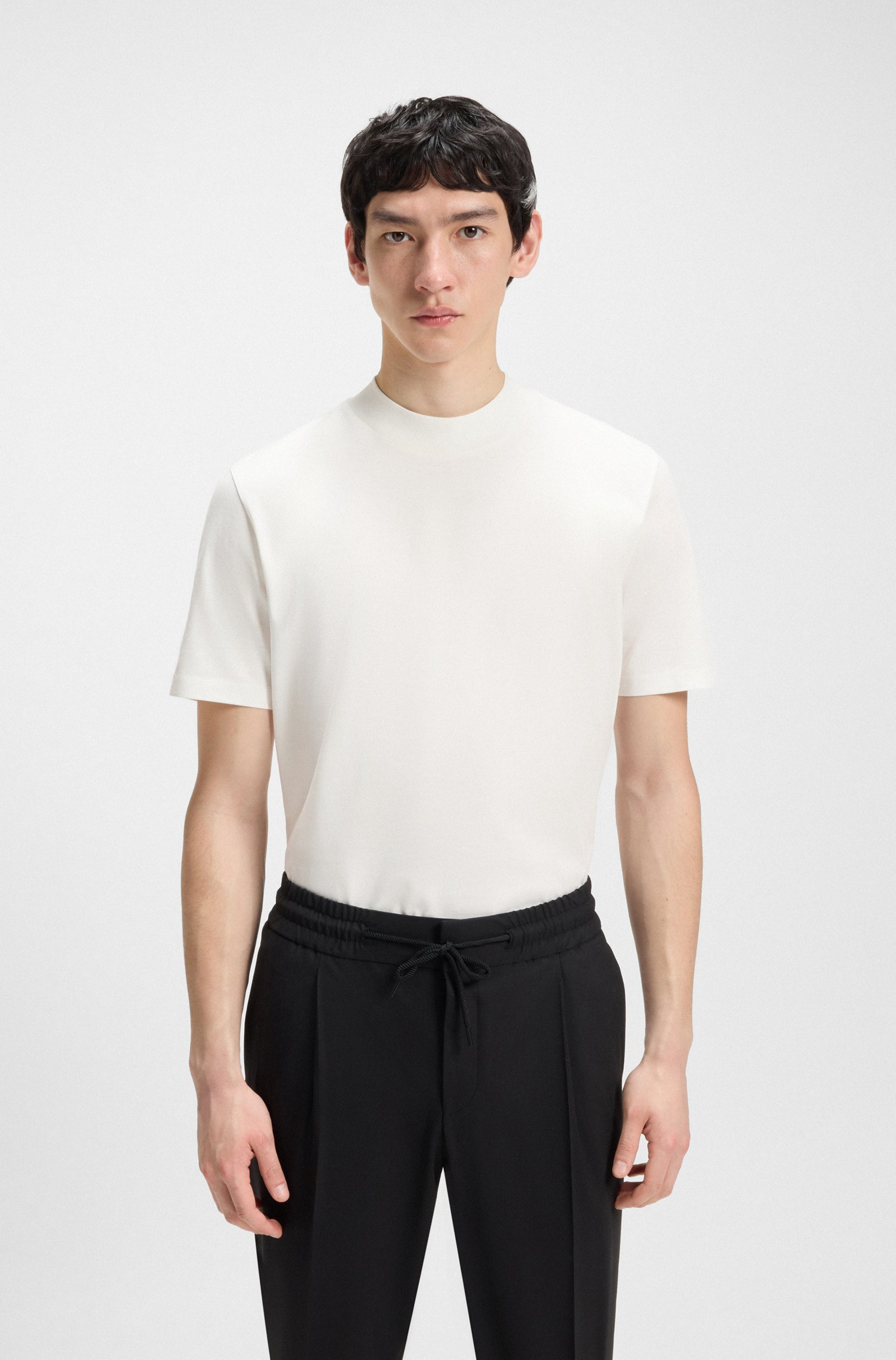 Das schmal geschnittene HUGO T-Shirt mit modernem hohem Kragen lässt sich ideal mit eleganten Tailoring-Layern kombinieren. Aus merzerisierter Stretch-Baumwolle für ein besonders softes Tragegefühl.