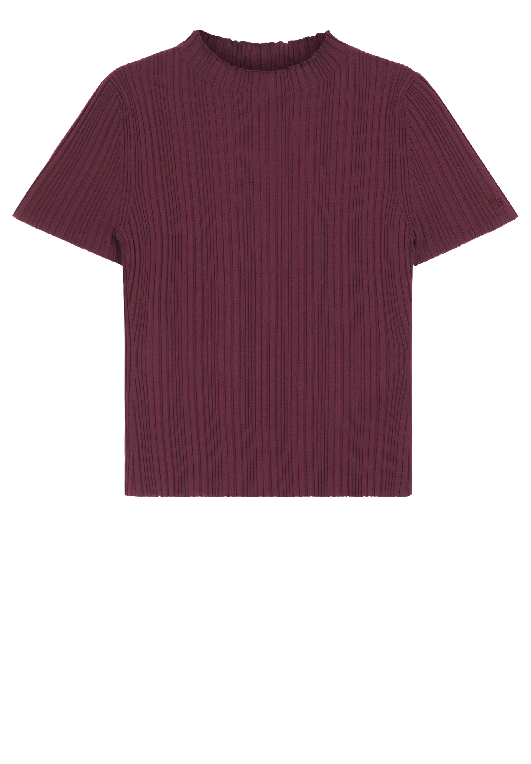 Der unregelmäßig gerippte HUGO Pullover hat einen femininen Stil, der sich leicht kombinieren lässt. Stehkragen mit Volants am Rand. Tonale Logo-Stickerei.
