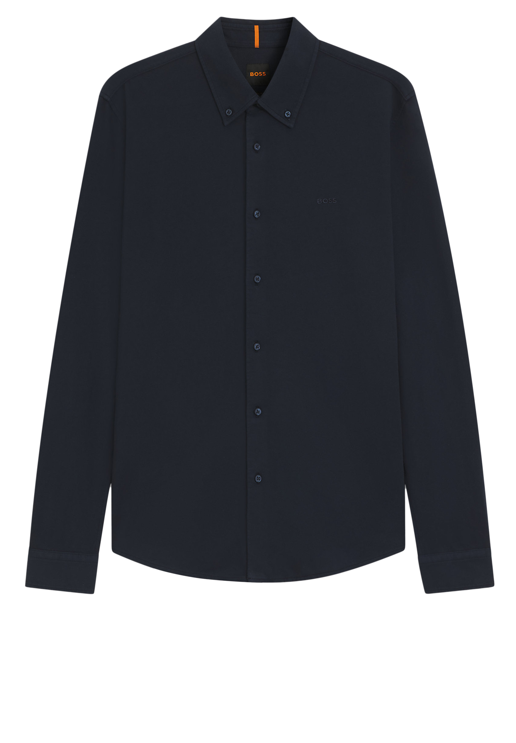 Das schmal geschnittene BOSS Hemd aus besonders softem Baumwoll-Jersey verspricht hohen Tragekomfort. Logo-Stickerei. Button-Down-Kragen.