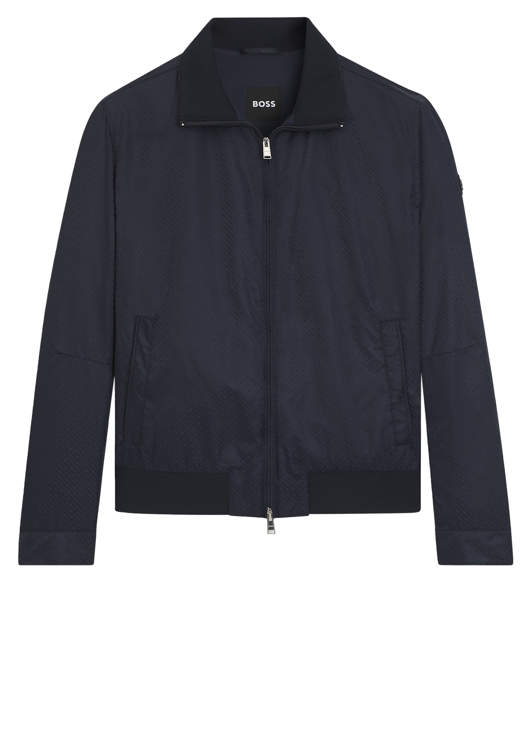 Diese stilvolle Jacke von BOSS Menswear vereint Funktionalität mit modernem Design. Sie ist mit einem edlen Mikro-Monogramm-Jacquard versehen und bietet zuverlässigen Regenschutz. Gerippte Abschlüsse und ein markanter Doppel-B-Monogramm-Besatz unterstreichen den sportlich-eleganten Look. Hergestellt aus recyceltem Polyamid besteht die Jacke zu mindestens 60 % aus nachhaltigeren Materialien – für ein verantwortungsbewusstes Fashion-Statement.