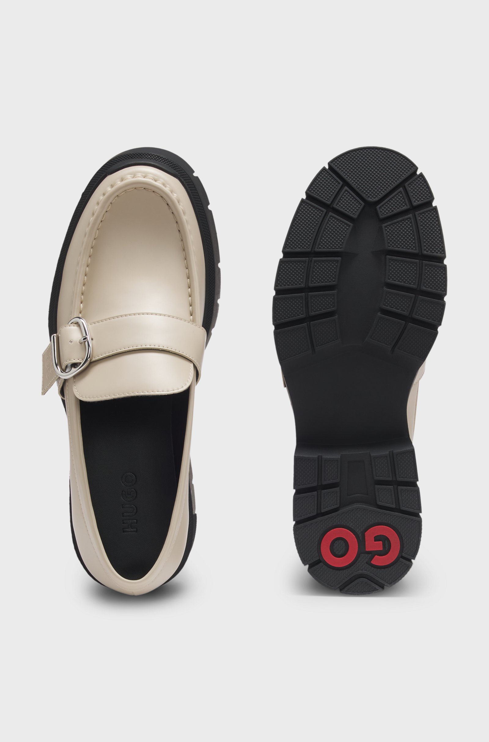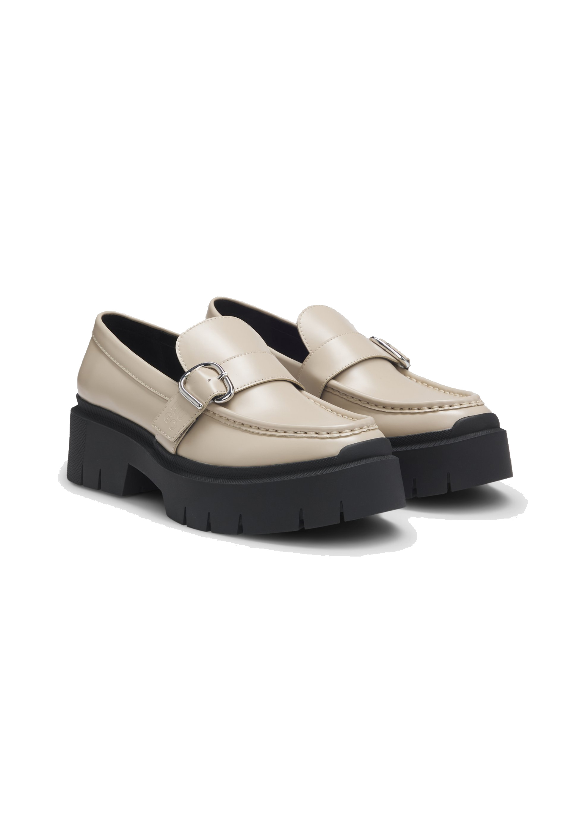 Mit einer kreativen Schnalle am Logo-Riemen zeichnen sich diese HUGO Damen-Loafer durch eine auffällige Silhouette aus. Poliertes Leder. Robuste Gummilaufsohle. 3,5 cm Absatz.