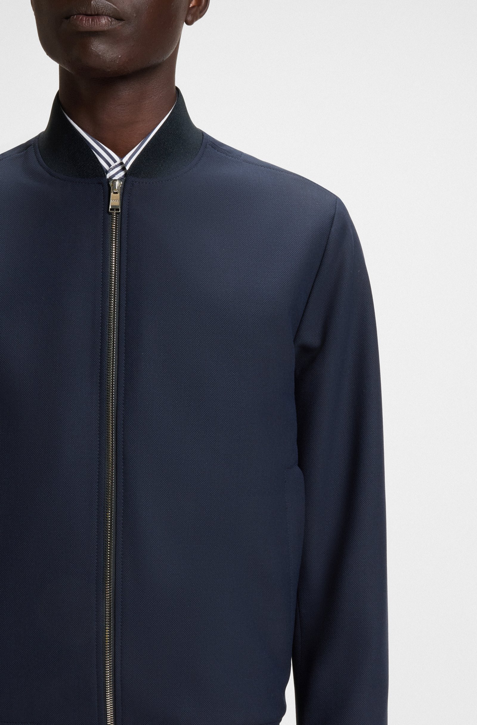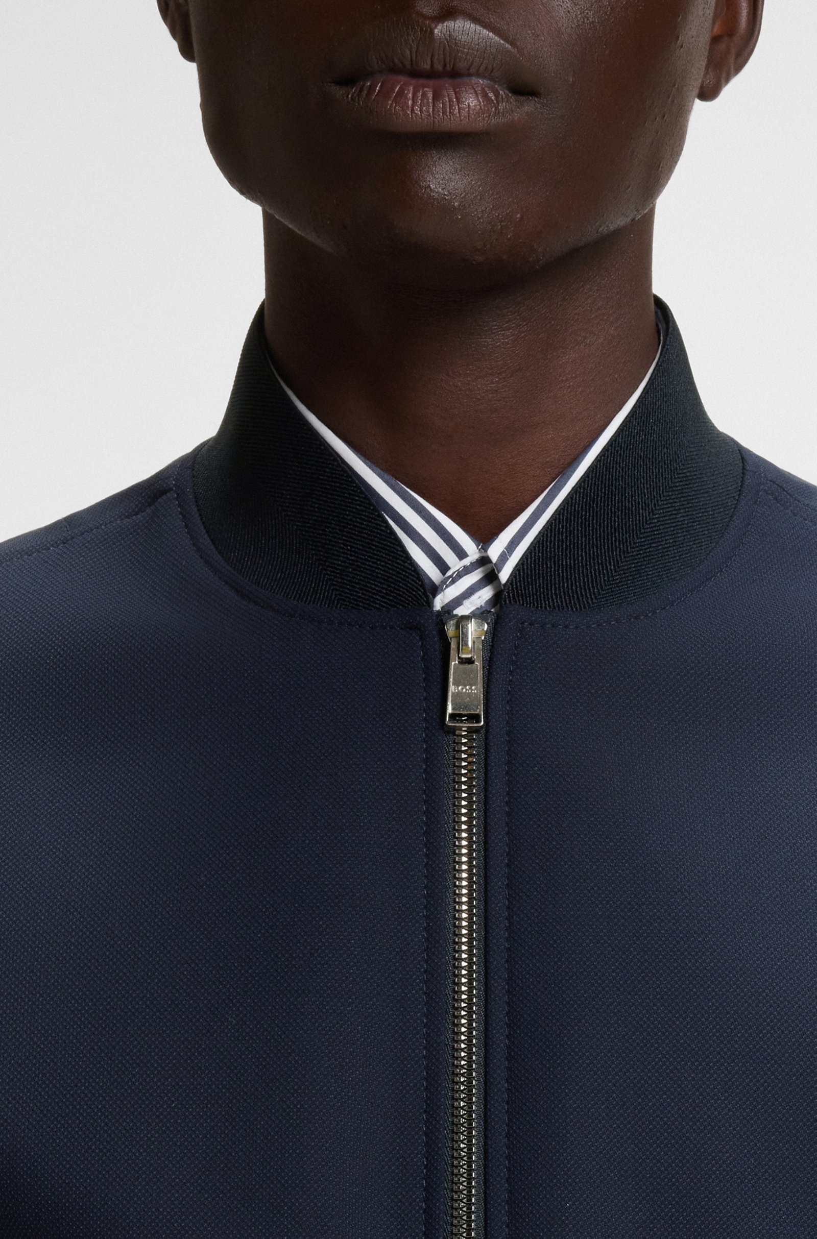 Die schmal geschnittene BOSS Jacke im Blouson-Stil ist mit einem Zwei-Wege-Reißverschluss versehen. Waschmaschinenfestes Gewebe mit Woll- und Elasthan-Anteil. Dezentes Muster.