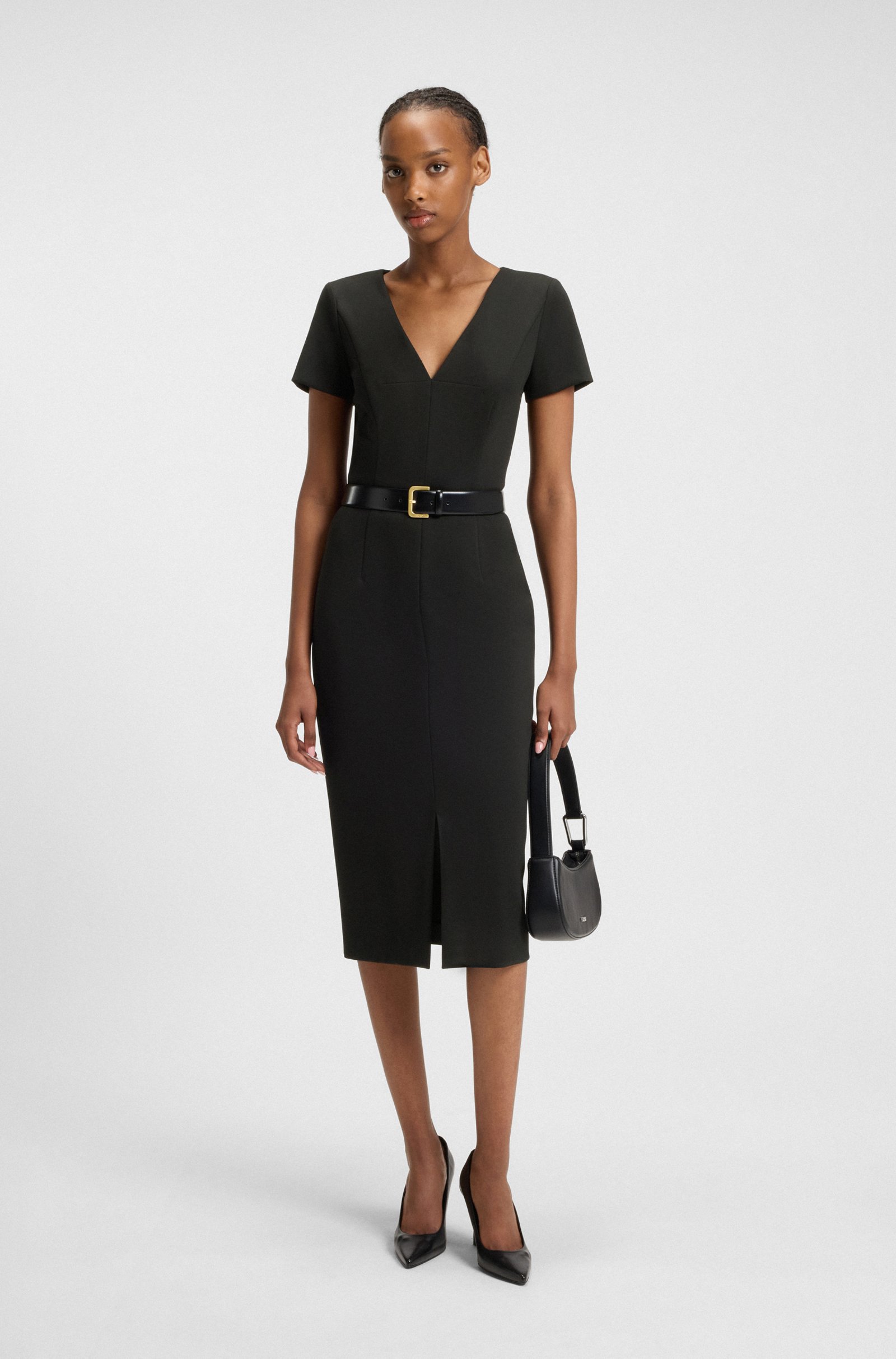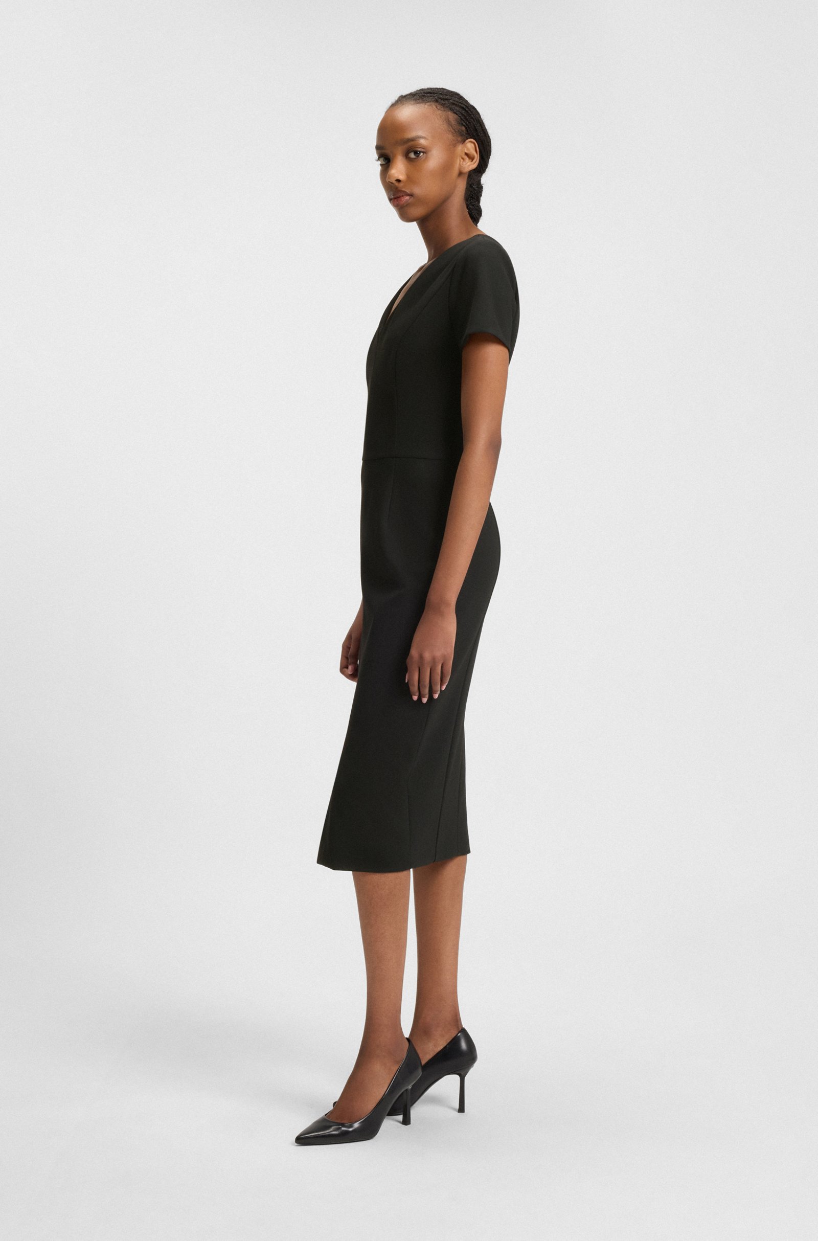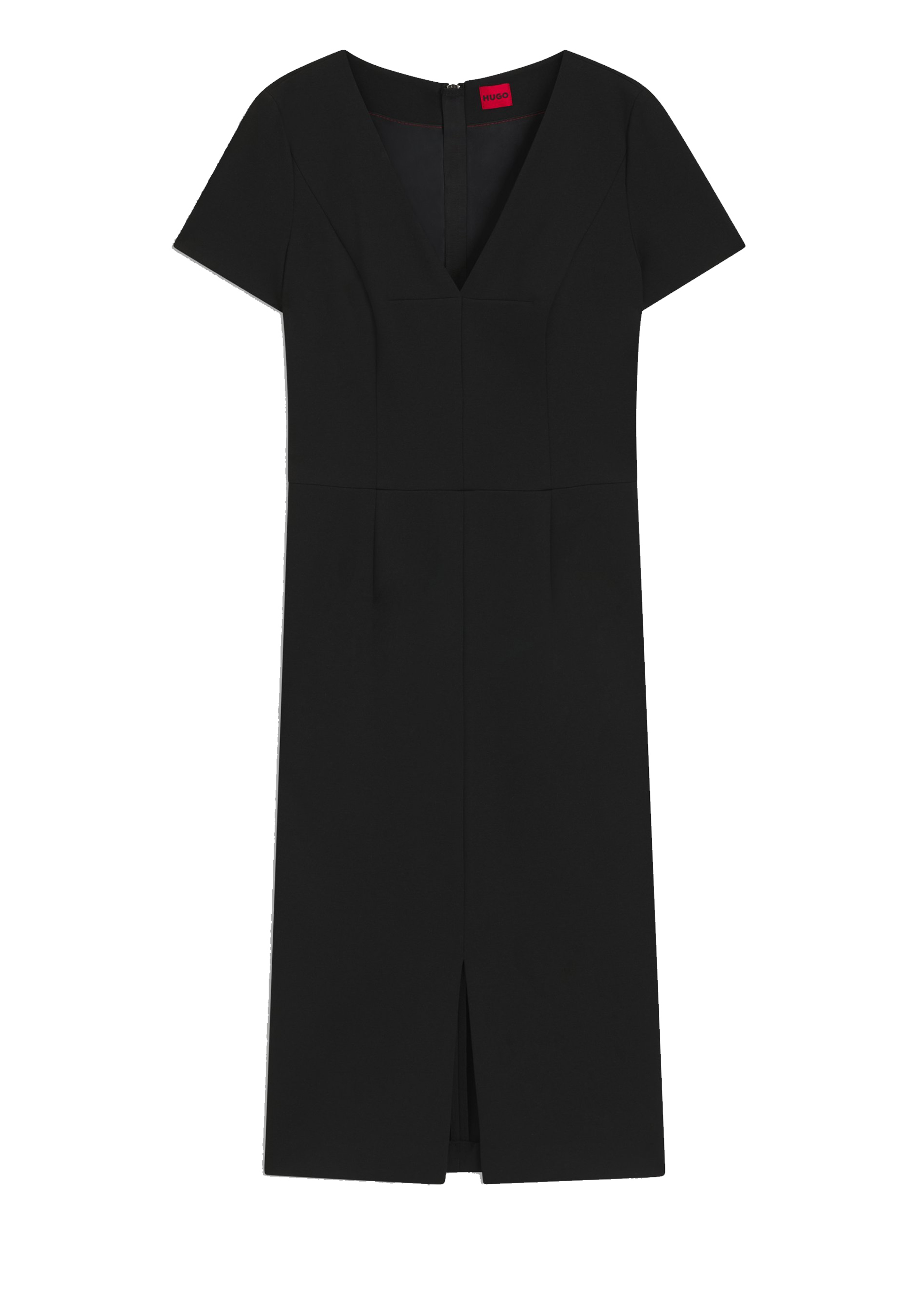 HUGO Midikleid aus Stretch-Gewebe. Der figurbetonte Style mit V-Ausschnitt hat ein glattes, bequemes Innenfutter.