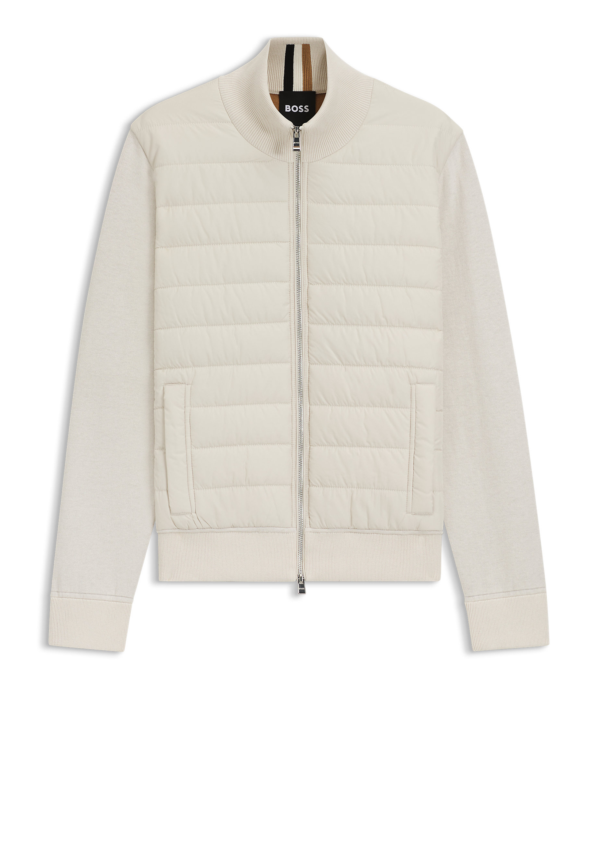 Wärmende BOSS Jacke, die sich ideal für Layering-Looks eignet. Aus einem weichen Baumwoll-Mix mit Woll-Anteil und kontrastierender wattierter Vorderseite. Kuschelige Rippstrick-Details.