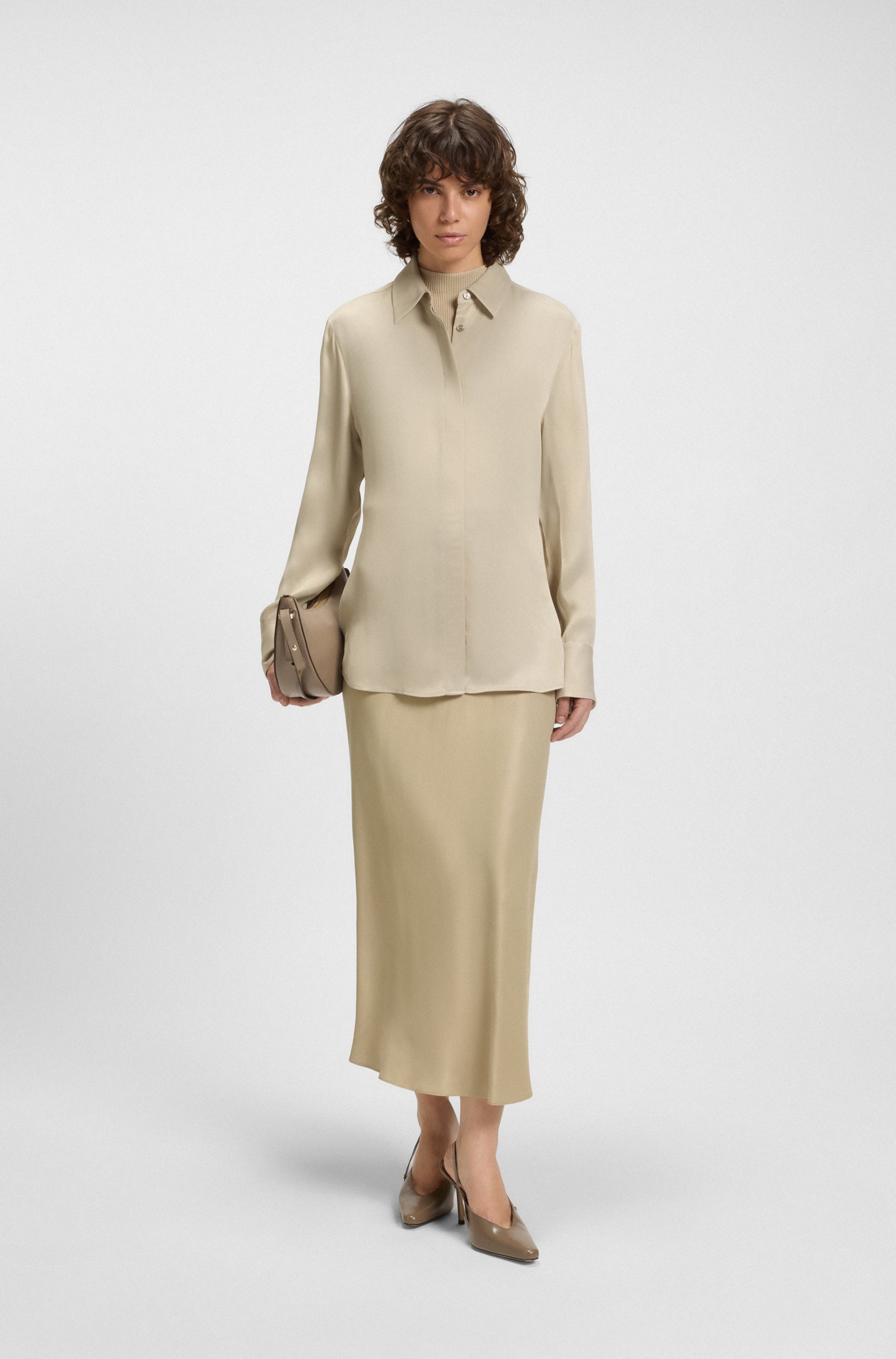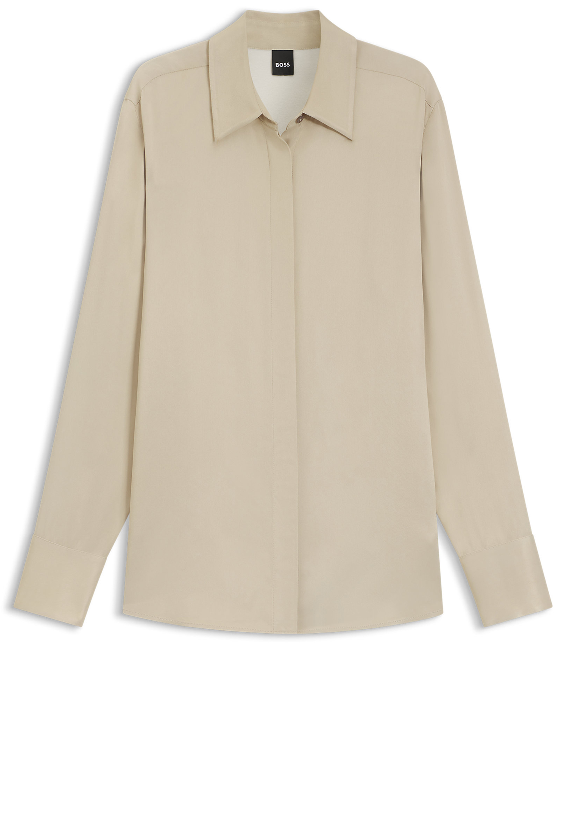 Die BOSS Bluse aus fließendem Satin mit softem Finish und elegantem Schimmer ist eine zeitgemäße Wahl. Cleaner verdeckter Verschluss. Zeitlose gerade Passform.